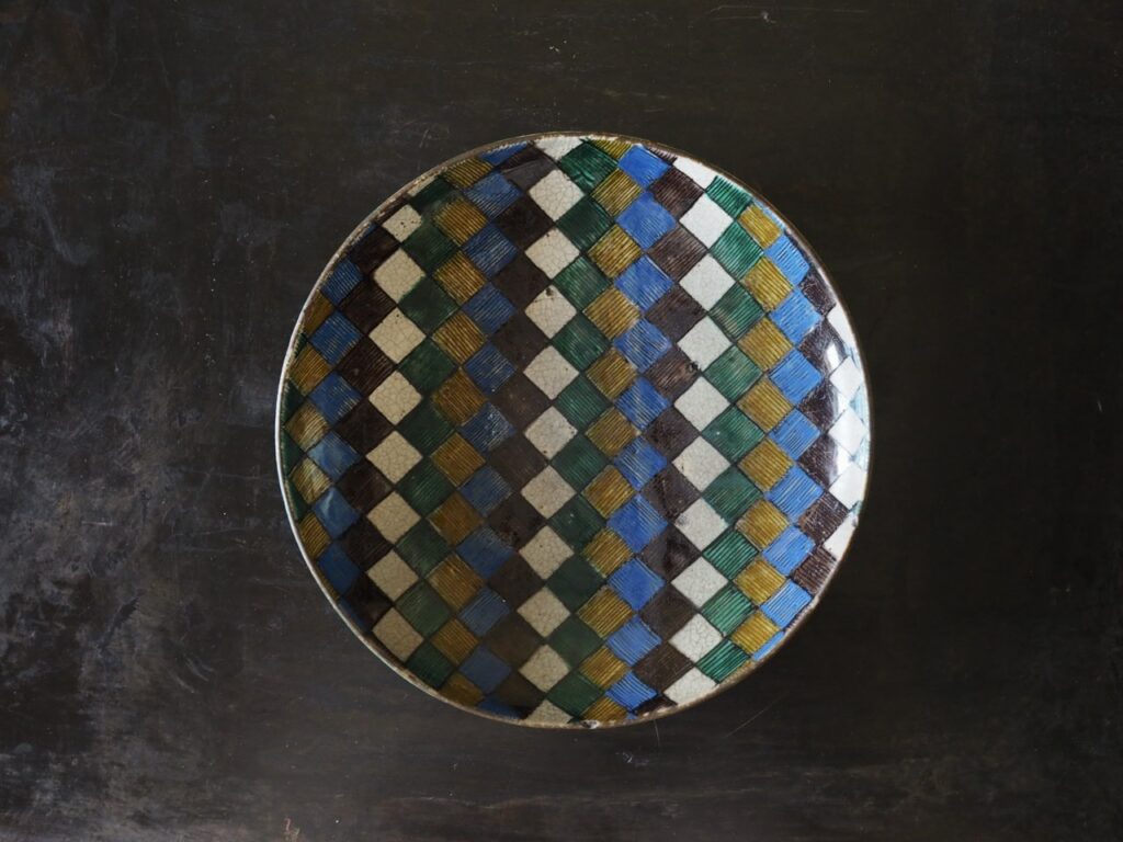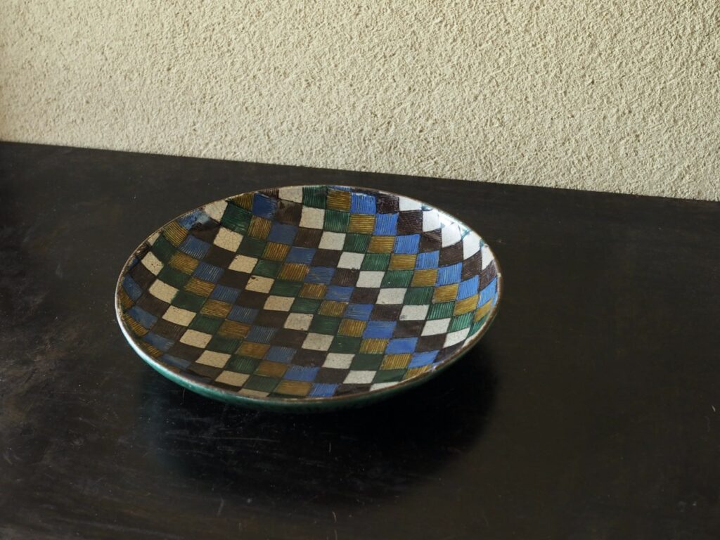 市松文あるいは石畳文と呼ばれる大変洒落た復興九谷焼の平鉢で、緑、黄、紫、青そして