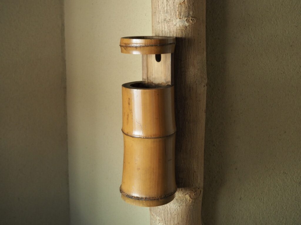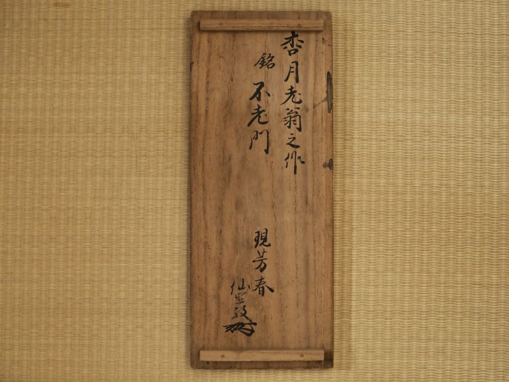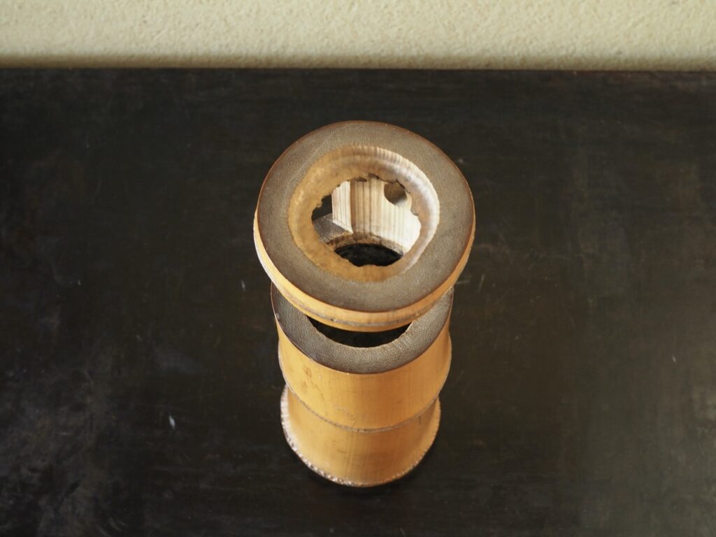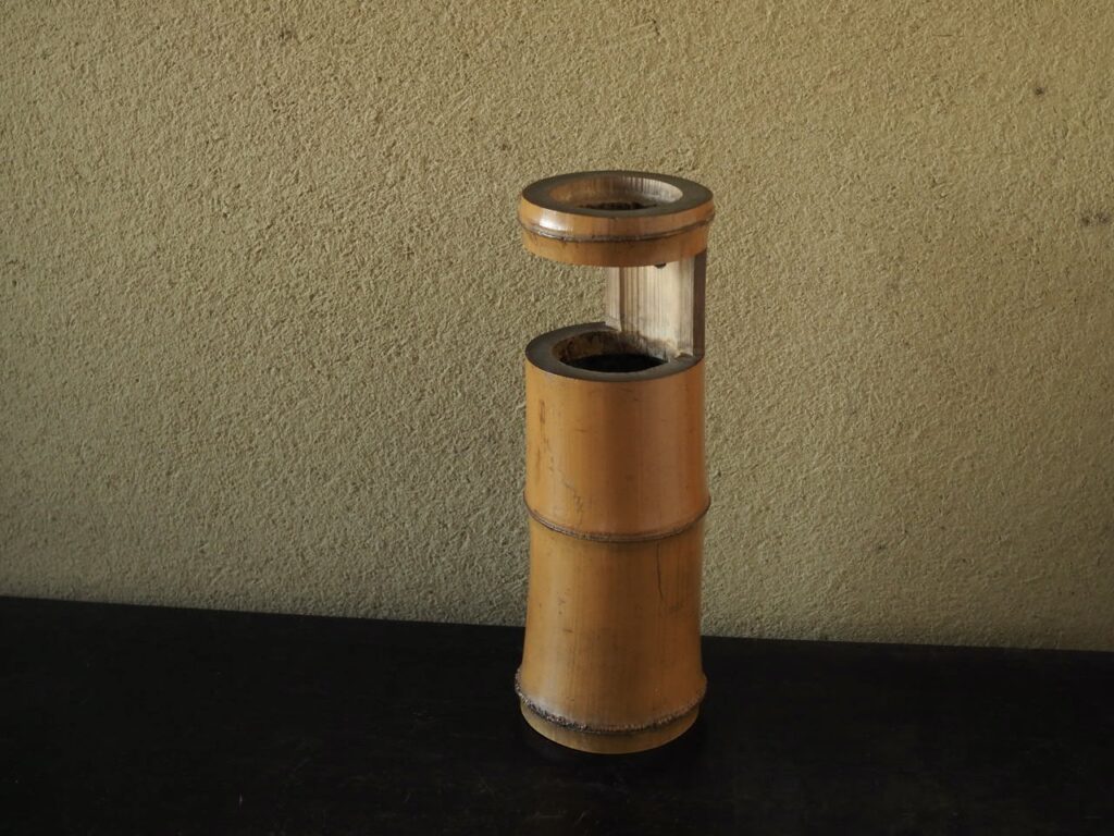 自作の竹花入です。程良く枯れた色合いと時代の照りに「不老門」という銘の通り、枯れの中にも