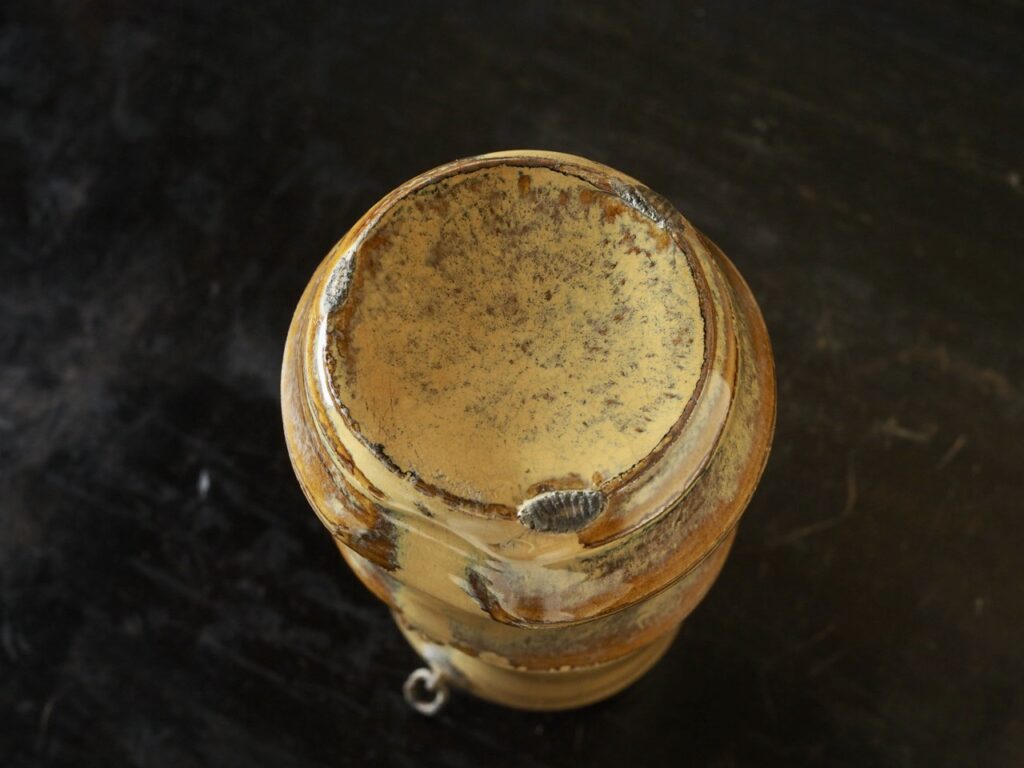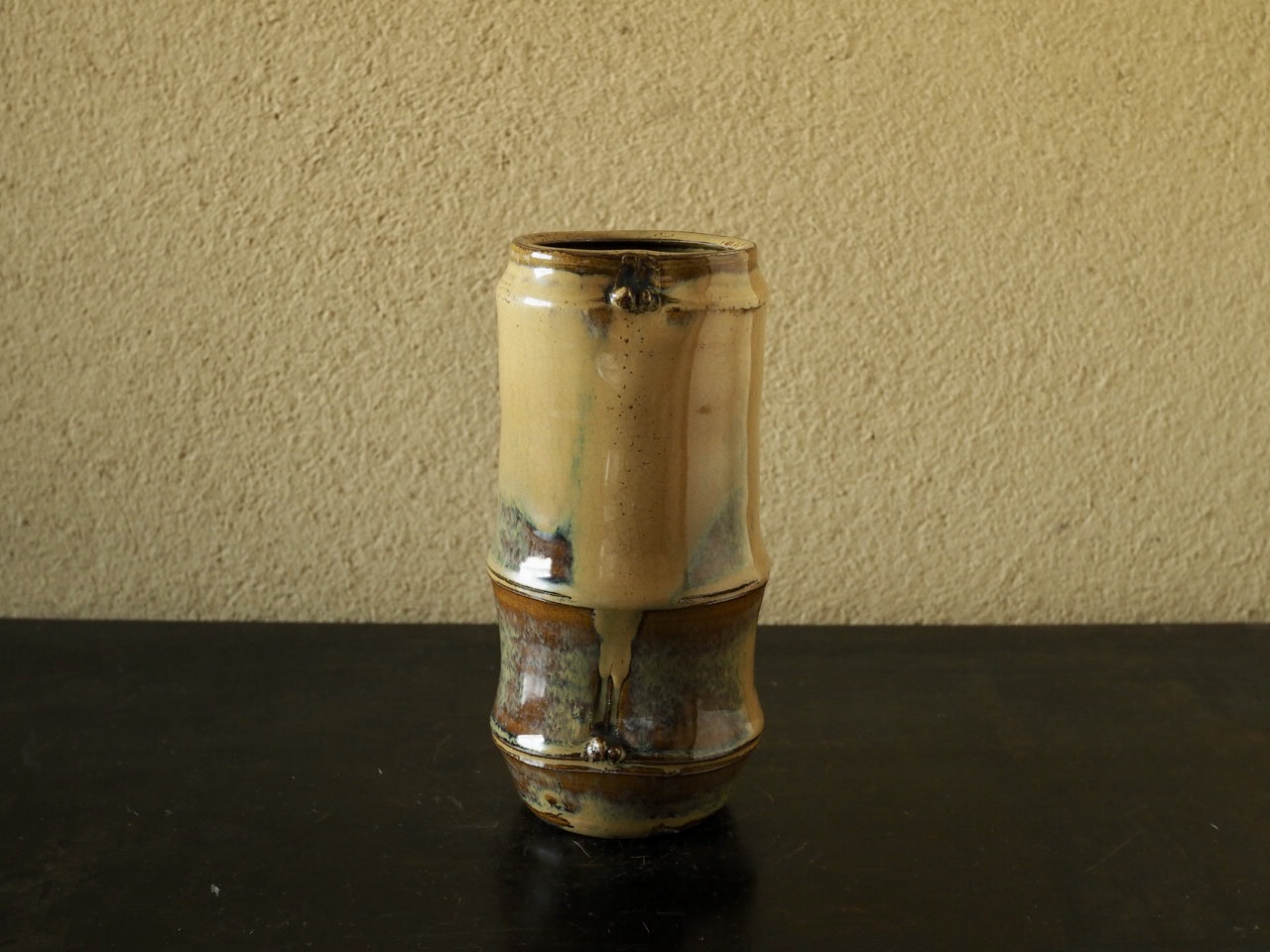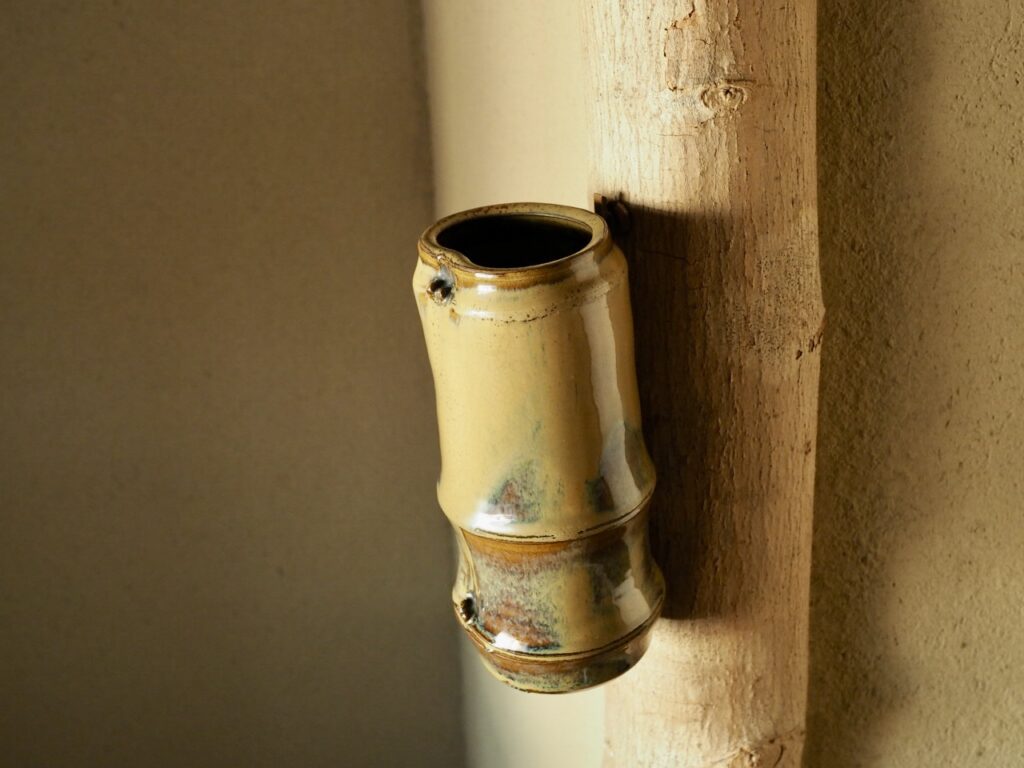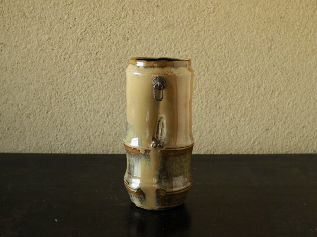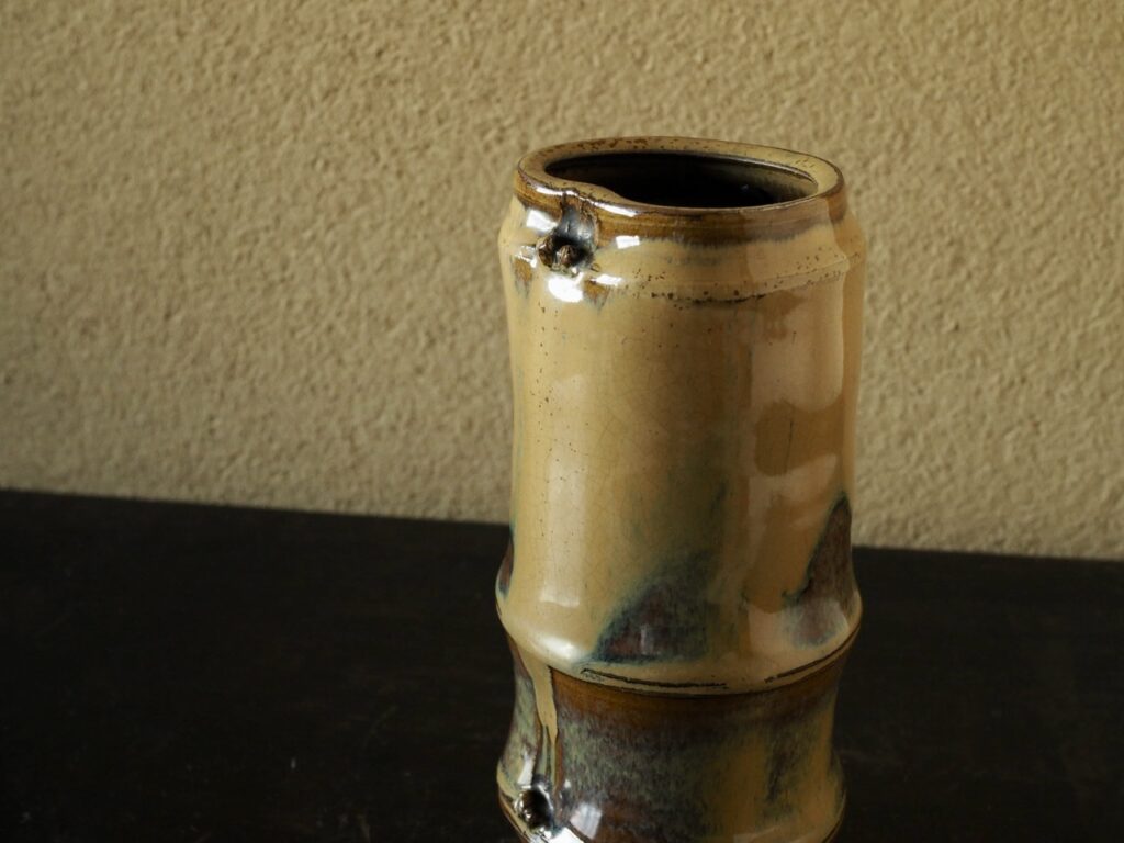 竹を模した繊細な造形に、褐釉と藁灰釉の二重掛けによって現れる黄色の窯変と青い斑が