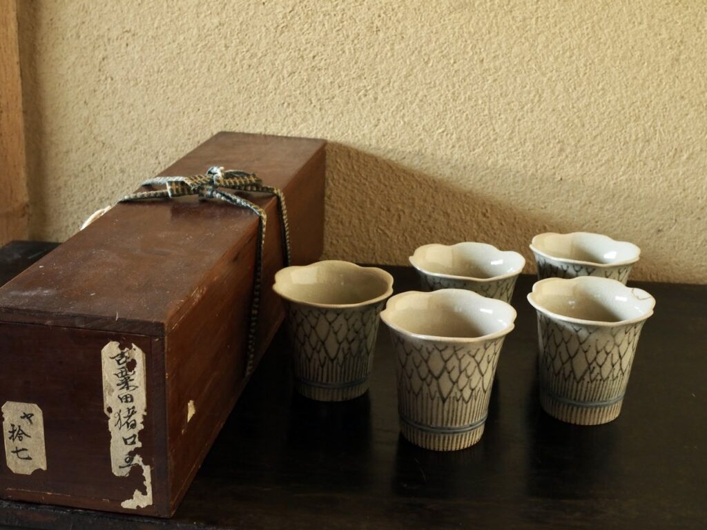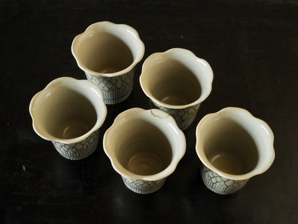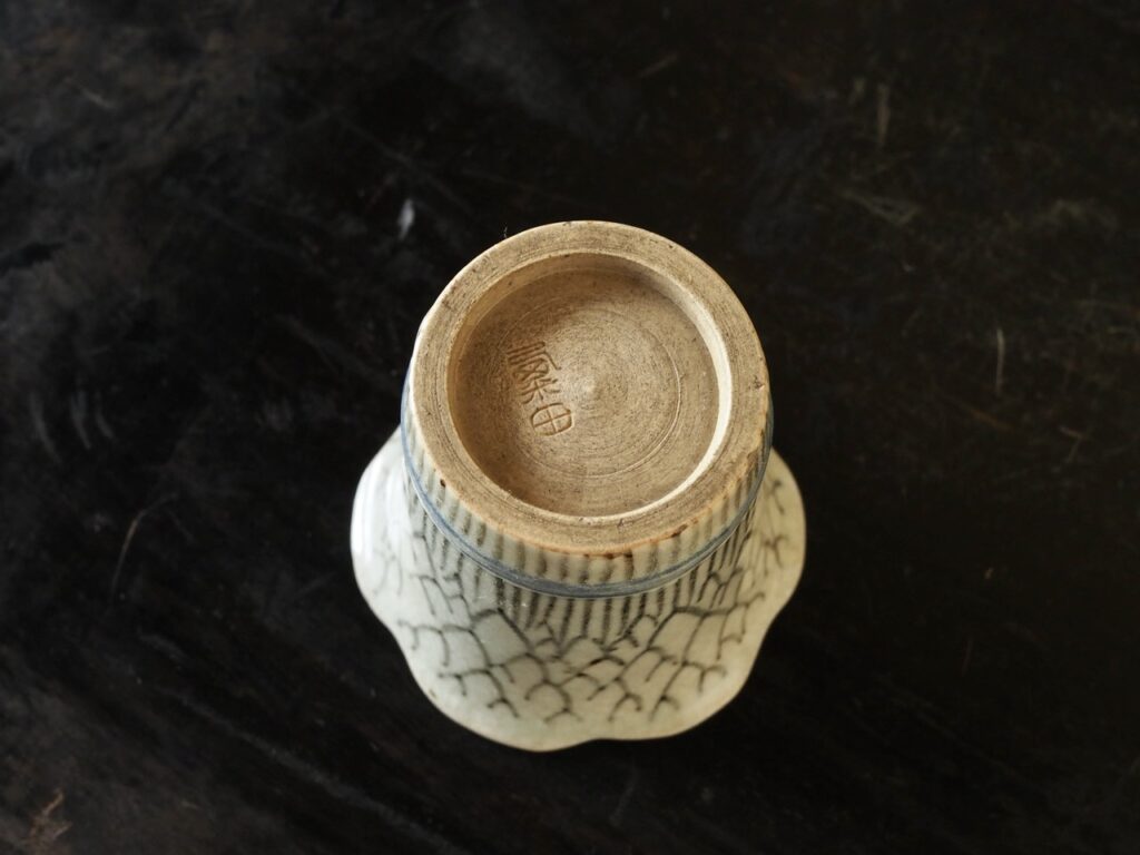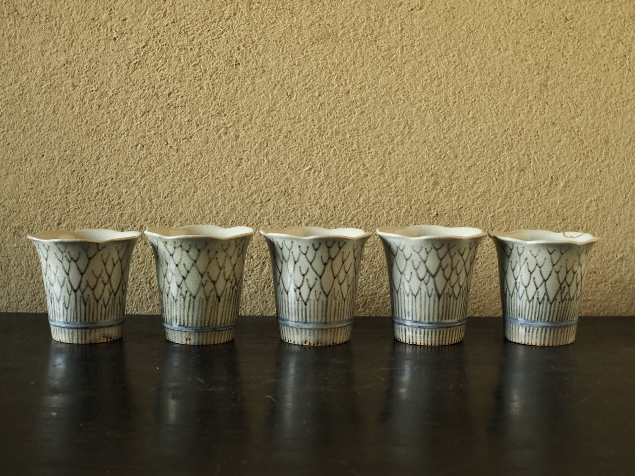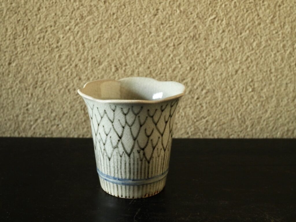 輪花になった口縁や筒形のシルエットが洒落ています。錆絵染付で冬支度を意味する