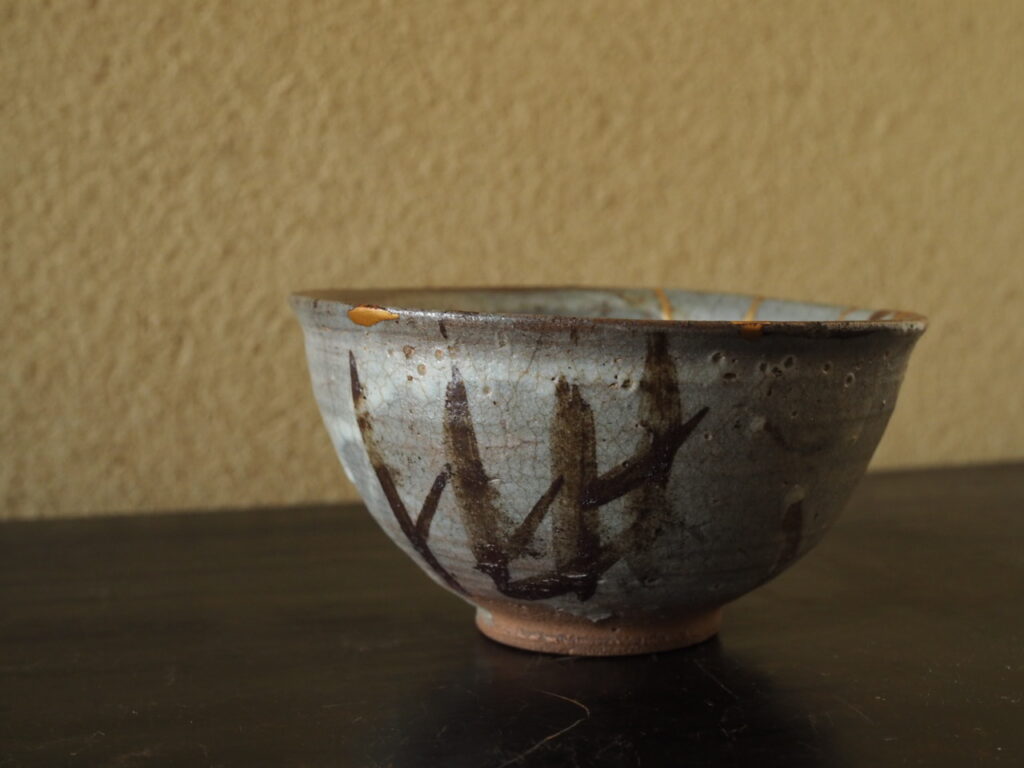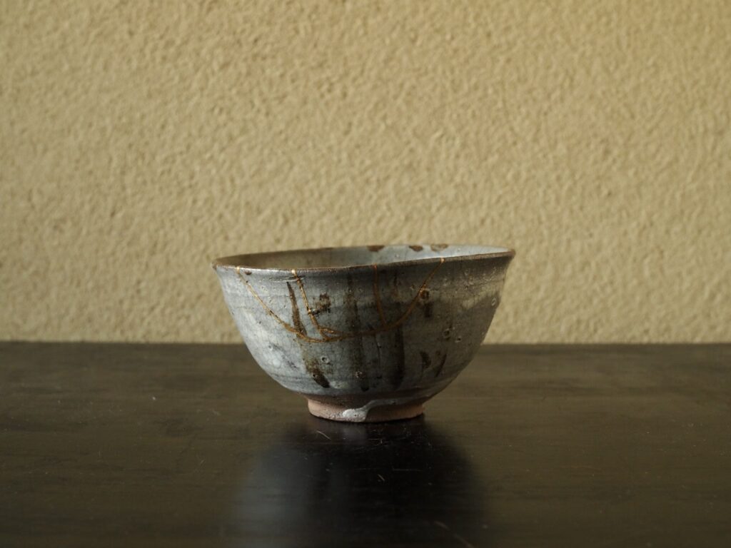 勢いのある筆と白濁混じりの灰色の釉薬が絵唐津らしい妙味を発揮しています。呼継ぎは