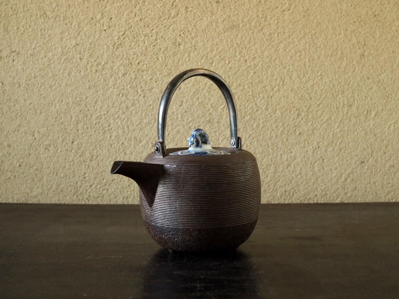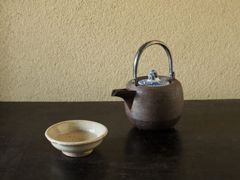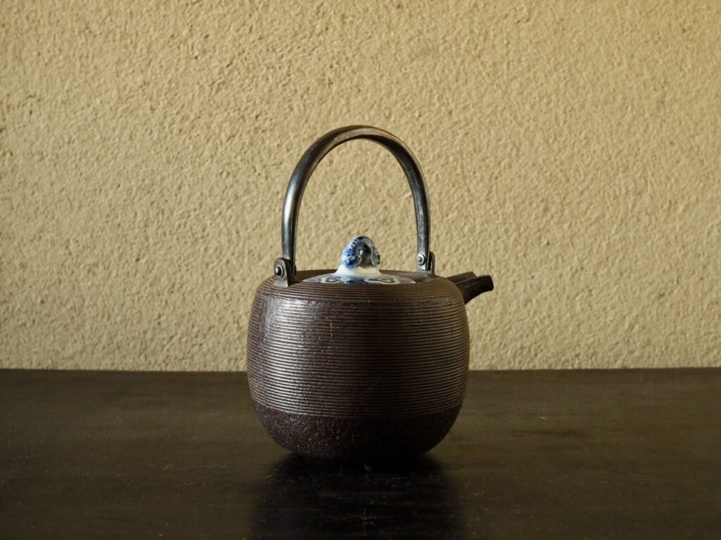 品の良い鉄の地肌と染付の爽やかさに茶味を感じる酒の器です。状態良好 塗替蓋付 容量400ml