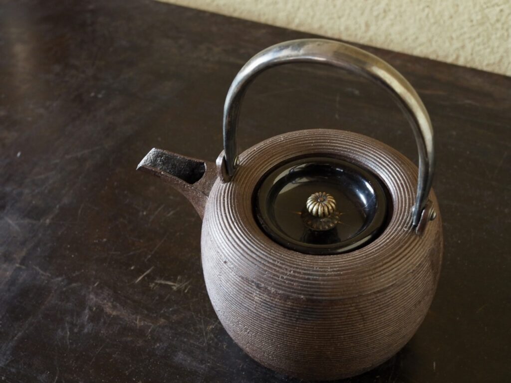 スッキリとした鉄製の銚子で、全体を覆う糸目文様の上品さが大変心地よいです。銀製の取手に