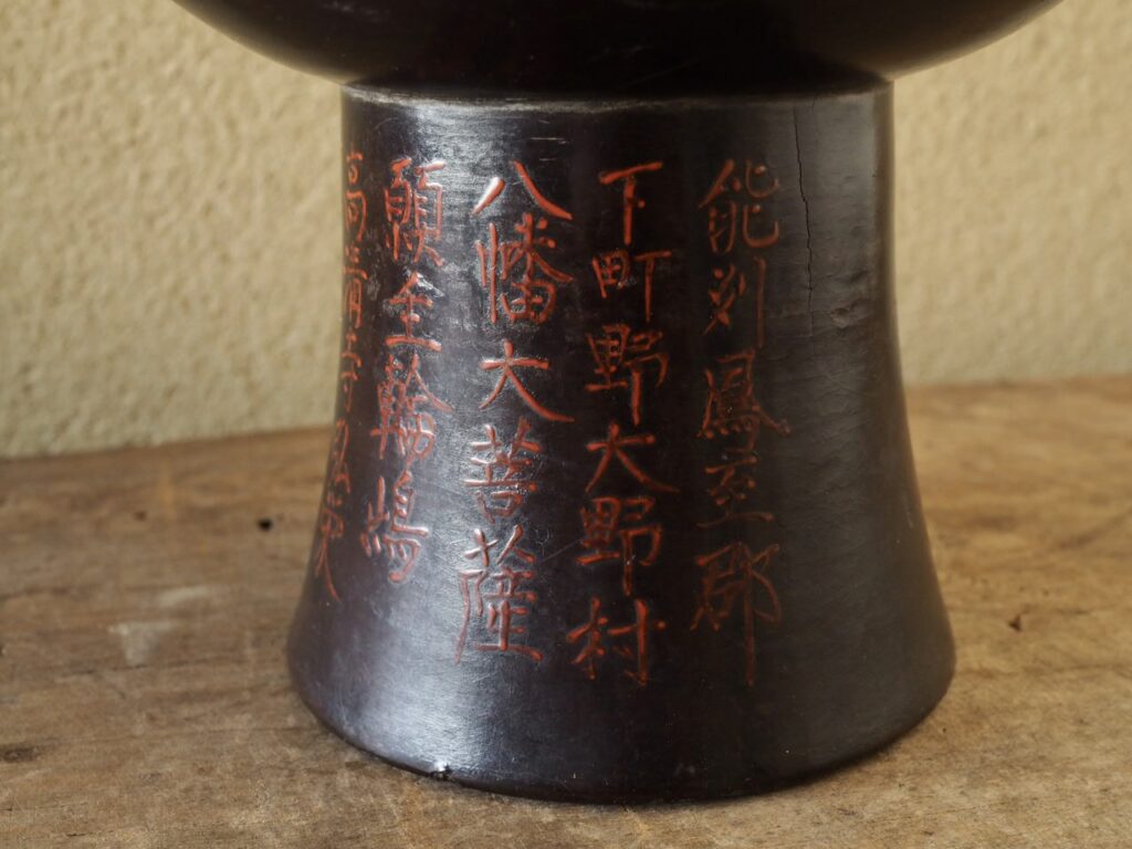 高脚部分に「能州鳳至郡(ふげしぐん)下町野大野村八幡大菩薩 願主輪島高清寺弘栄謹白