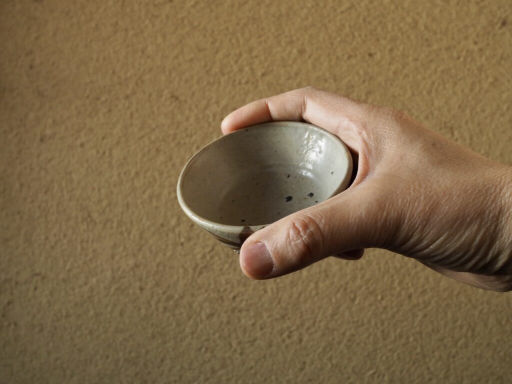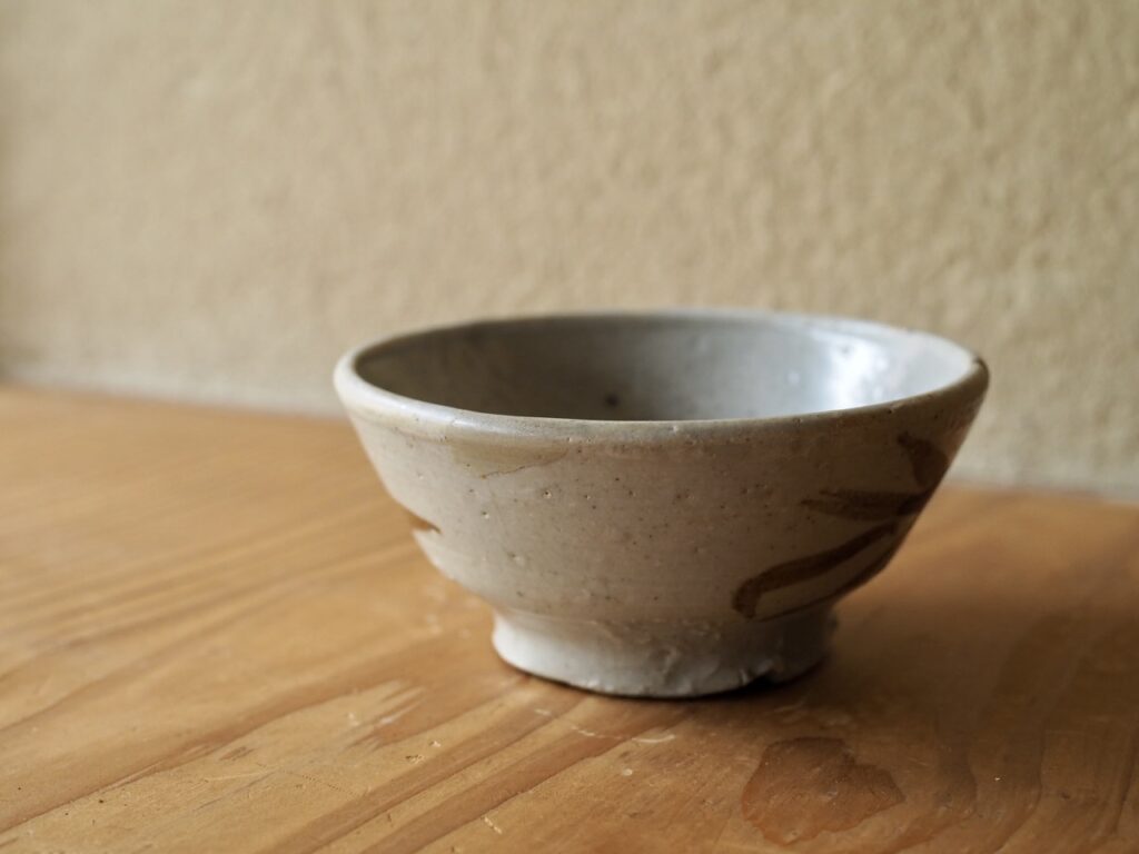 手におさまりの良いサイズの井戸形盃で、明るい灰白色の肌にチョコレート色の草花文が