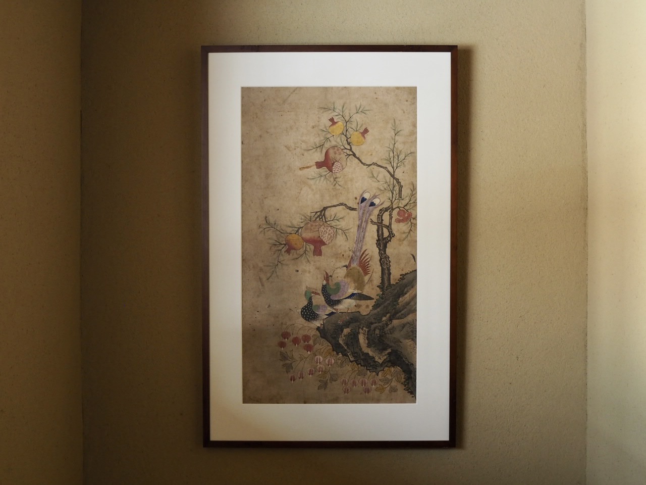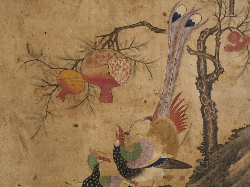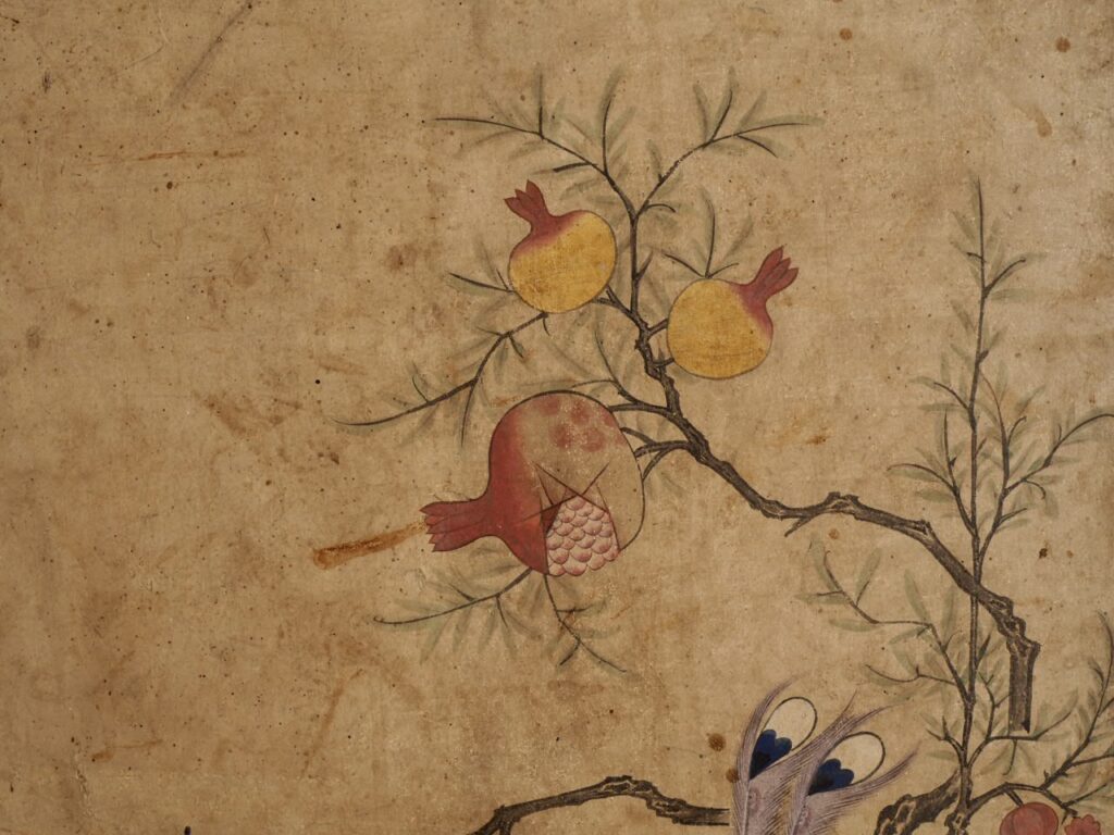 岩の上に力強くのびた柘榴はたわわに実り、その根元には仲睦まじい極彩色の鳥と華鬘草が