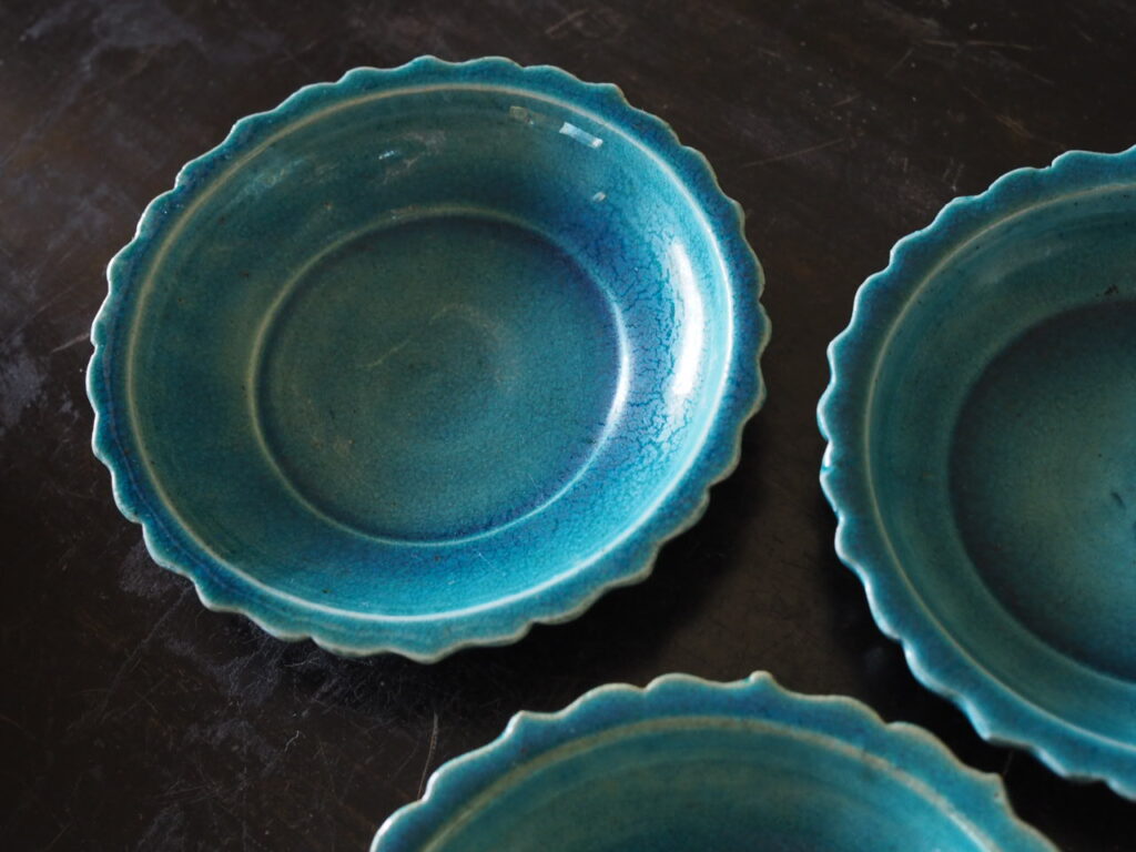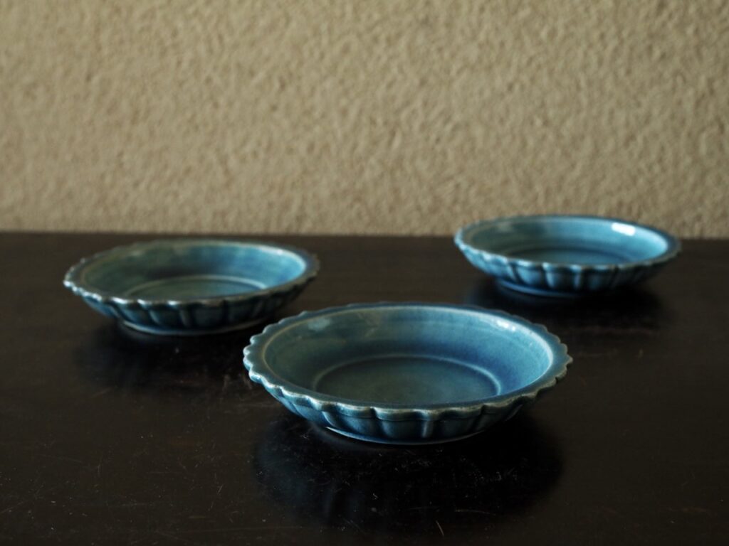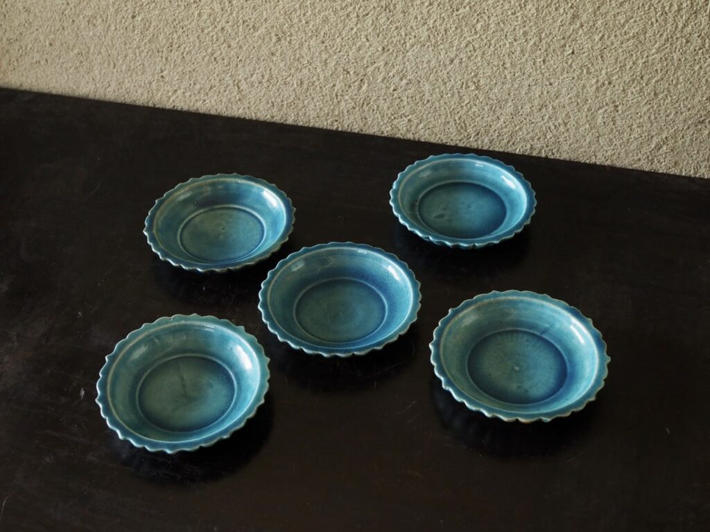 稜花形に爽やかな青が目に嬉しいです。古くから香合と共に茶人達の目を楽しませた色鮮やかな