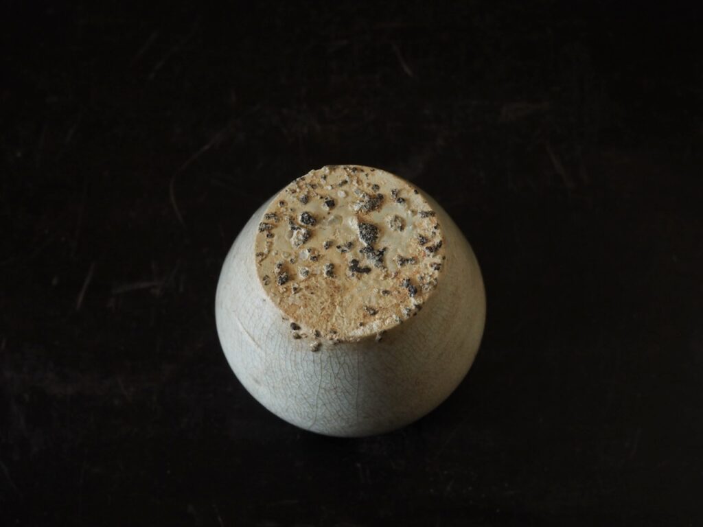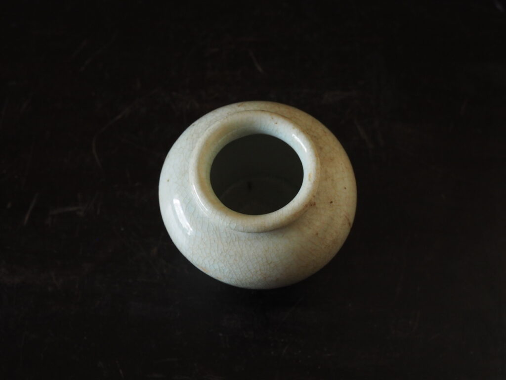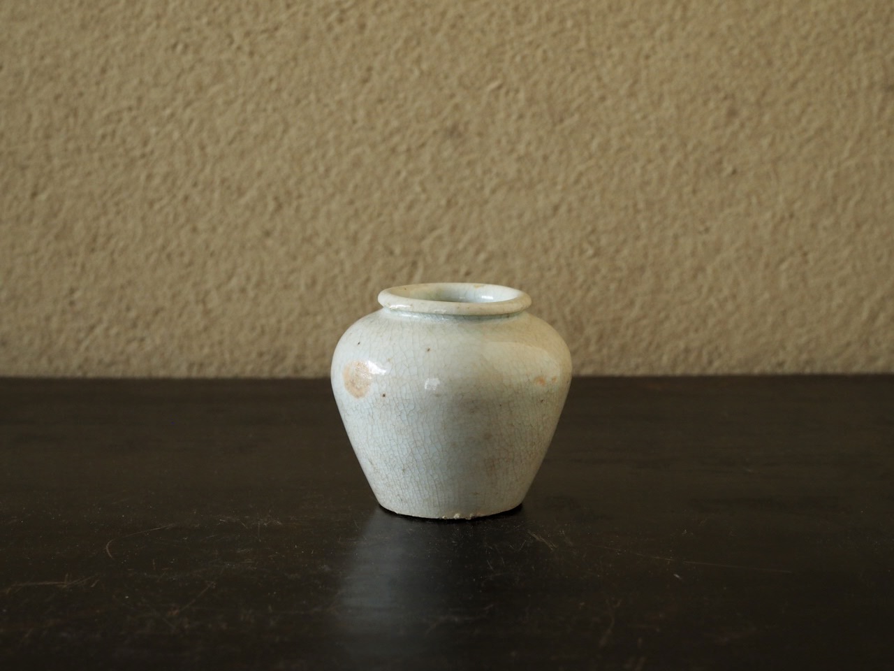 李朝初期の明器小壺ですが、焼成が甘く全体的に貫入が見られる軟らかい肌合いで、色もいつもの