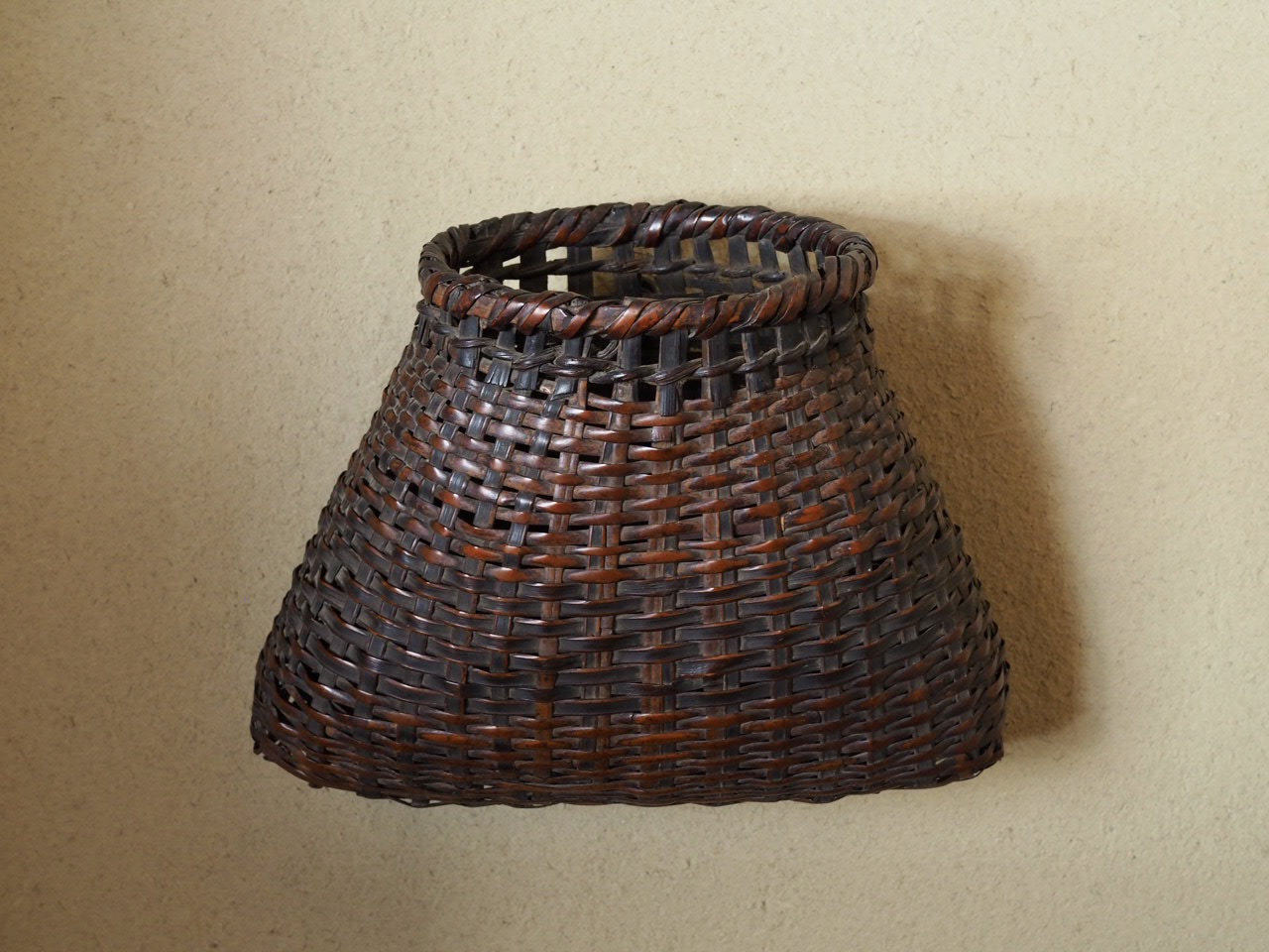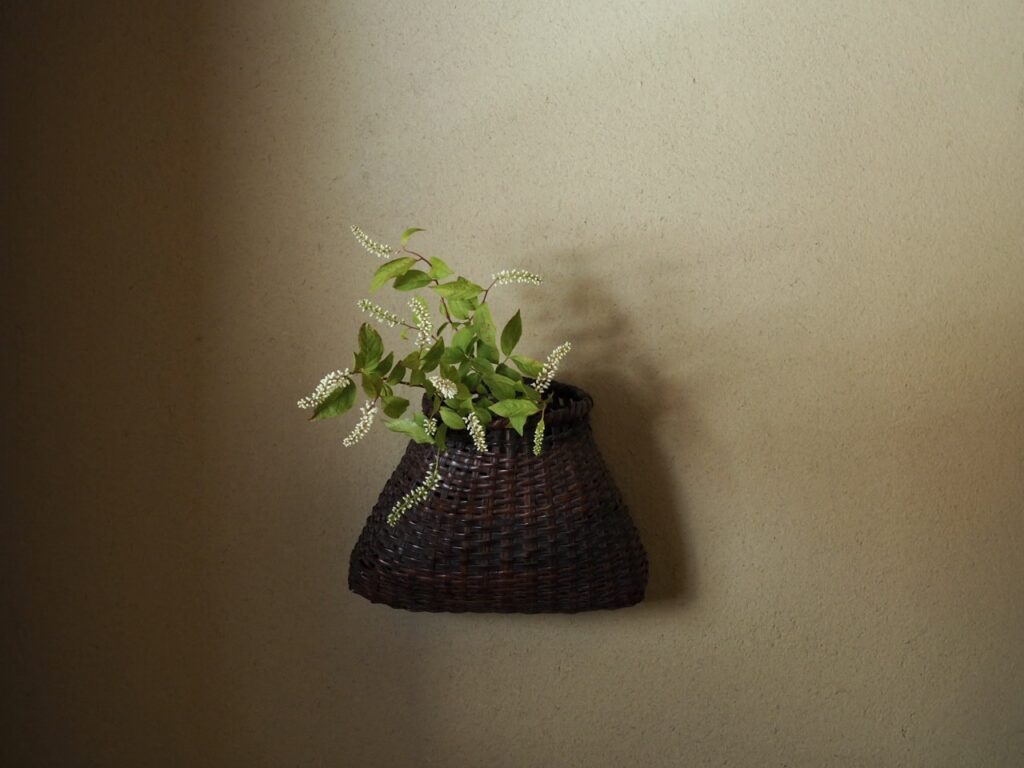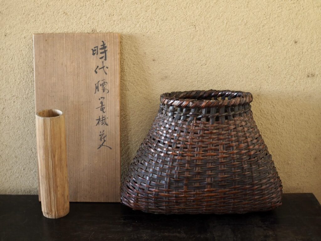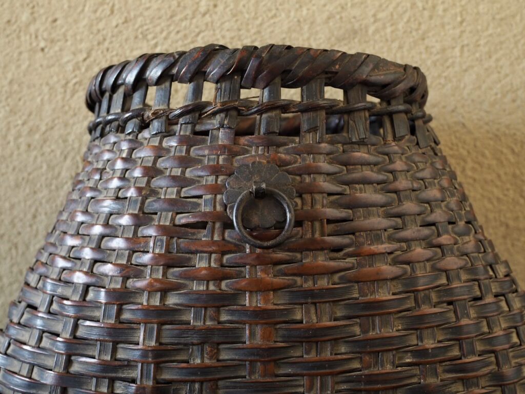 大型の竹製籠花入で、実際に腰に掛けて使用していた魚籠のようなものだったのでしょうか、