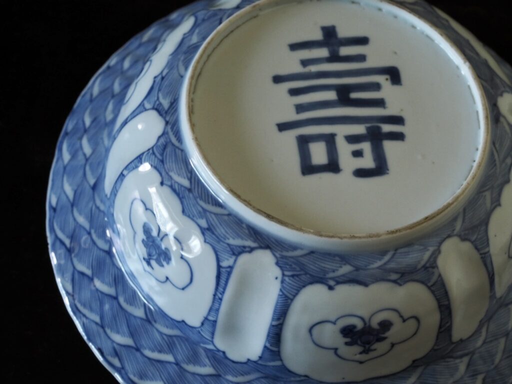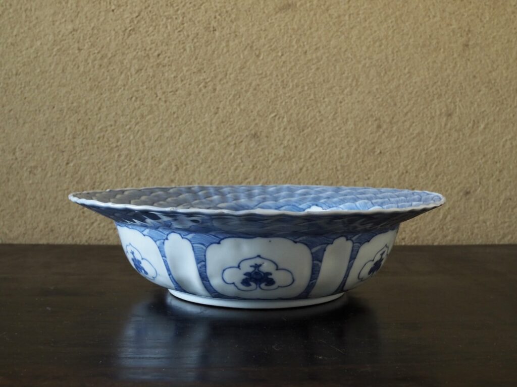 芙蓉手でお馴染みの型打ち成形による薄手の兜鉢で、背景を青海波で埋め、見込みと
