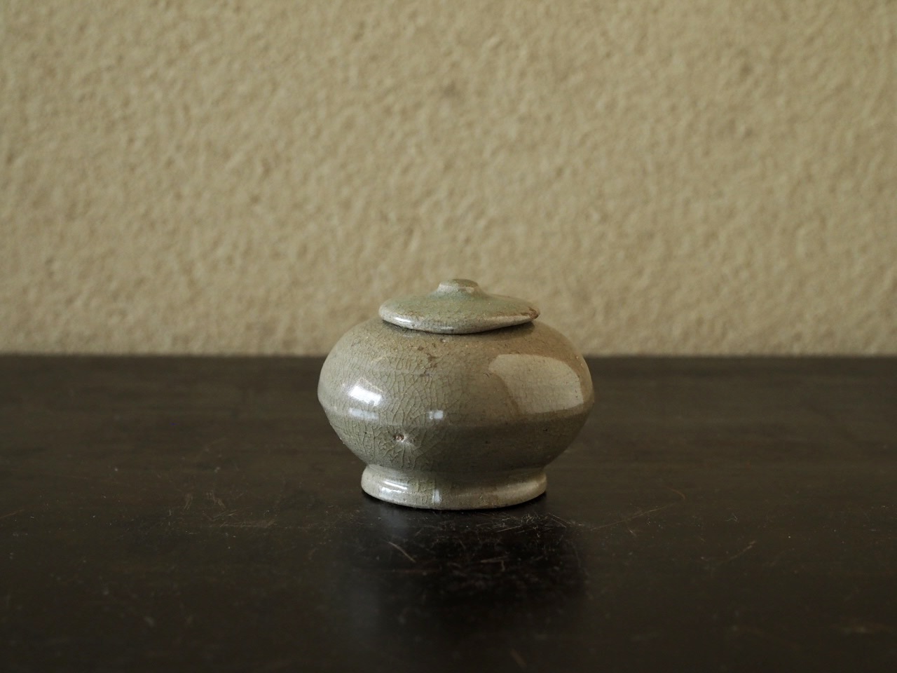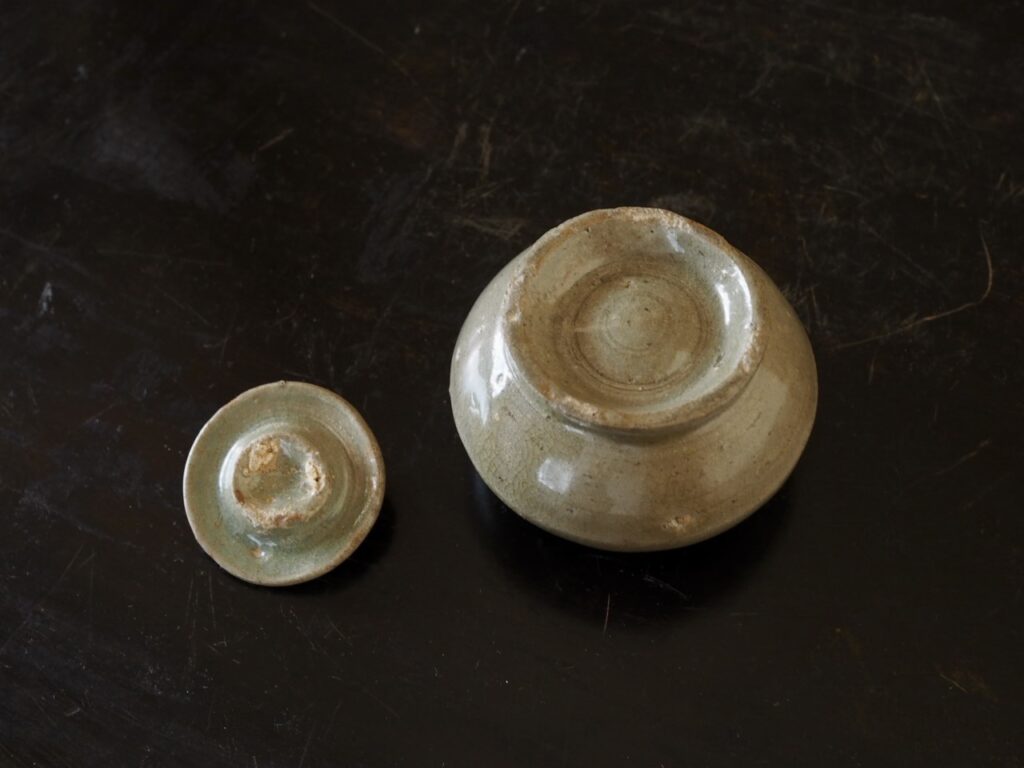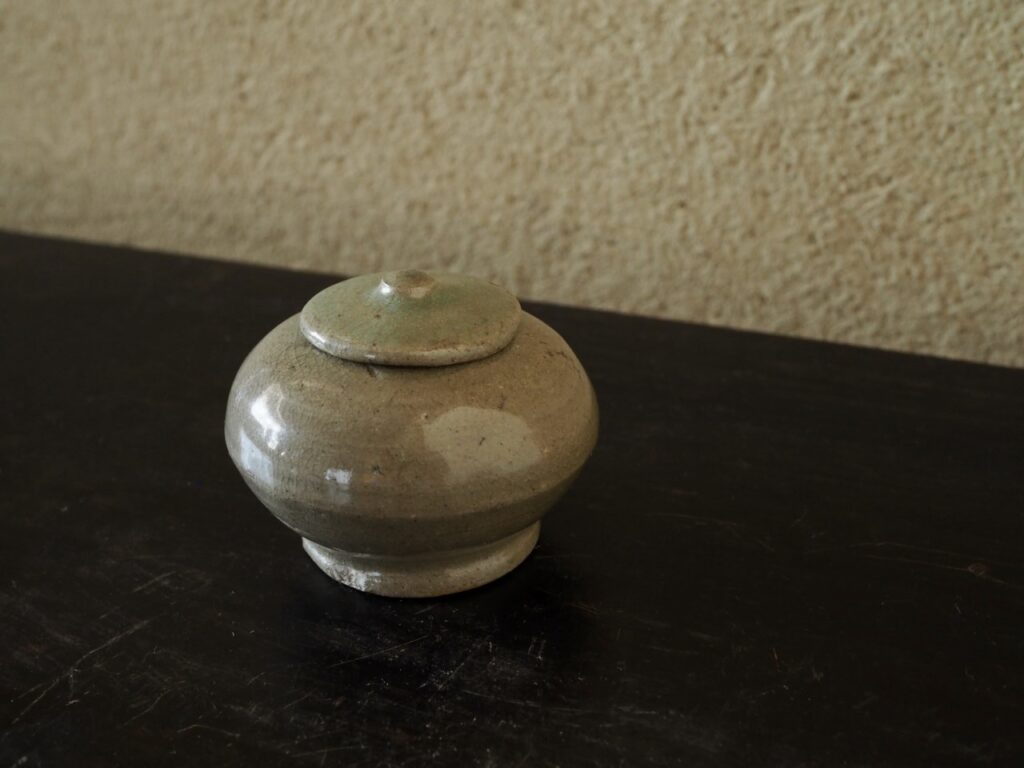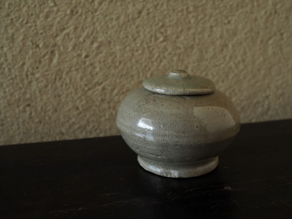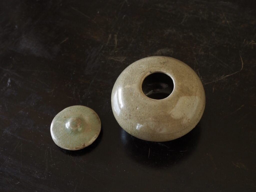 薬器あるいは粉器だったのでしょうか、高麗青磁では珍しい蓋付の小壺です。落ち着いた