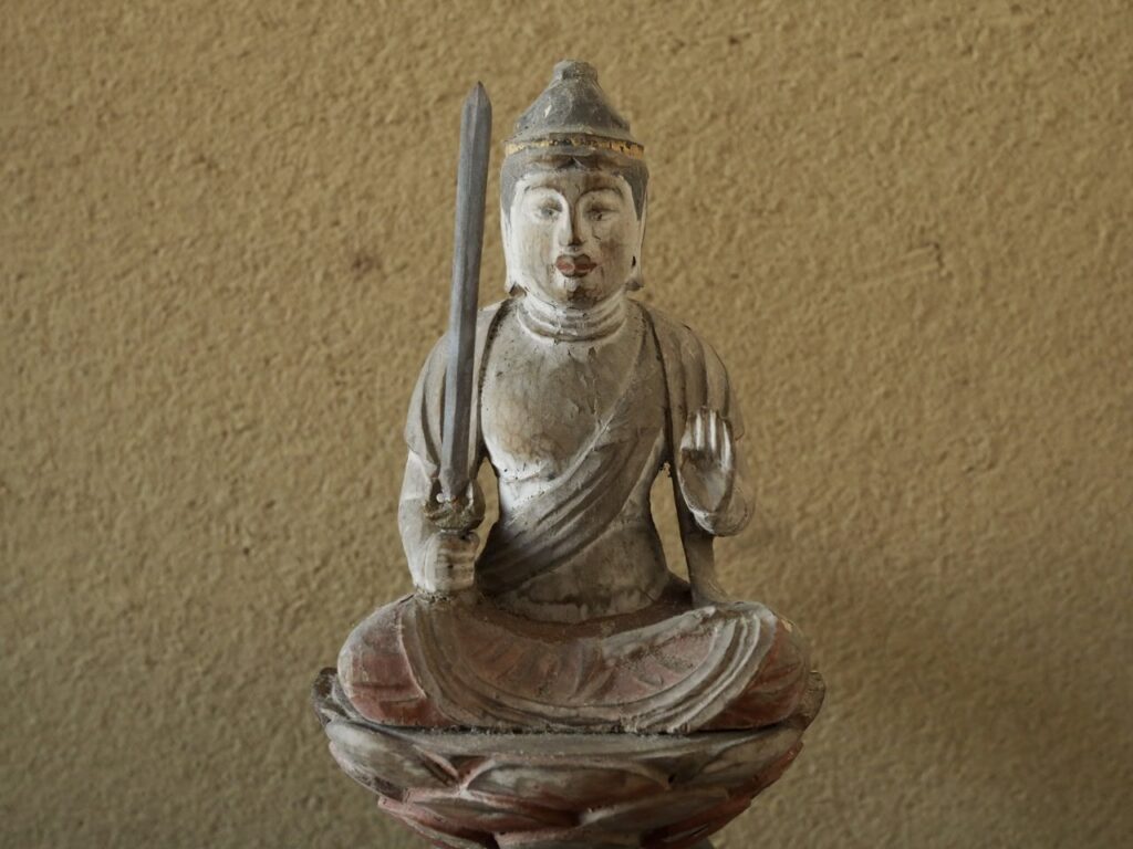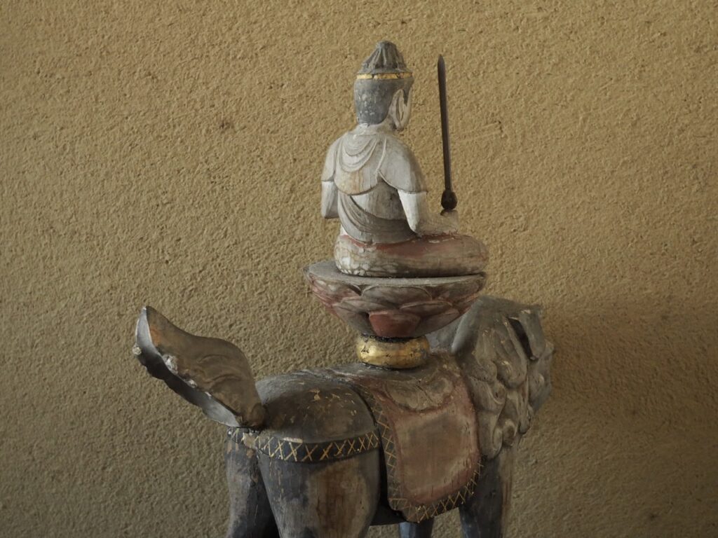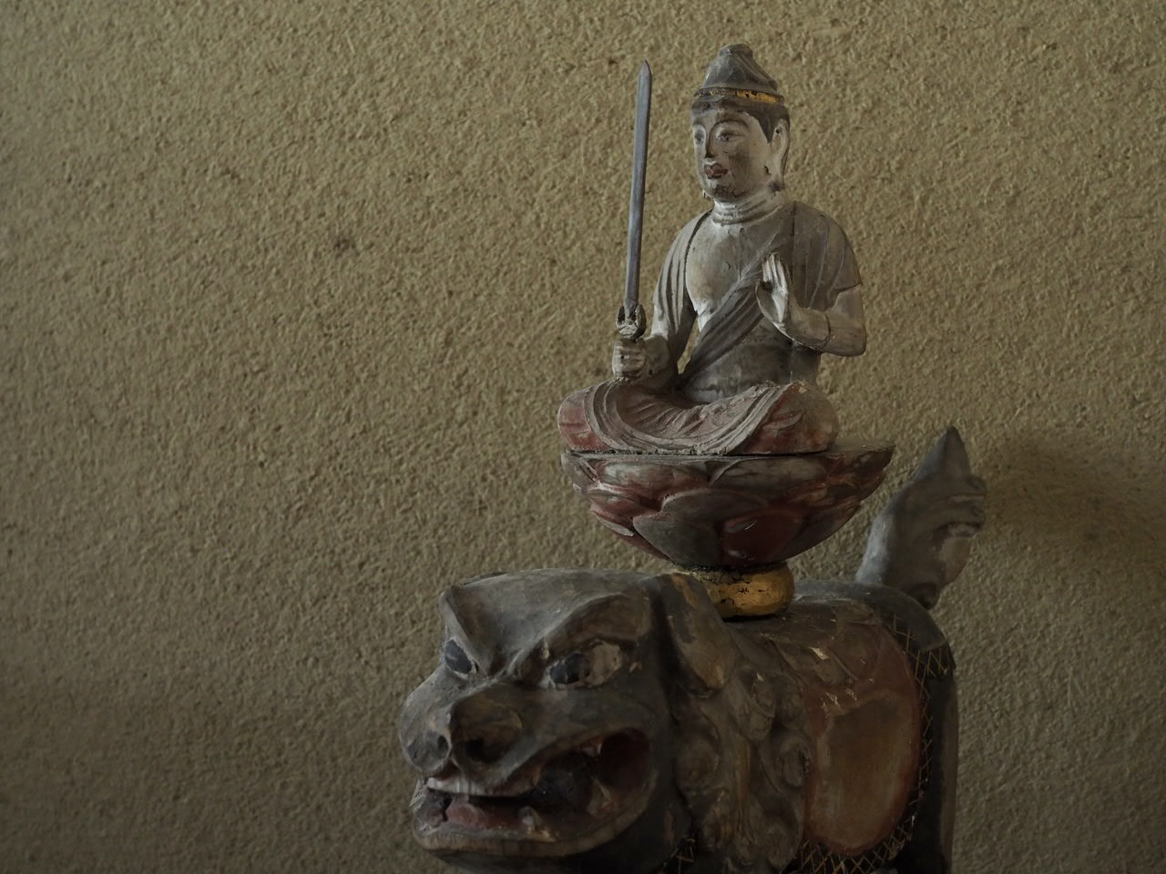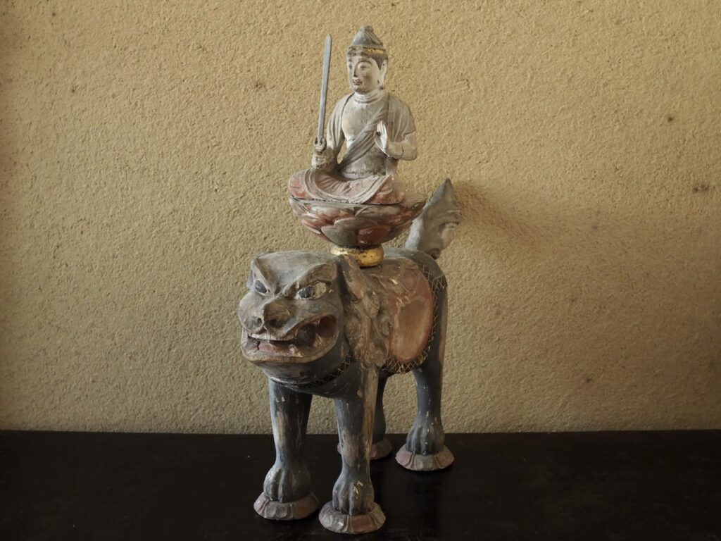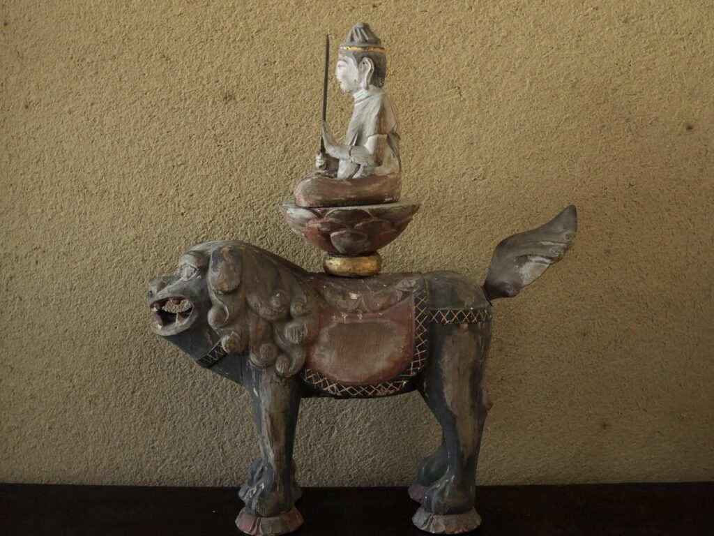 犬にも見えそうな可愛い獅子の蓮華座の上に結跏趺坐し、右手に智慧を象徴する利剣をもつ文殊菩薩。