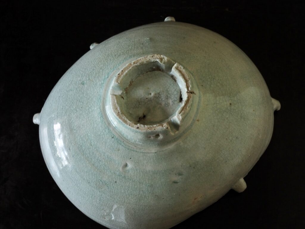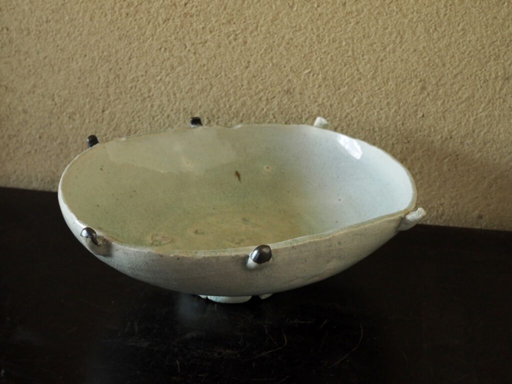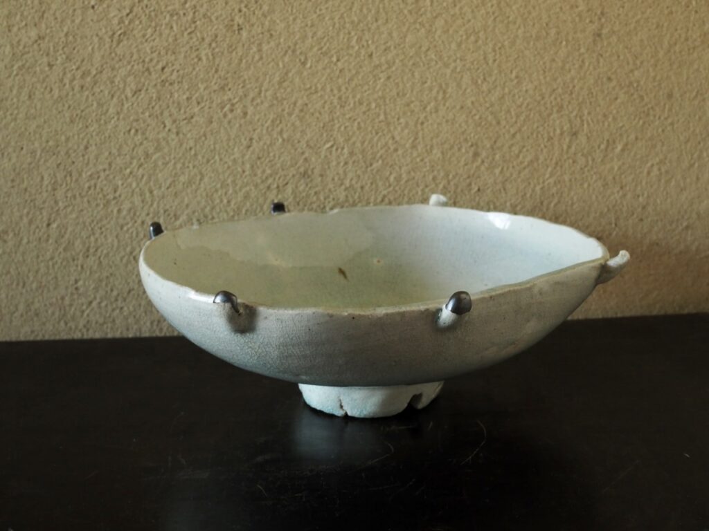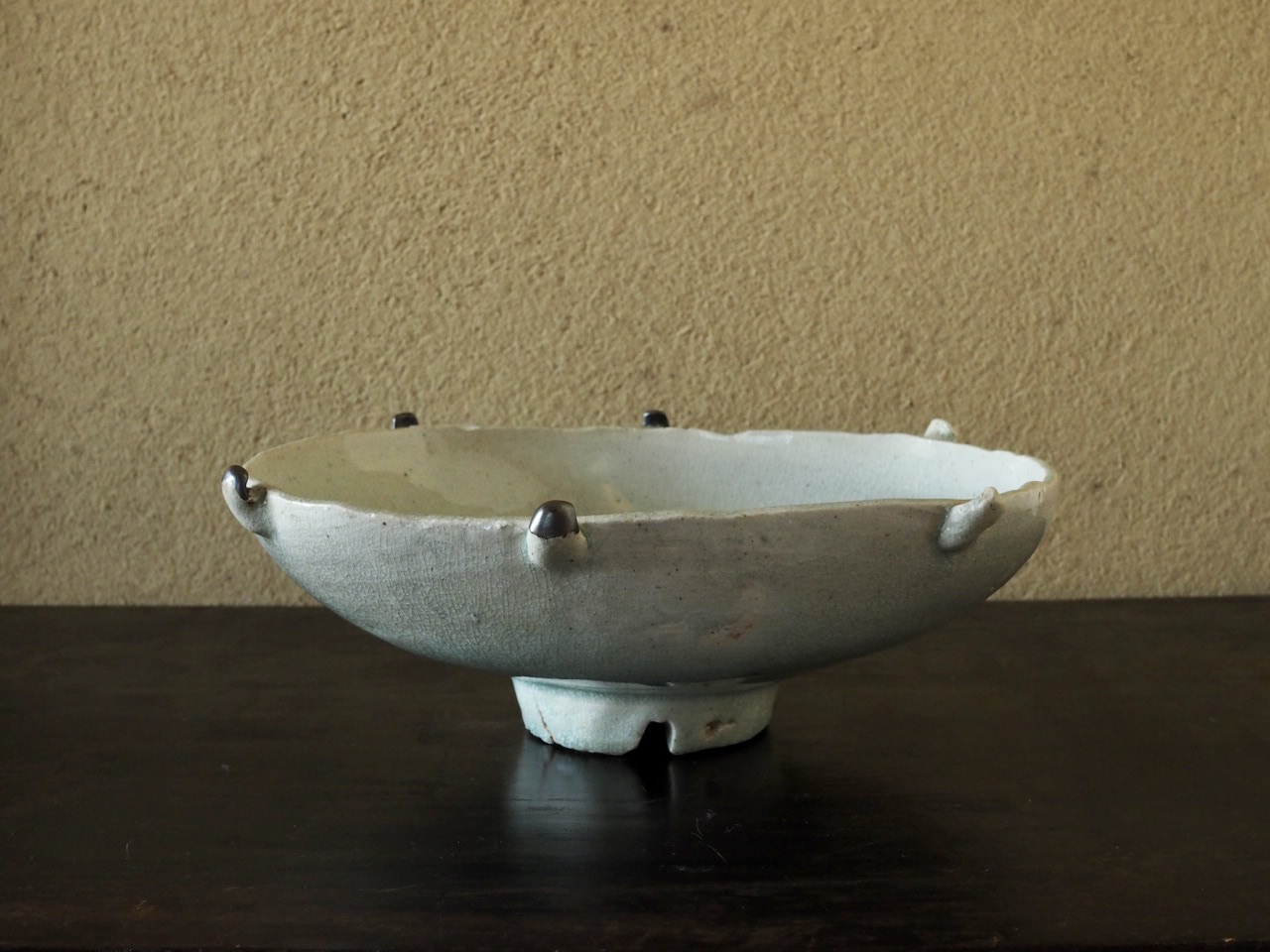 祭器ならではの腰高の姿や割れ高台が凛々しい反面、六ヶ所にに付けられたポチッとした装飾が