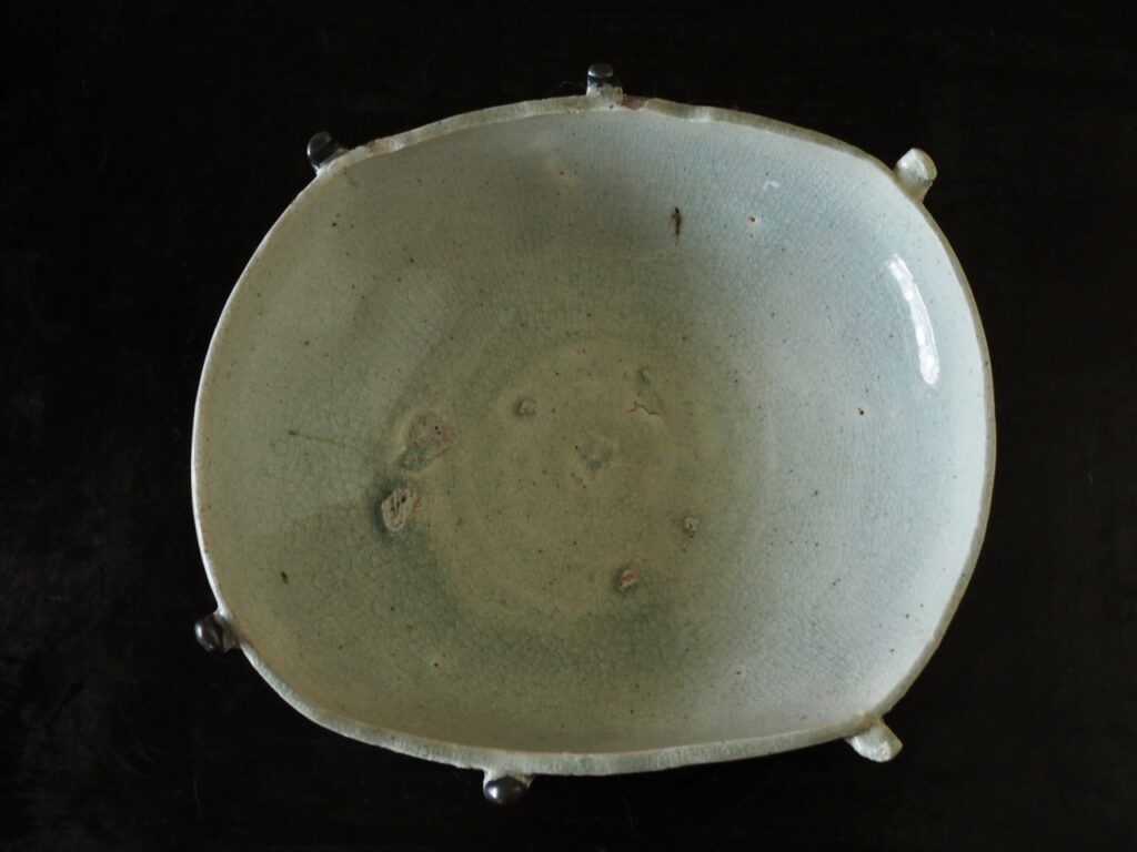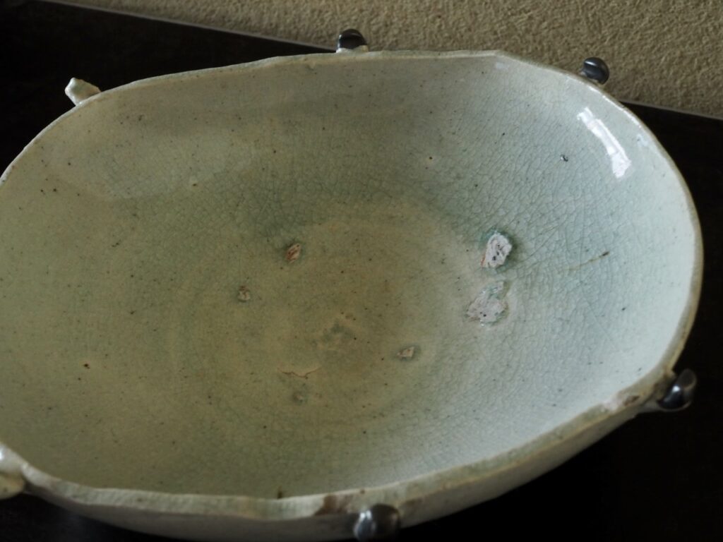 長さ25.5×22.5㎝ 高さ8.5㎝ 李朝中期 銀継ぎ 蓋無し 桐箱付