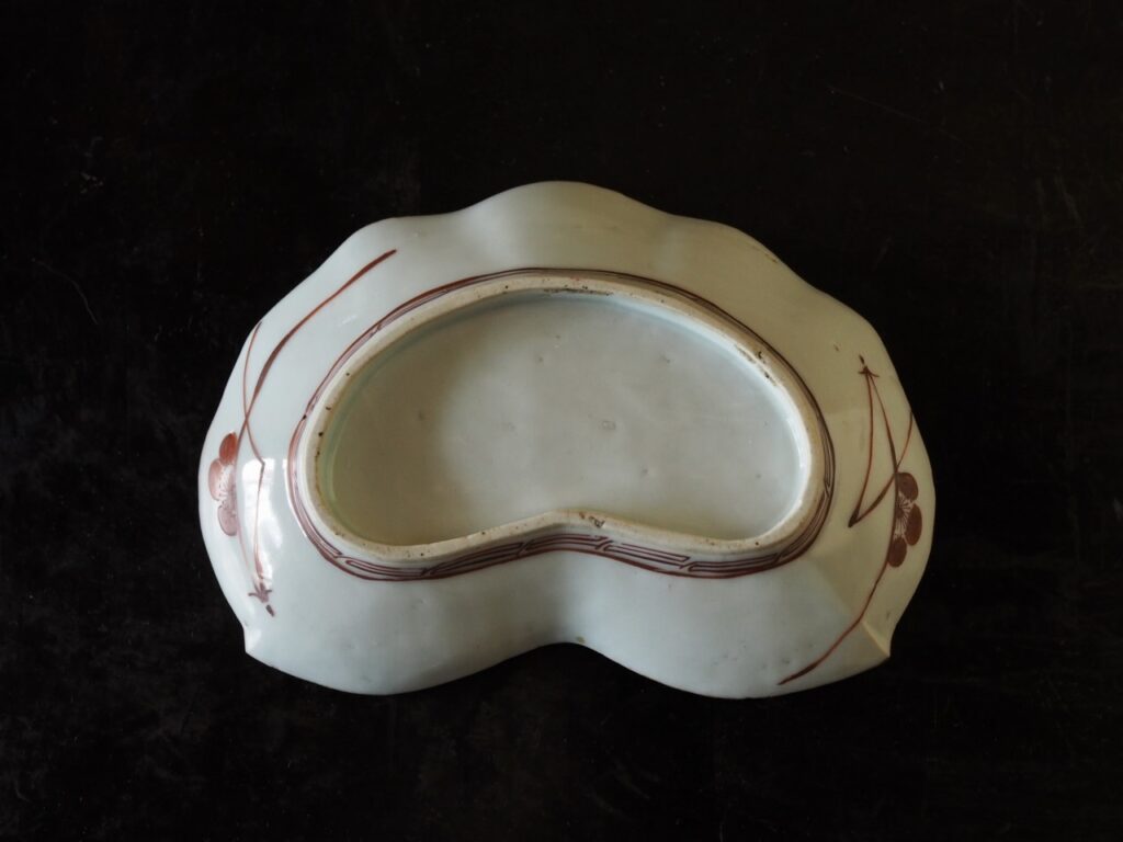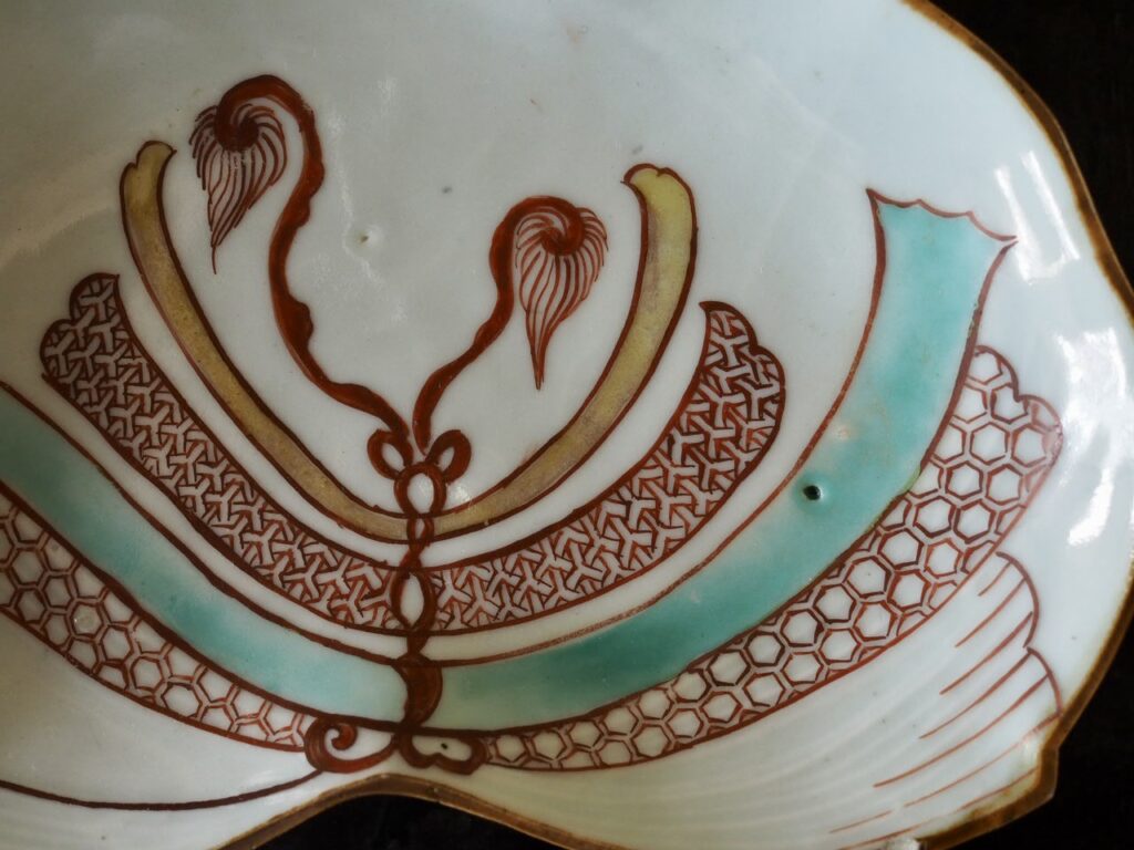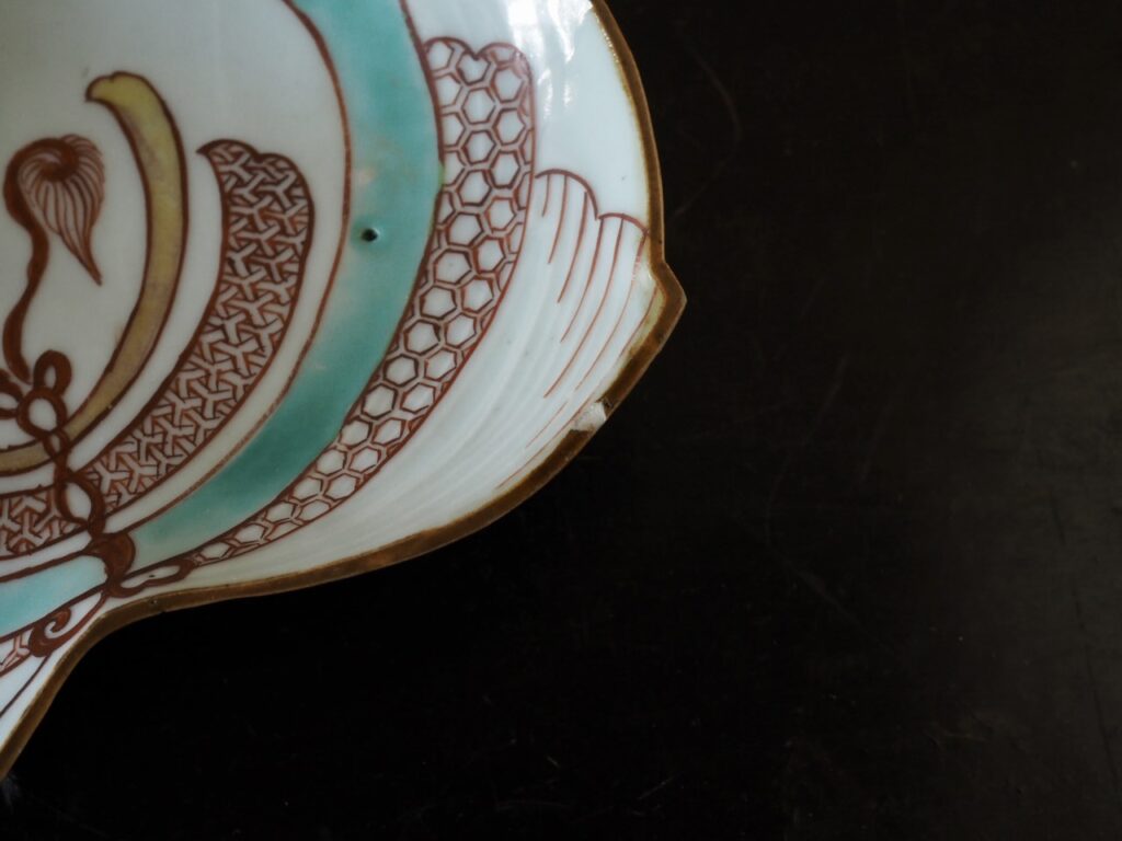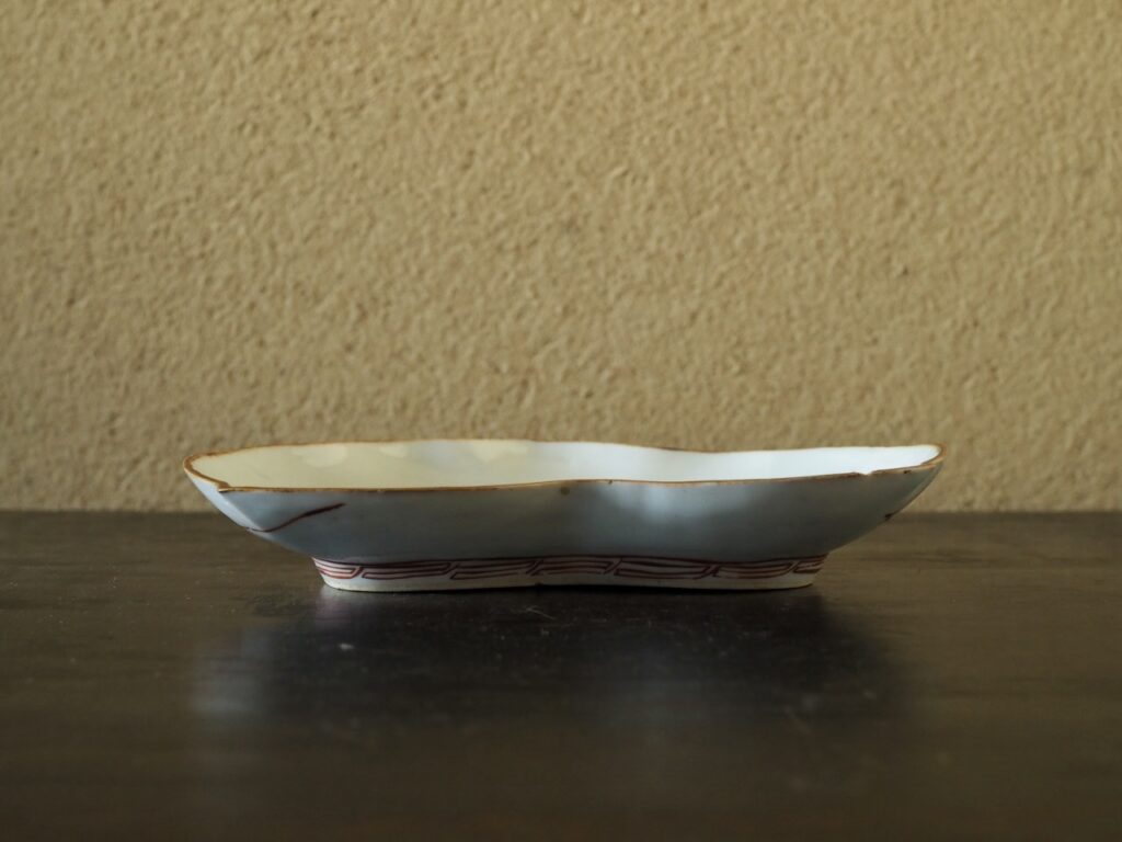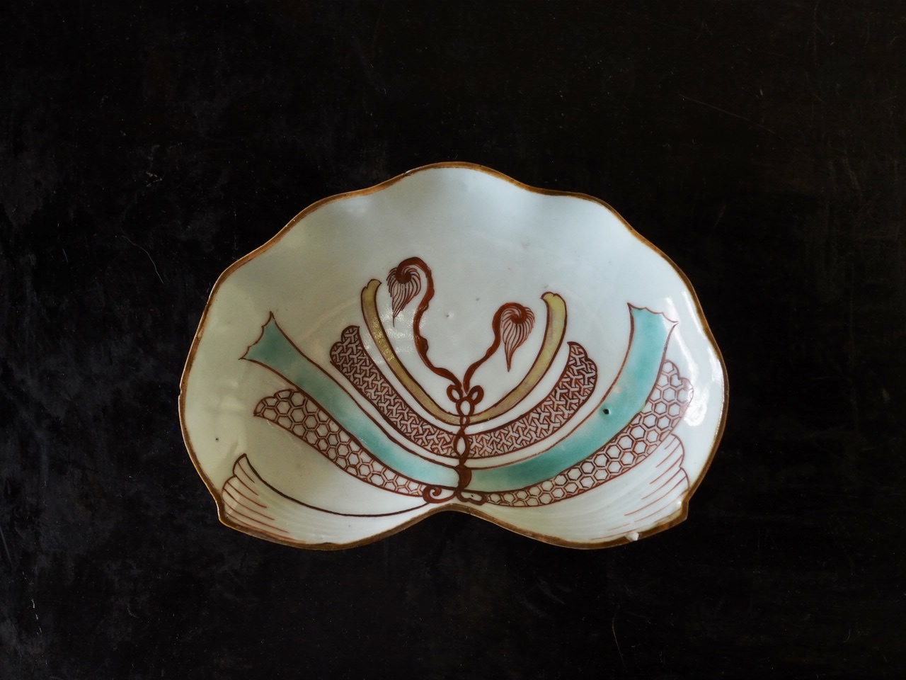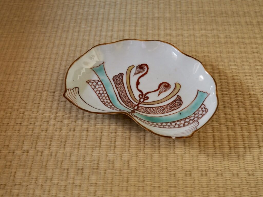 型打ち成形された変形皿で熨斗文の陽刻の上に再び色絵で華やかな熨斗文が描かれます。
