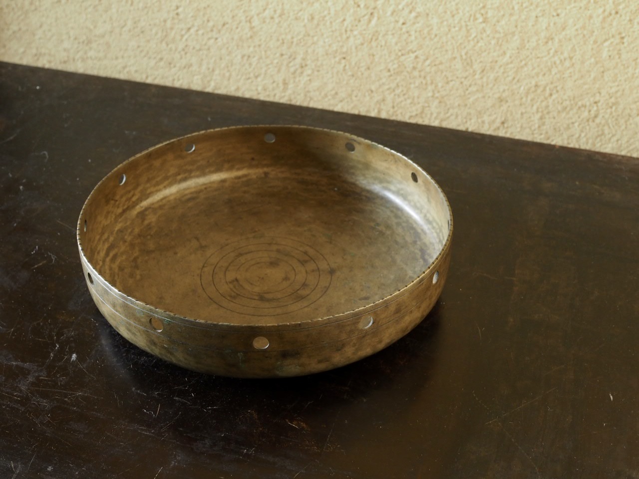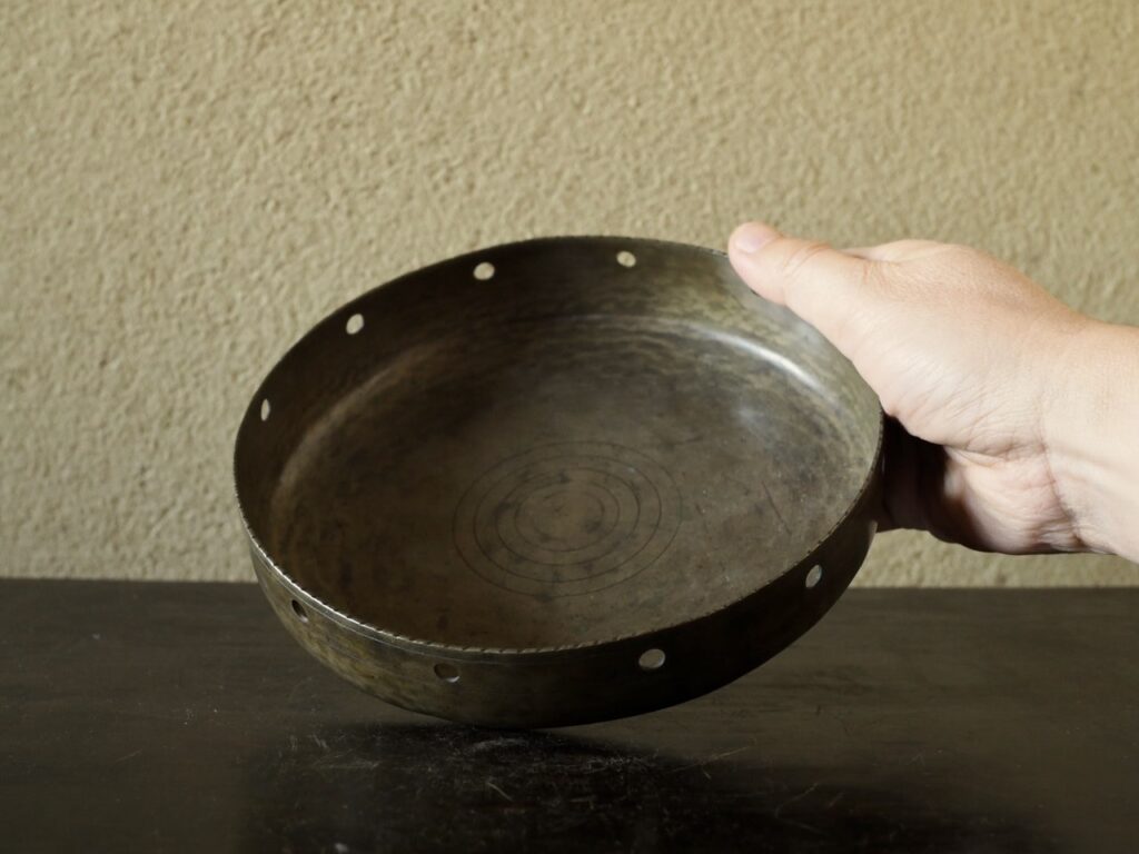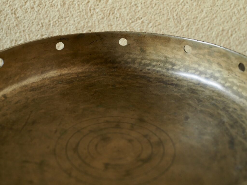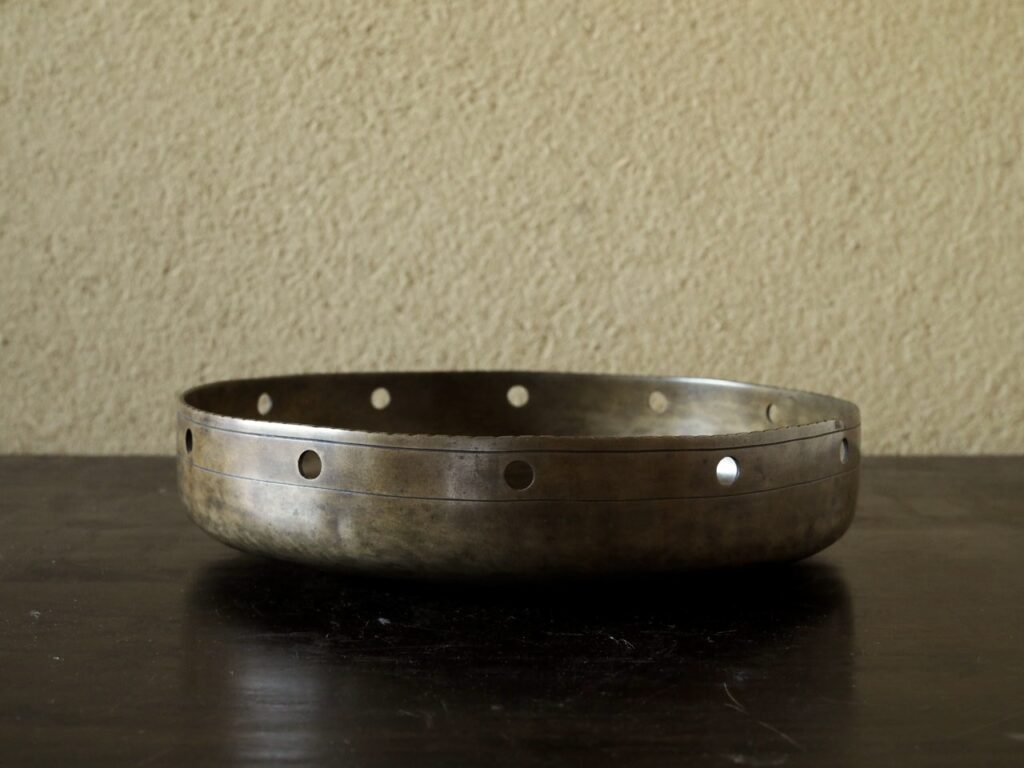 細かで丸いギザギザの口縁部に、等間隔に開いた穴が洒落ており、金属で