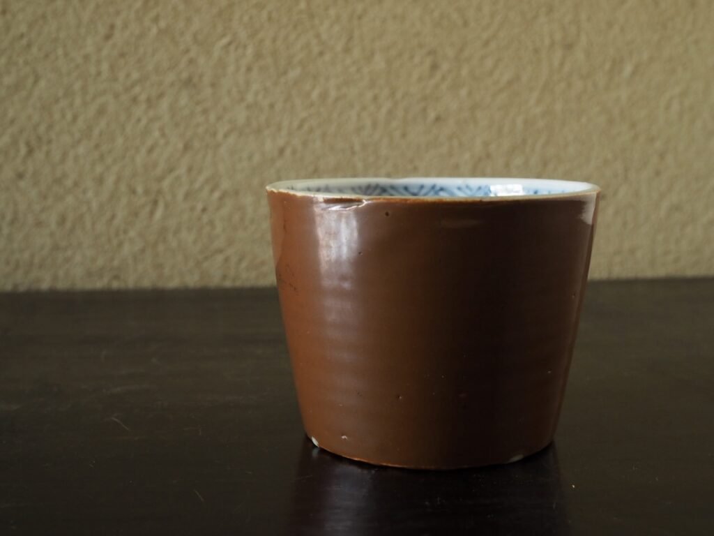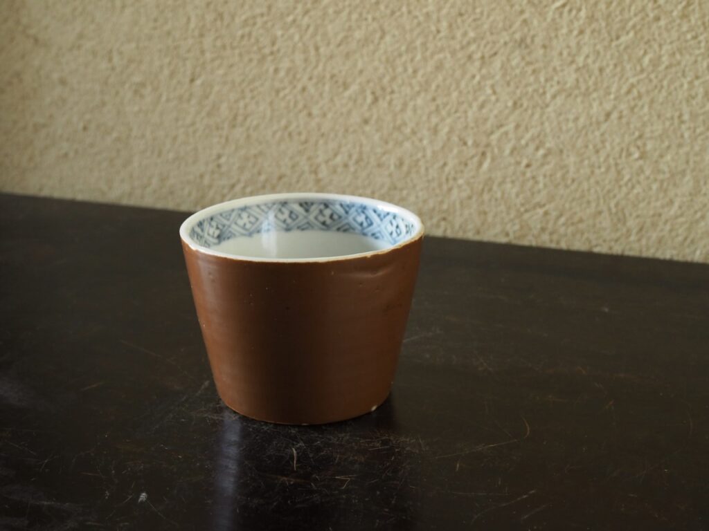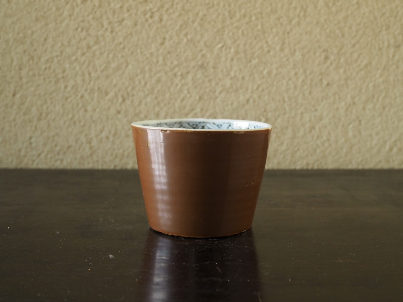 スッキリとしたチョコレート色の錆釉のみを外側に塗ったシンプルで洒落たそば猪口です。
