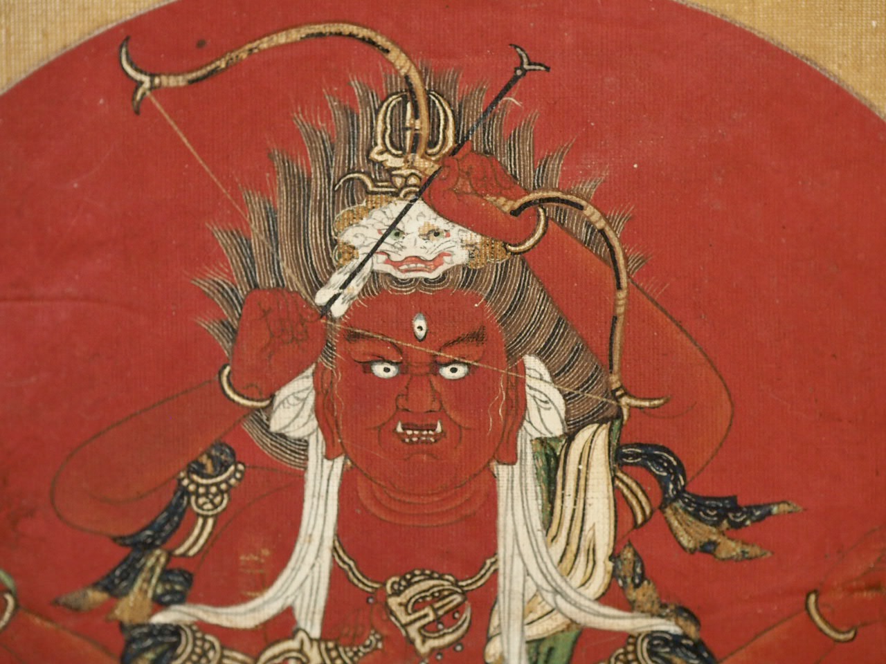 鮮烈な赤と憤怒の表情で愛をもって衆生を救う「天弓愛染」と呼ばれる愛染明王像で、