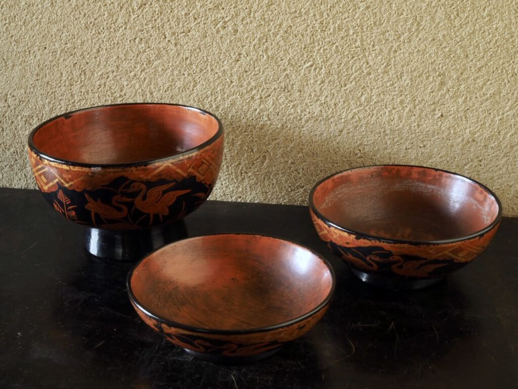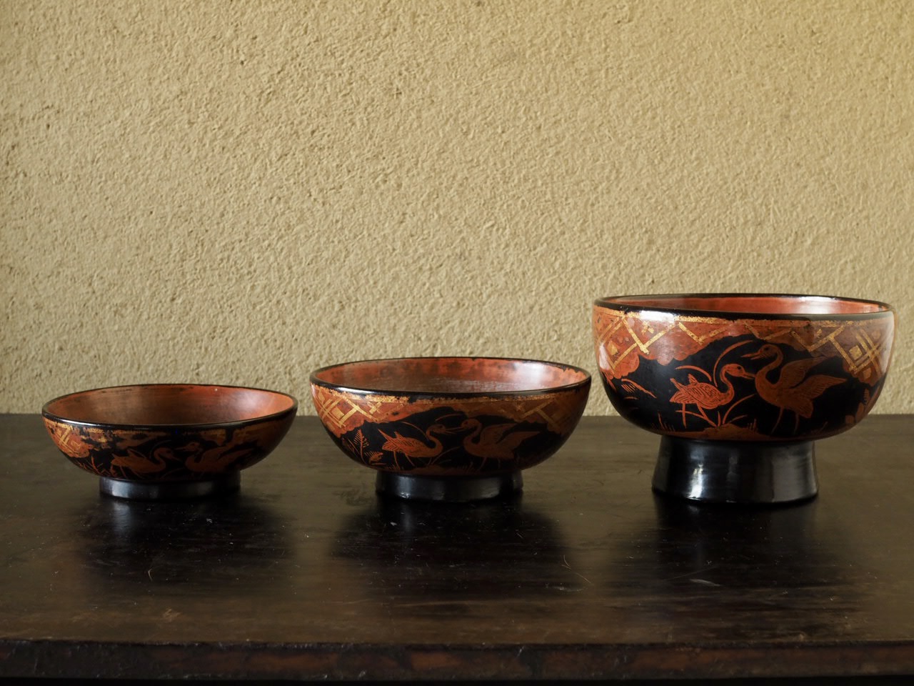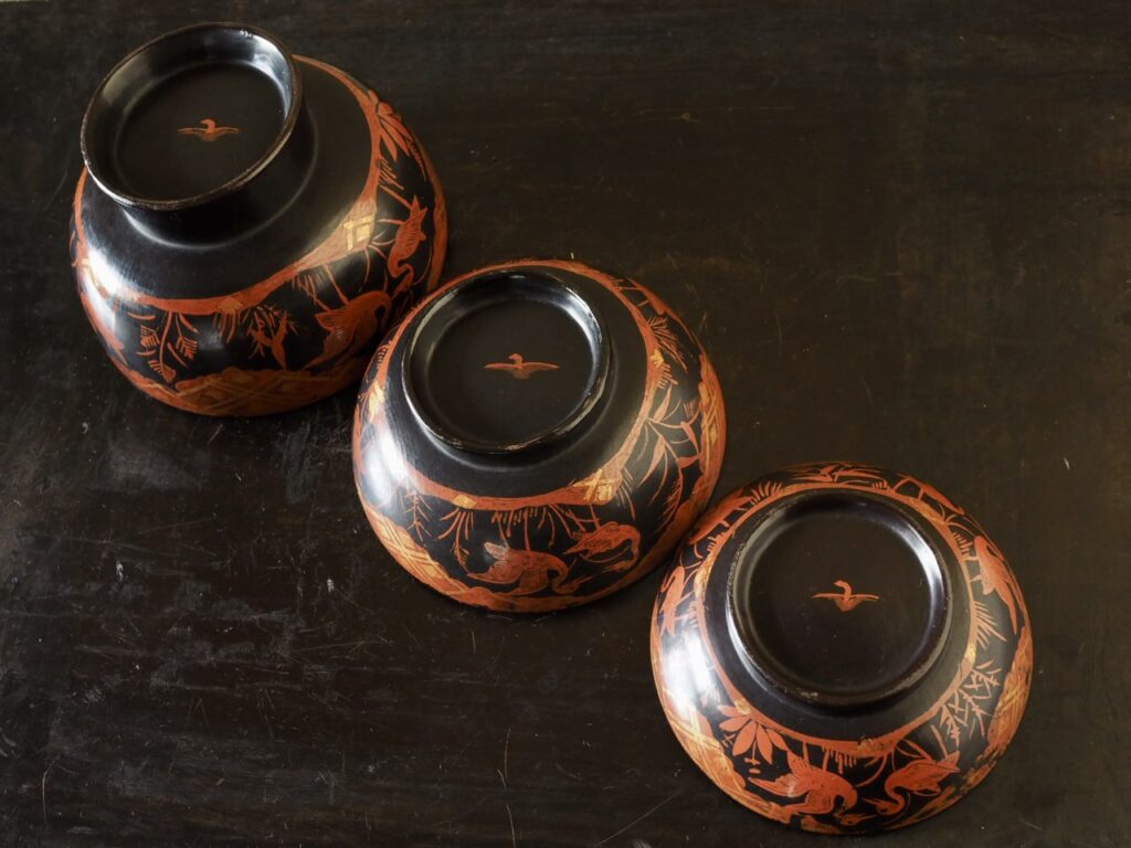 東北が誇る時代漆器の雄、秀衡椀の三つ椀です。黒、朱、金箔のみですがそれ以上の彩が