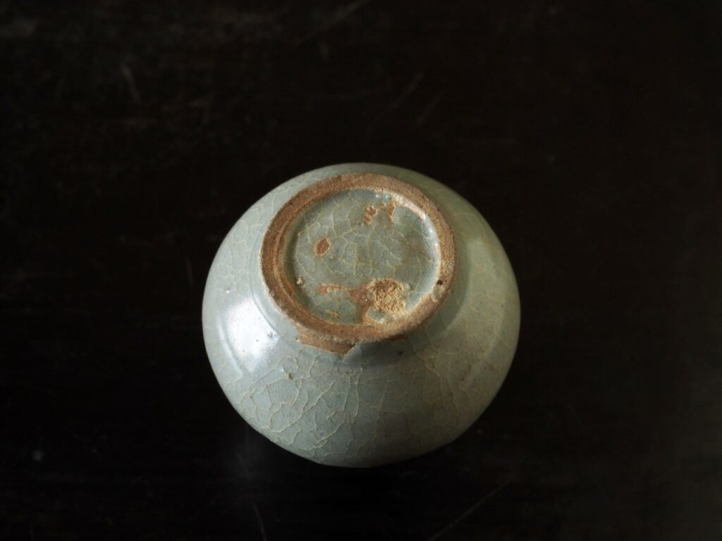 明るく透き通った爽やかな青磁釉と、小さく丸っこい姿がとても愛らしい油壺です。珍しいのは