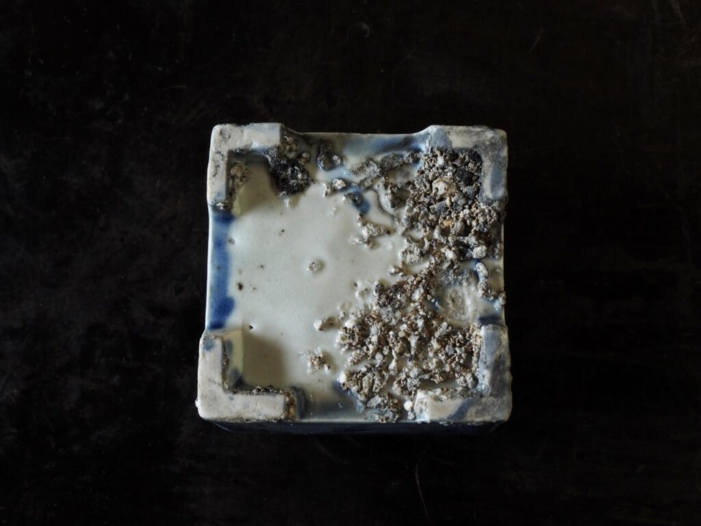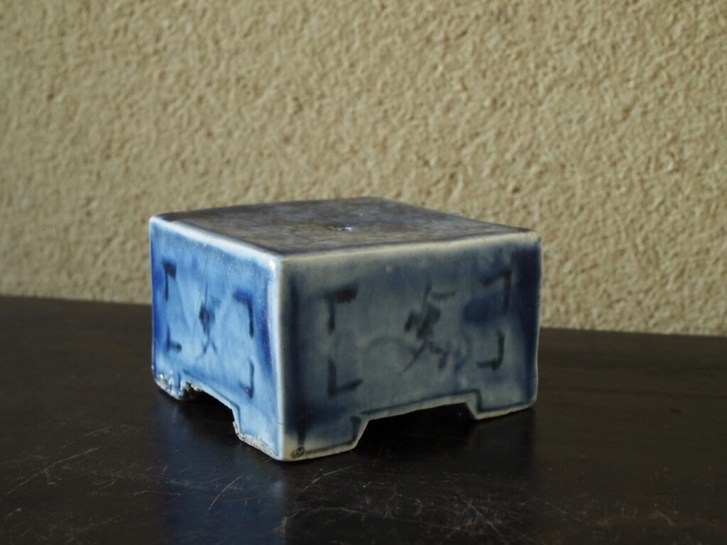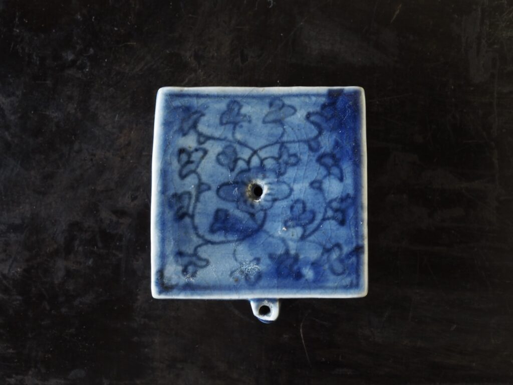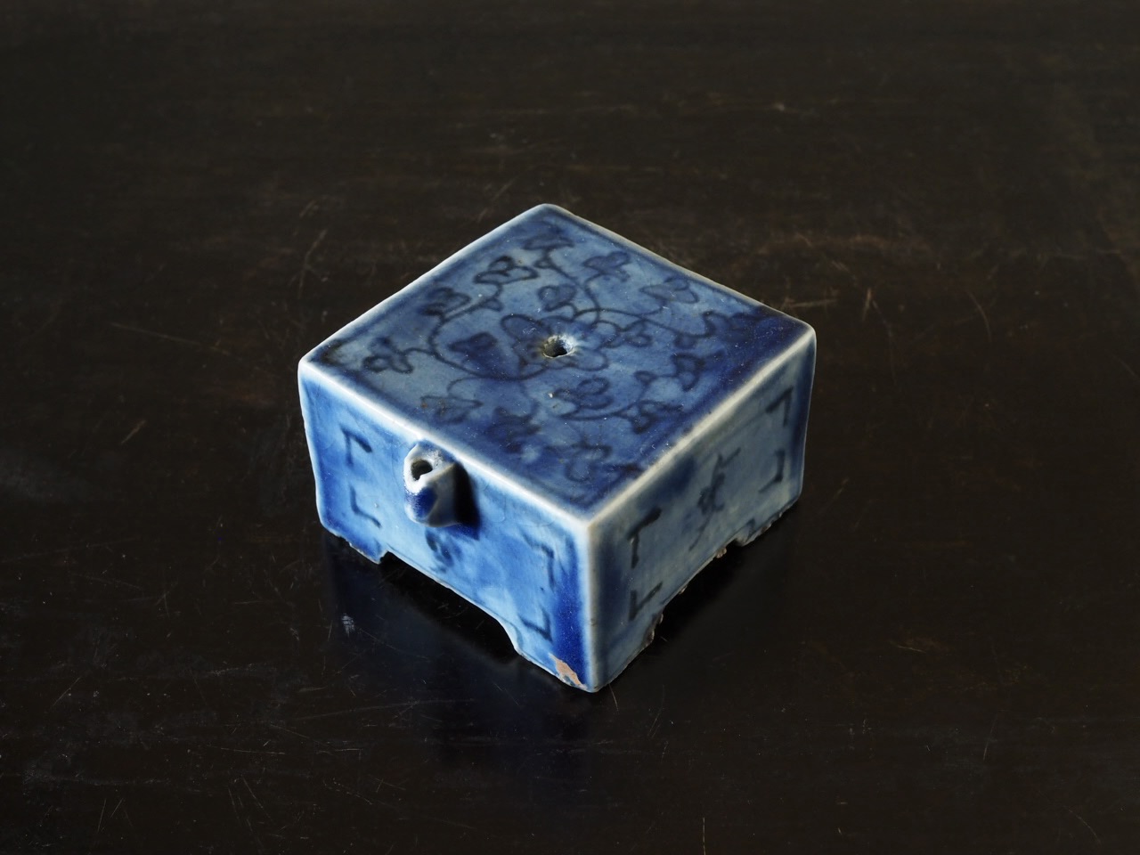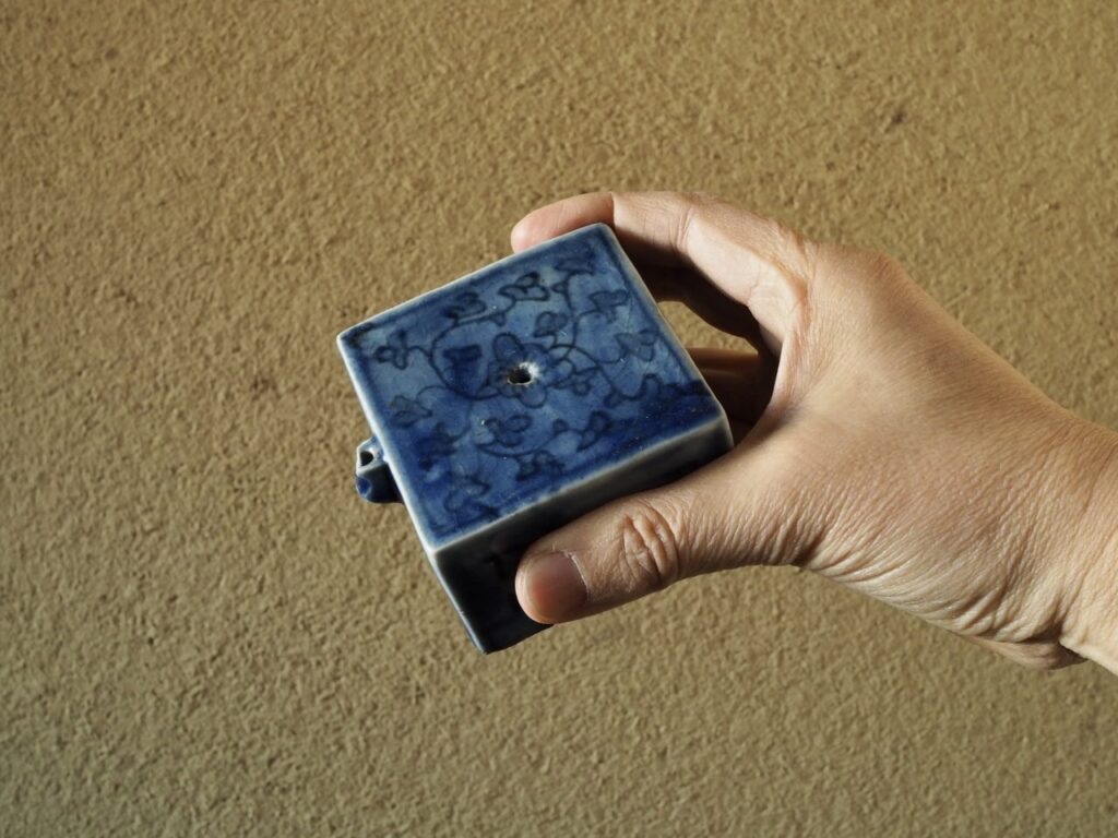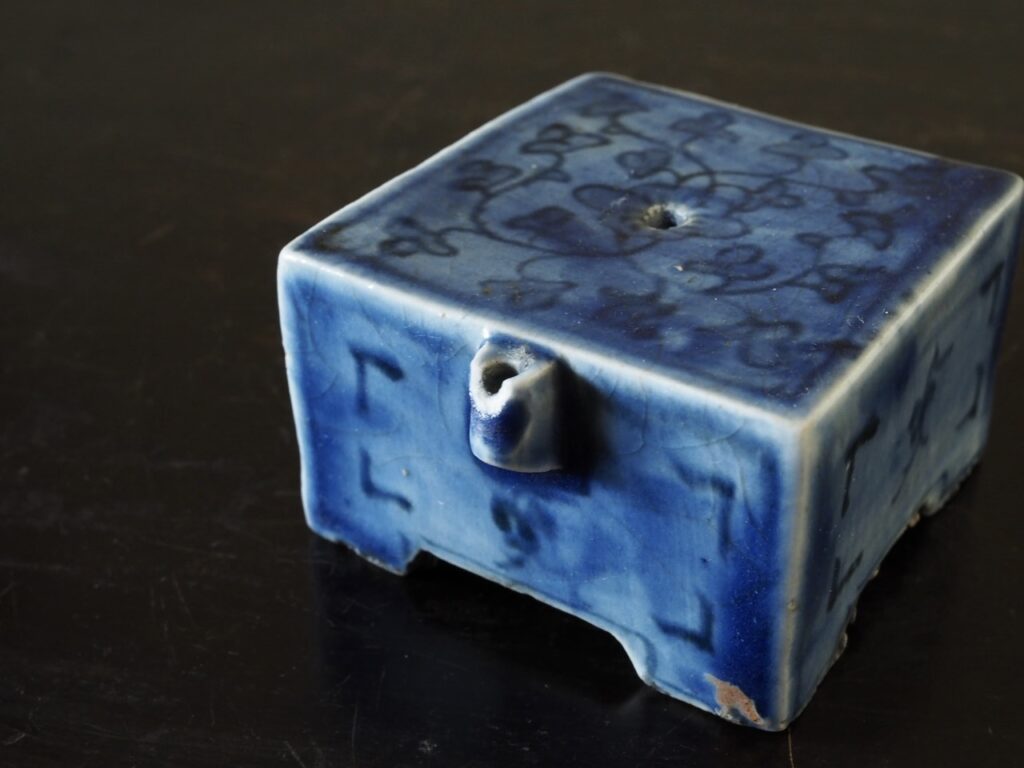 明るく鮮やかな瑠璃地に花唐草文が可愛らしく描かれた大きめの四方水滴です。瑠璃地染付