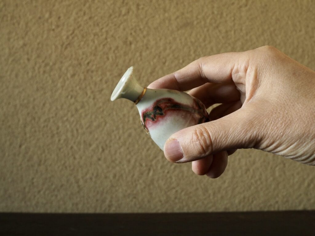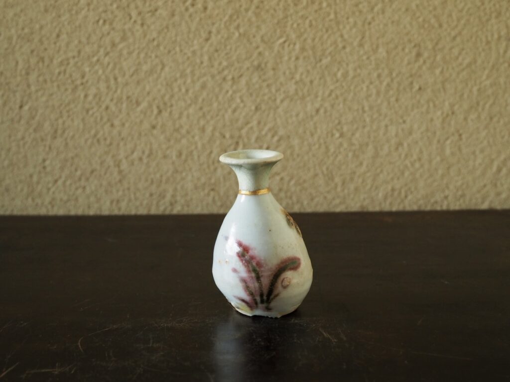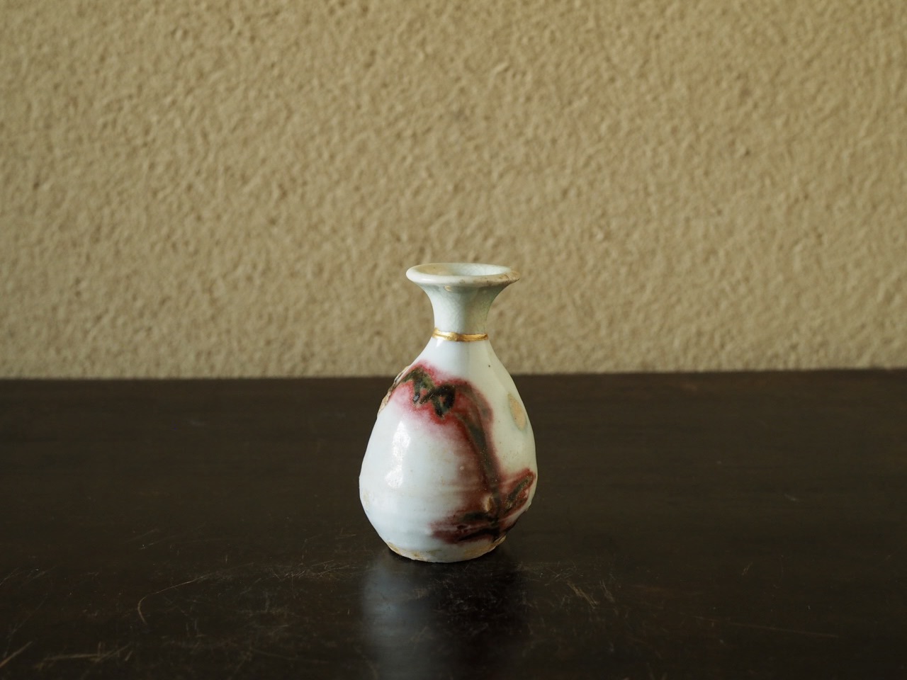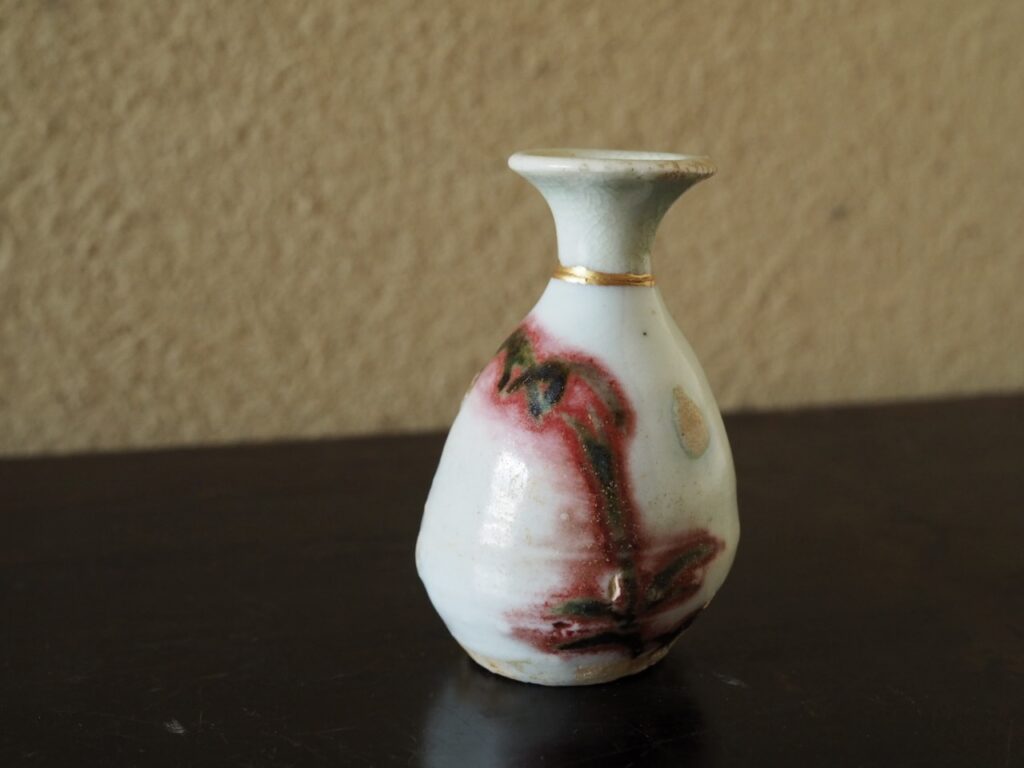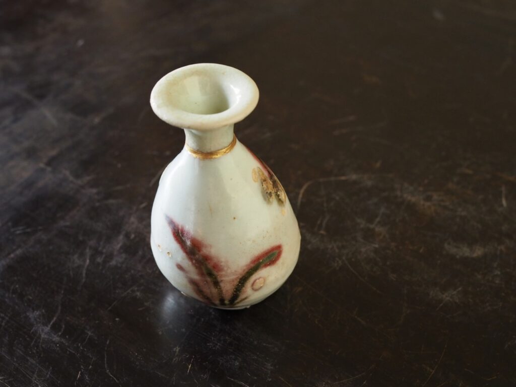 「泪壺」と呼びたくなるような小さく儚い初期伊万里の小瓶で、草と笹を描いた辰砂の発色が