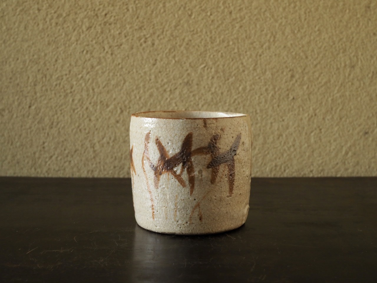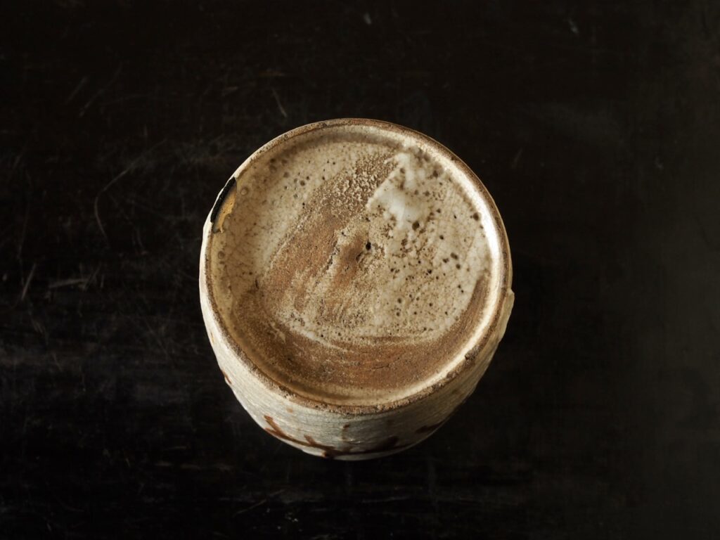 スッキリとした円筒形の向付で、軟らかな長石釉がみずみずしく、赤味を帯びた鉄釉で
