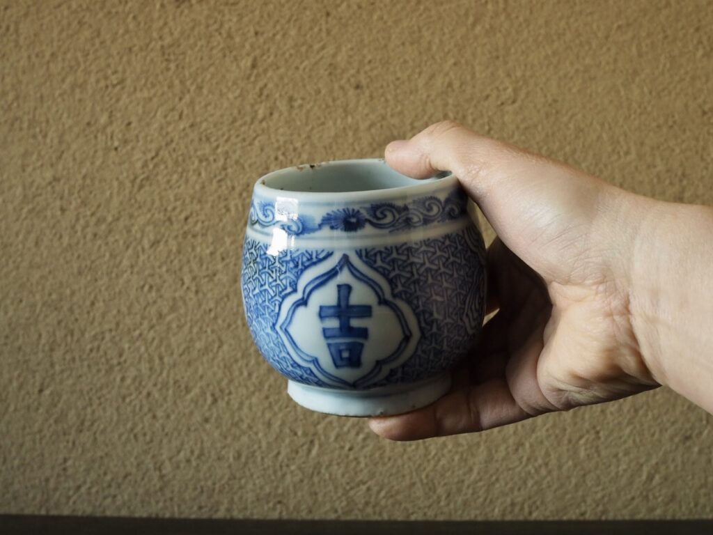 掌に収まる小振りでコロリとした茶碗で、輪花の窓に「吉」の太い文字はたいへん福々しく、