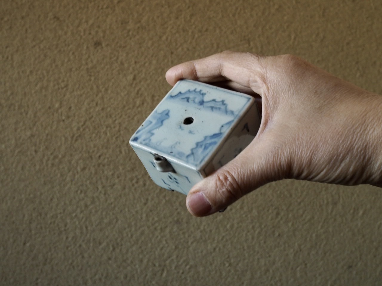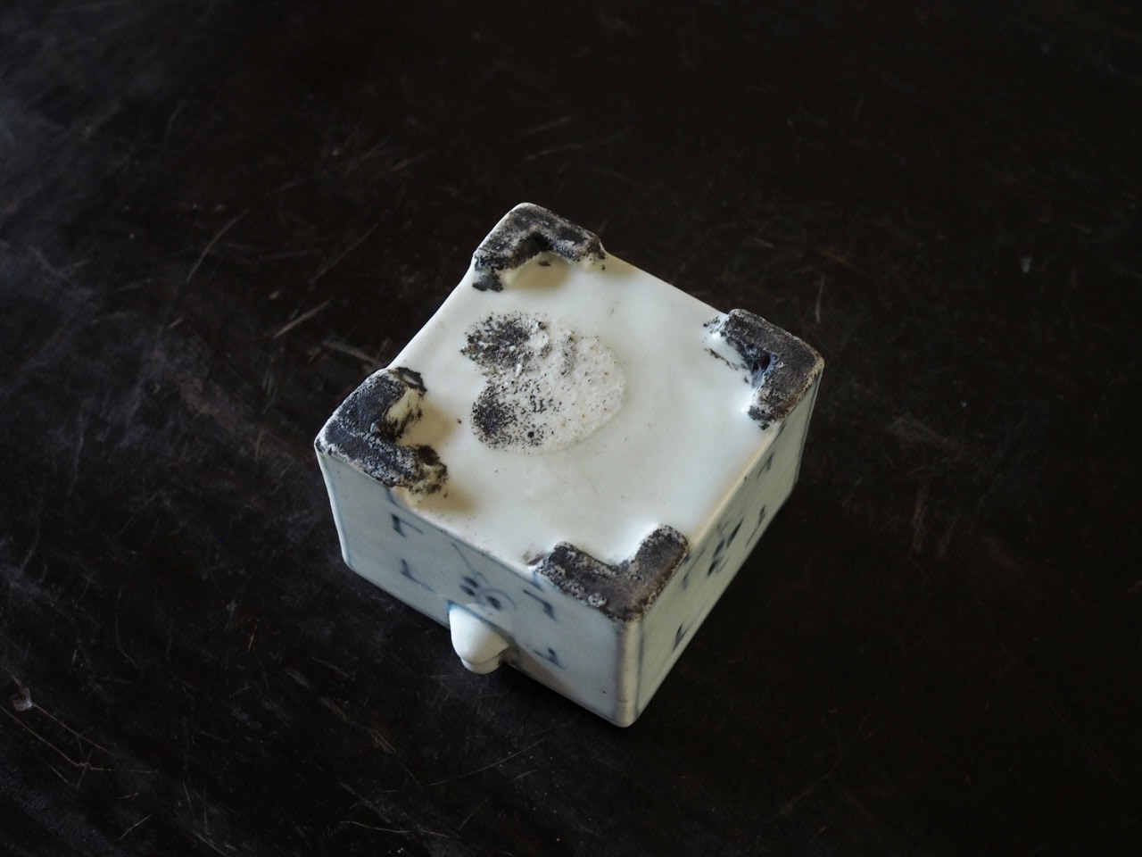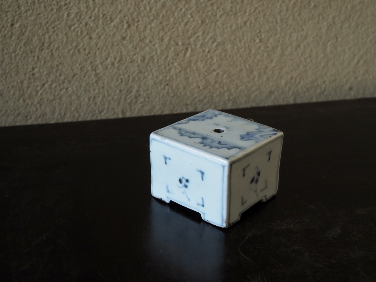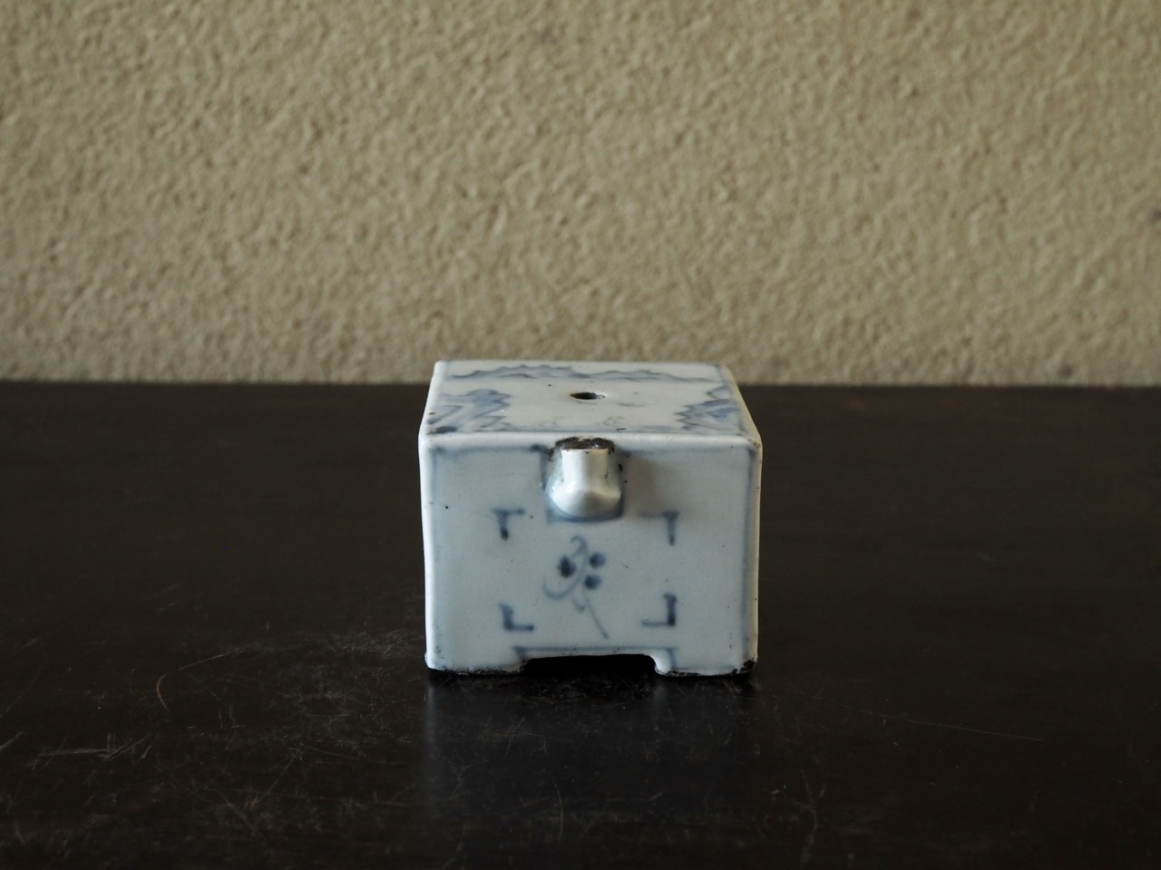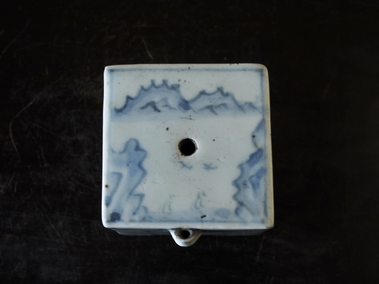 李朝染付水滴 2024 2/03 2024年2月3日 正方形に近いエッジの効いた鋭い造形に 凛としたものがあり、明るい磁肌と 淡い呉須が魅せる深遠な風景図に清々しさを感じます。 長さ6.2×6.1㎝ 高さ4.6㎝ 朝鮮後期 無疵 箱なし お買い上げありがとうございました。 文房具 李朝