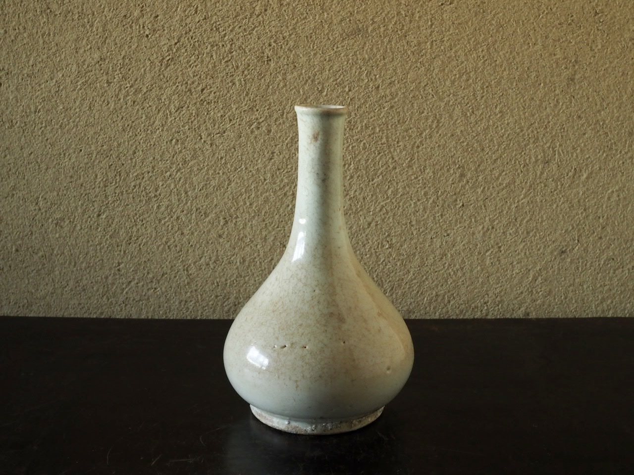 ほっそりとした姿が儚げで、やや黄味がかった白磁肌と表面を覆う磁貫が織りなす