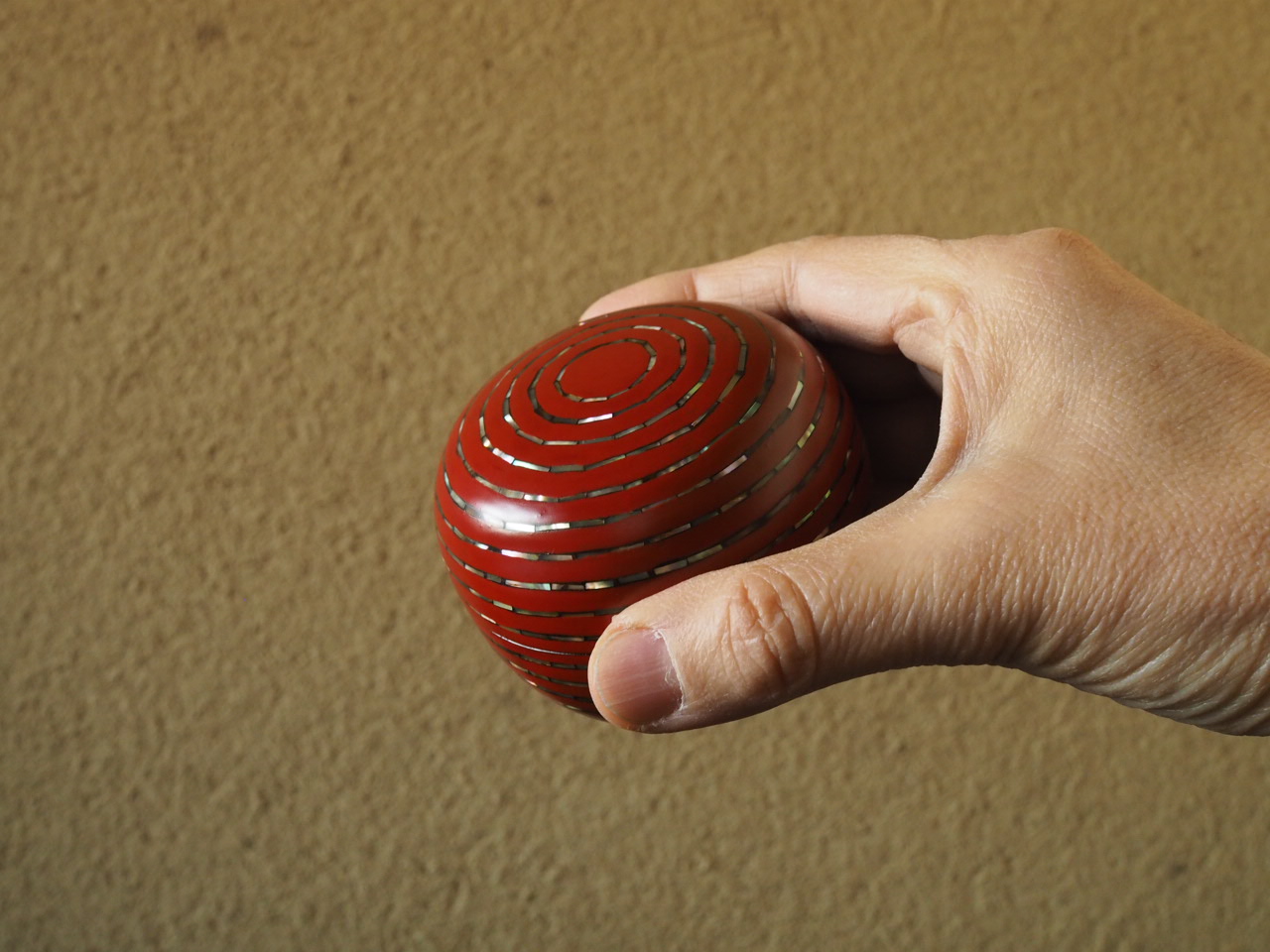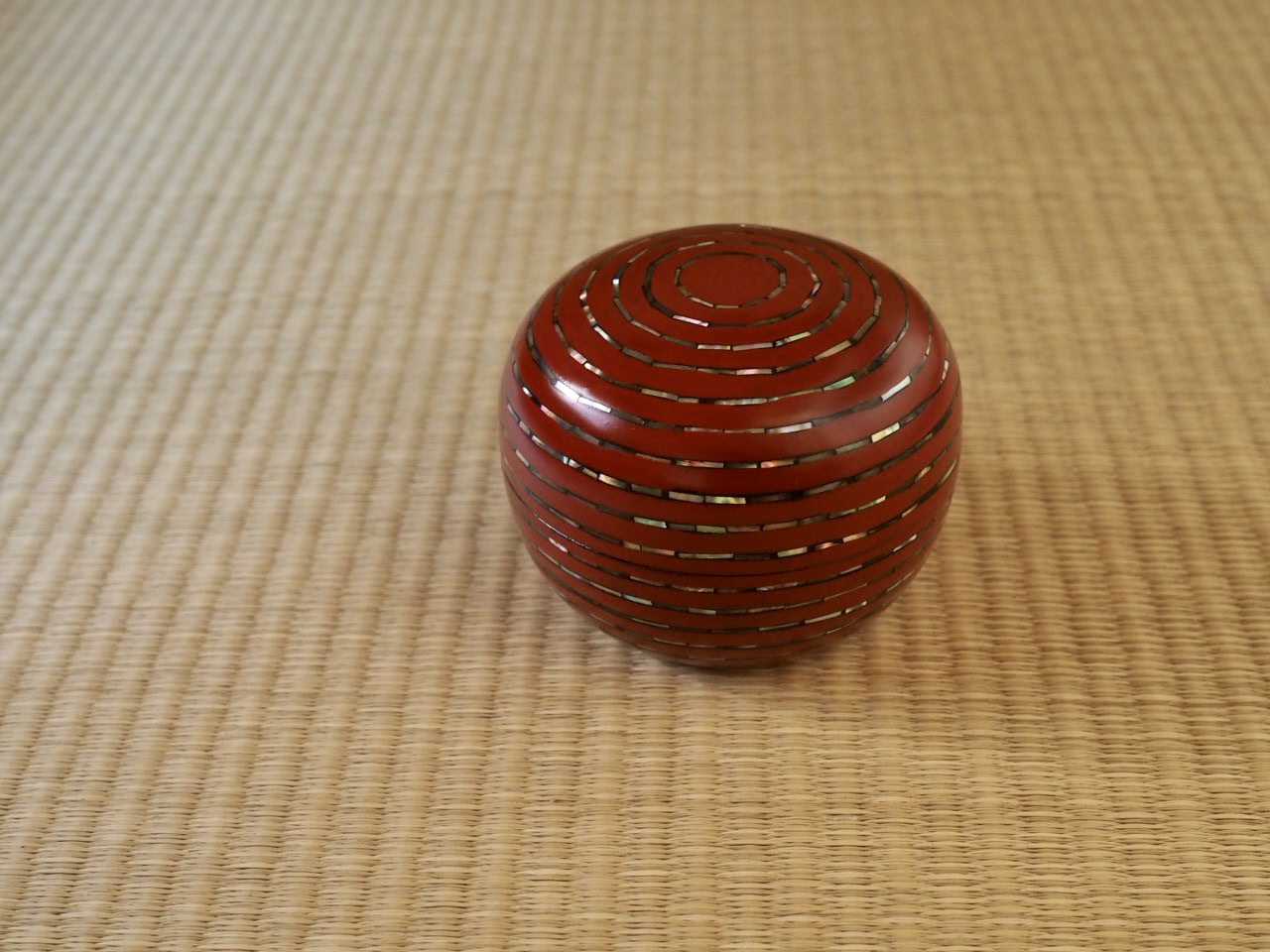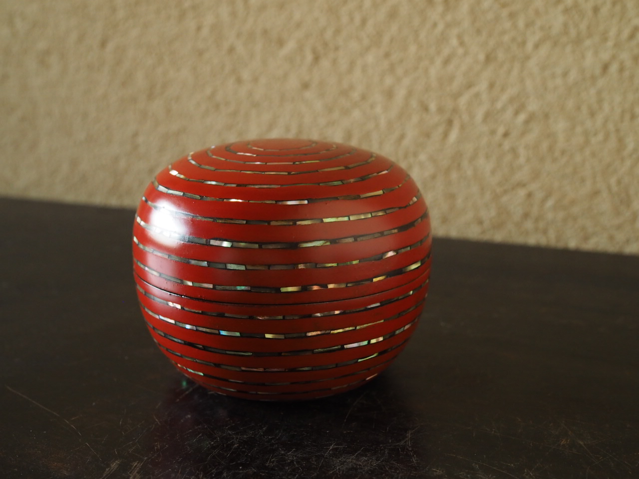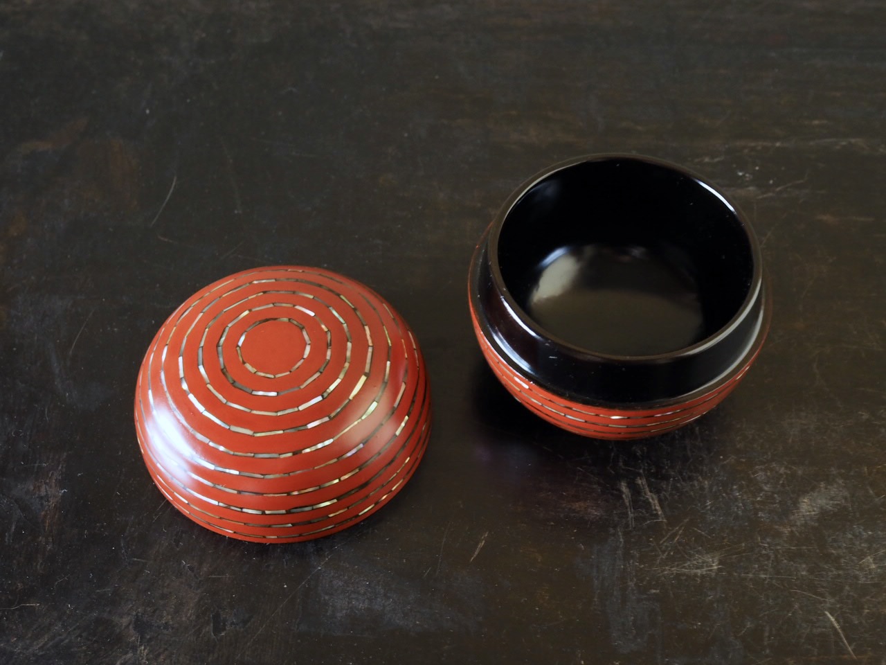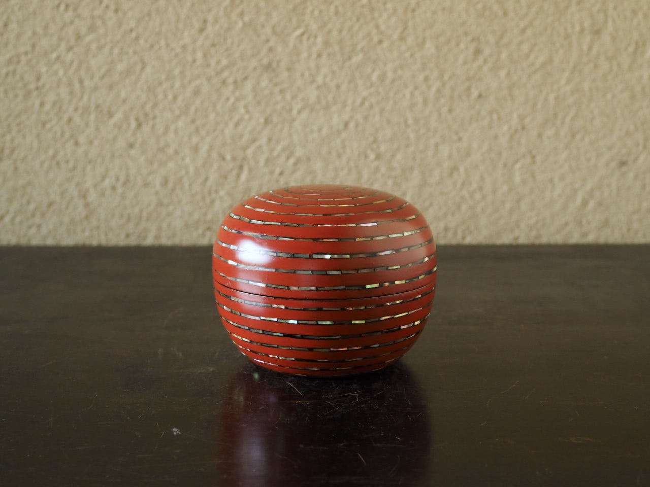 こんもりとした丸棗で朱漆に細い青貝の輪線文様が回らされ、螺鈿の煌めきに品の良さが漂い