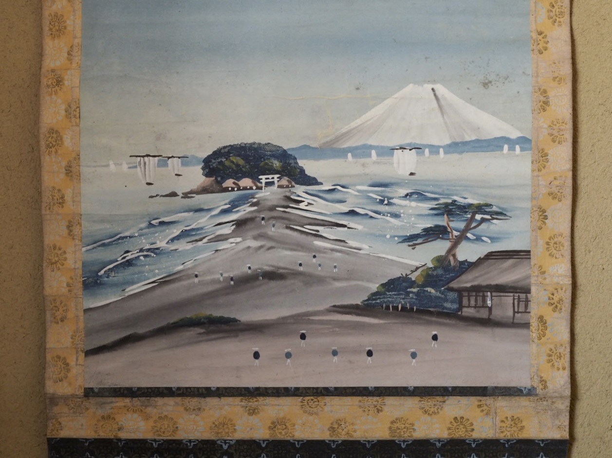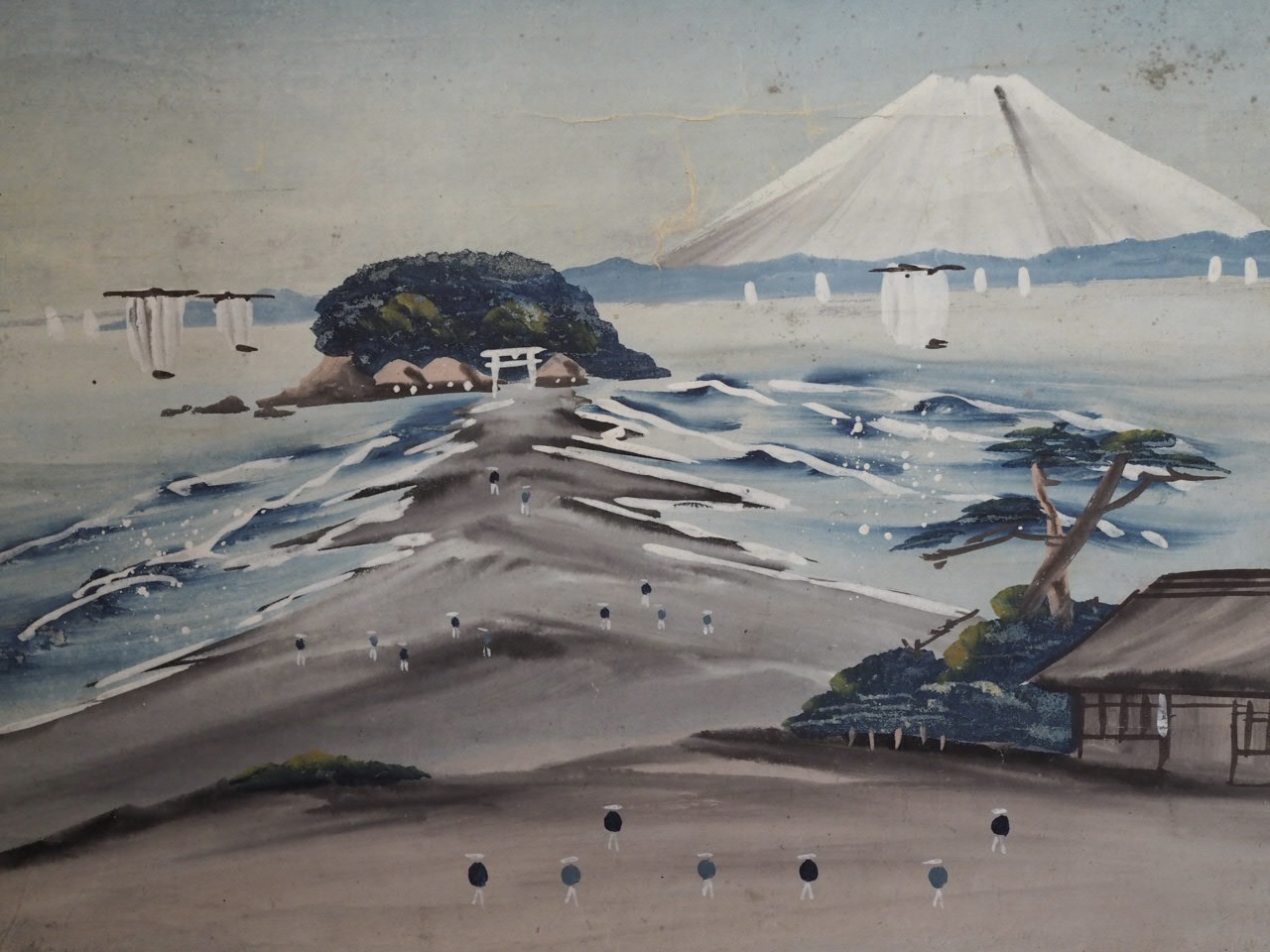 帆掛舟、江島神社そして絶景を眺める旅人たちが素朴なタッチで賑やかに描かれます。
