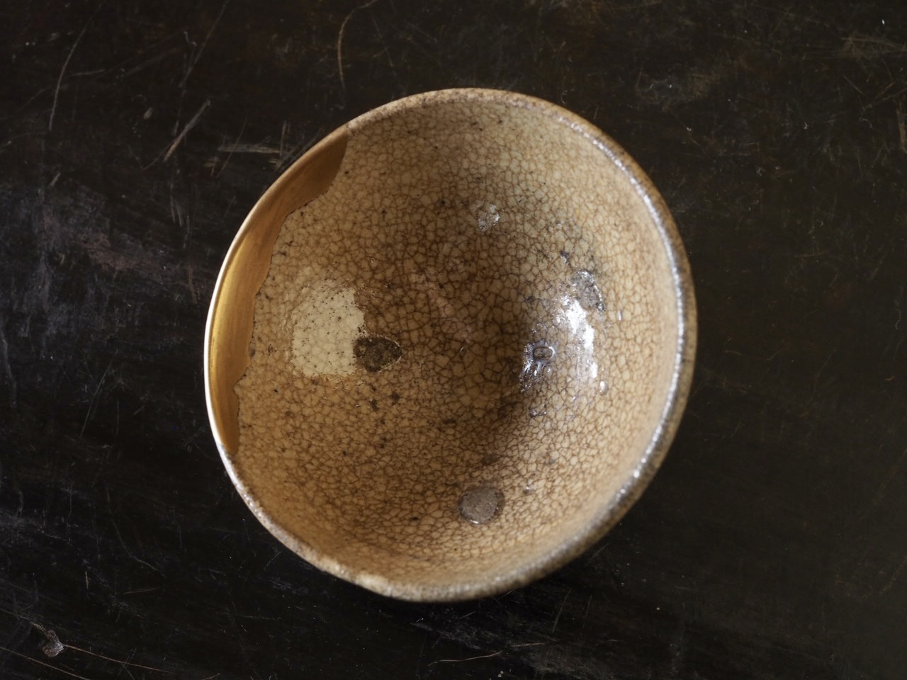 朽葉色のつややかな釉調はキラキラと輝き、見込の三点の目跡にも古格を感じます。