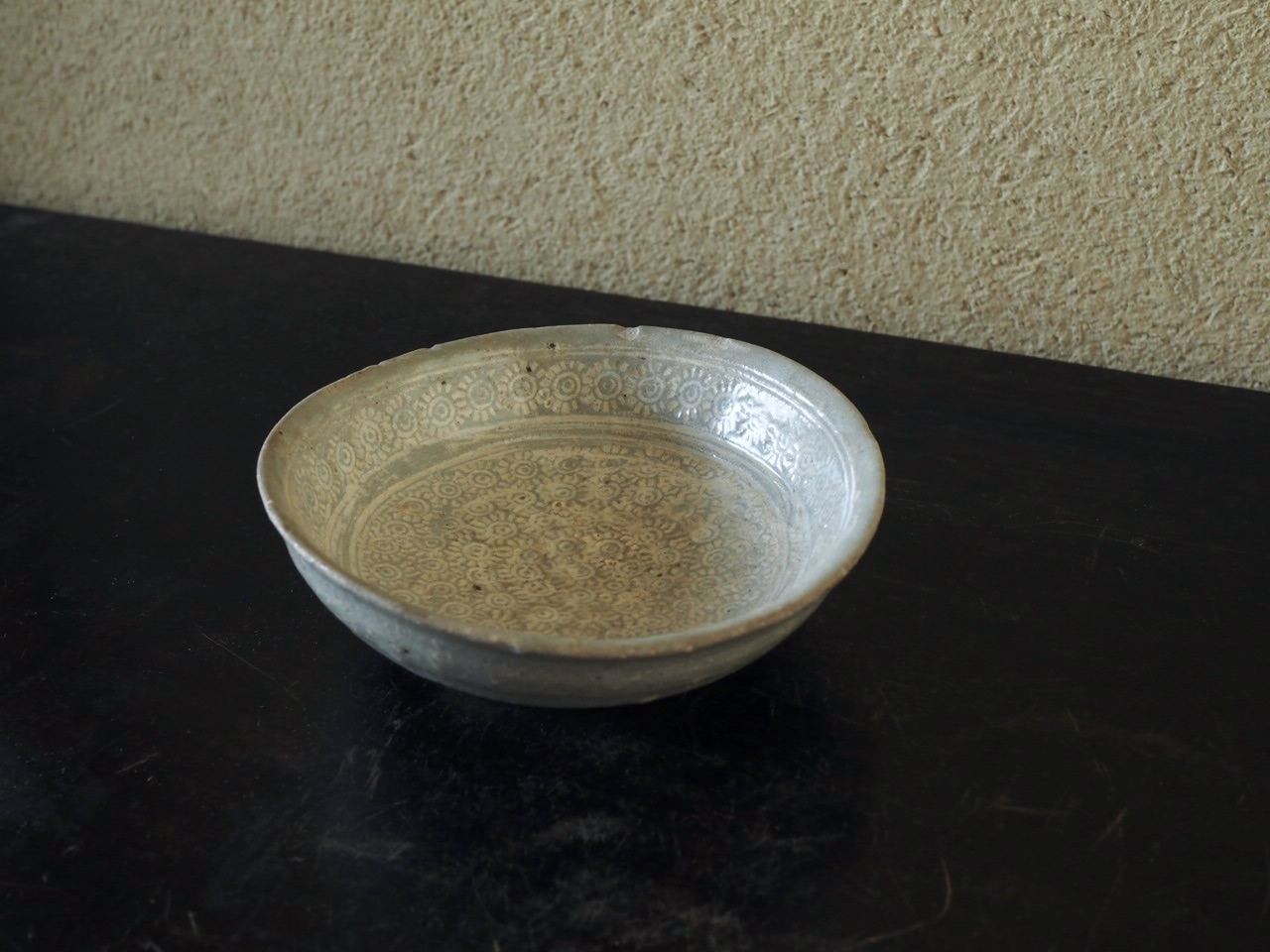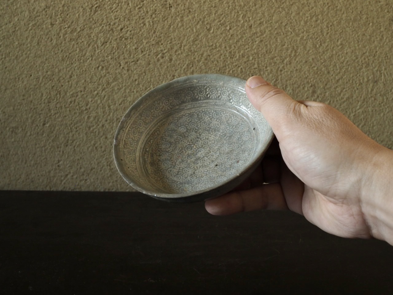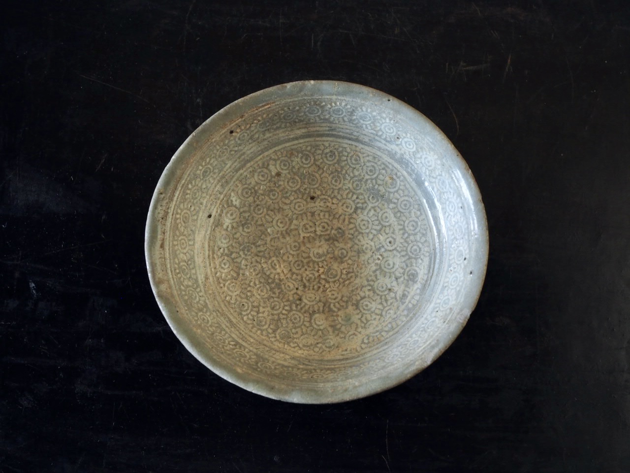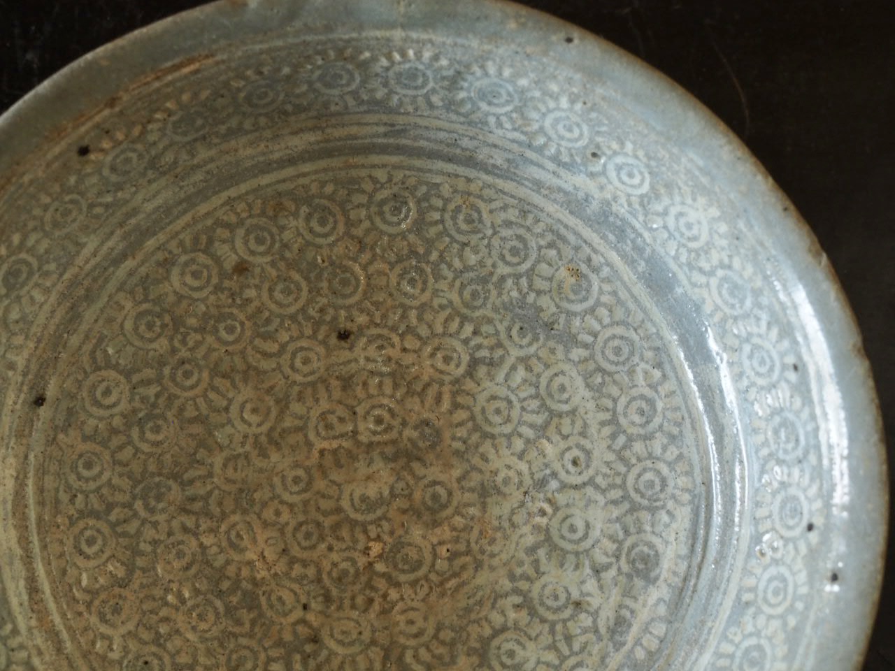 太陽のような印花文で埋め尽くされた様子がとても可愛らしい小皿で、地味ですが