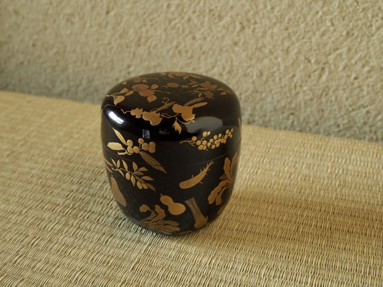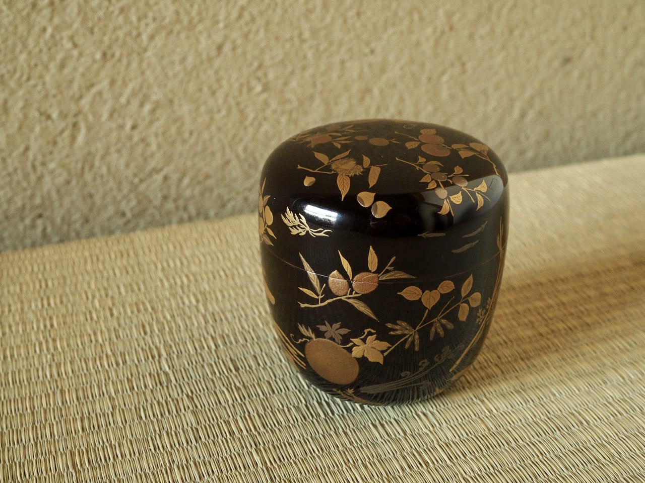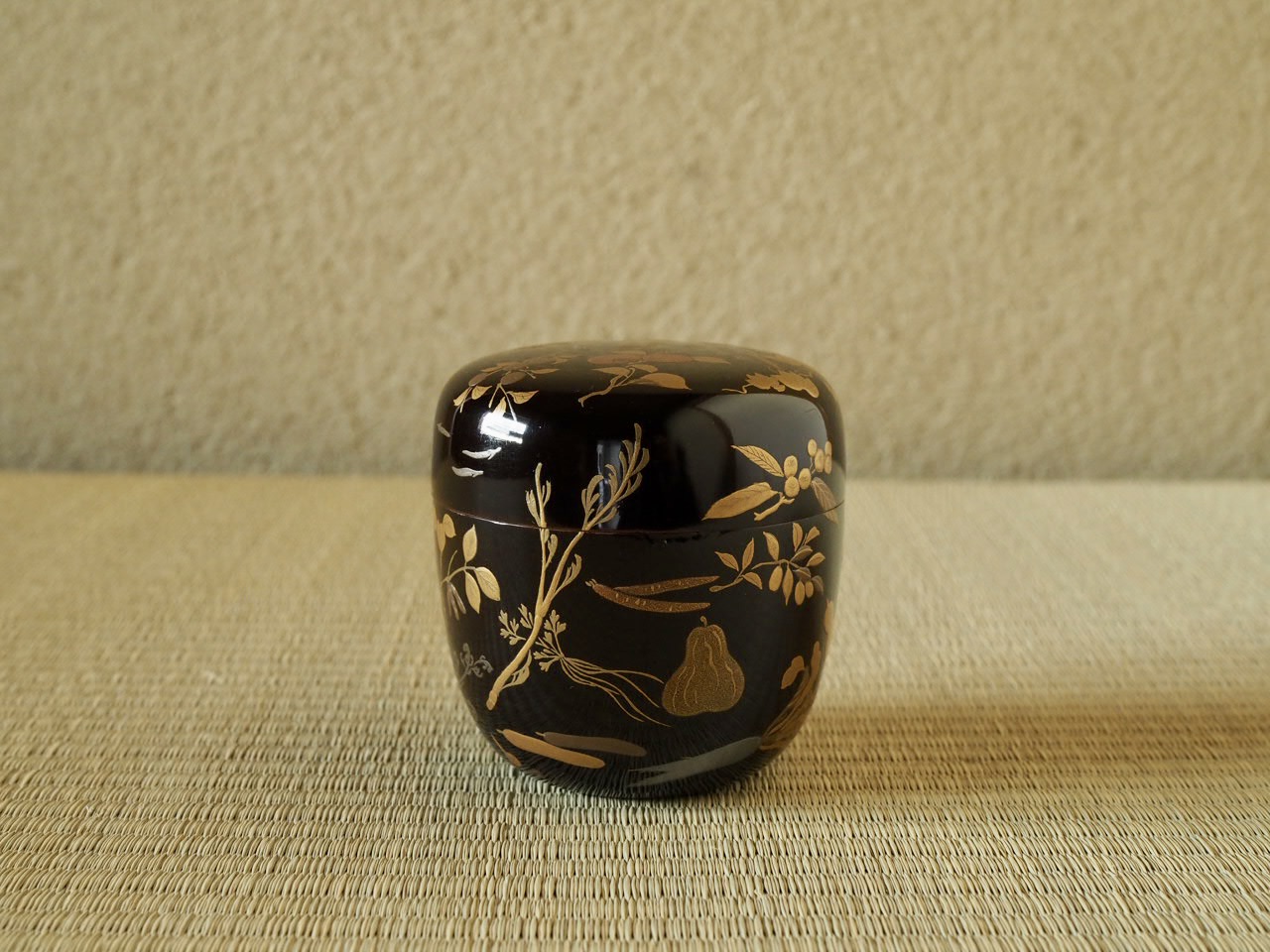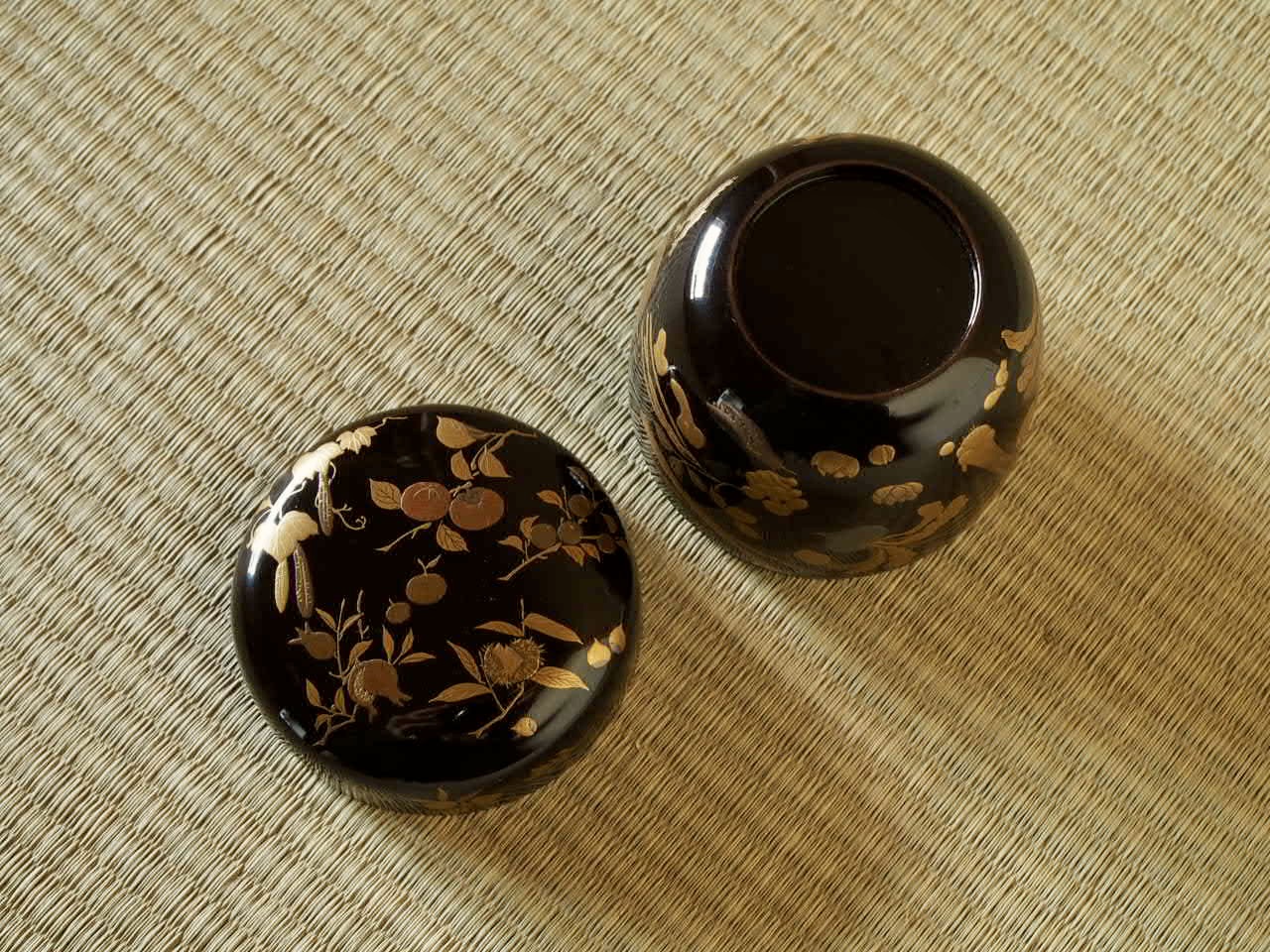 帯びた優しい姿にやや透けて赤味を帯びた黒漆、豊穣を現す上品な蒔絵が賑やかで愉しいです。