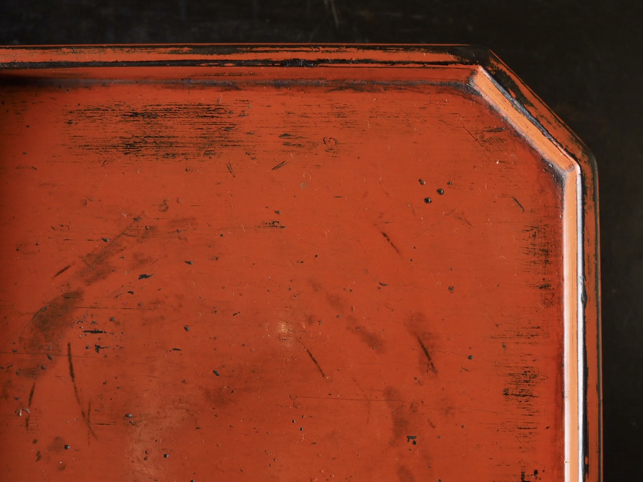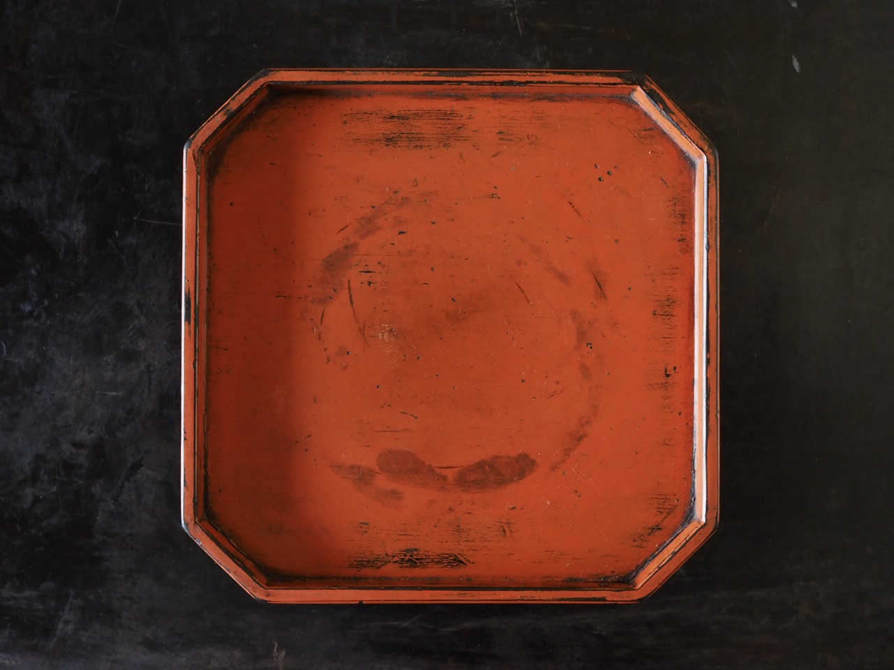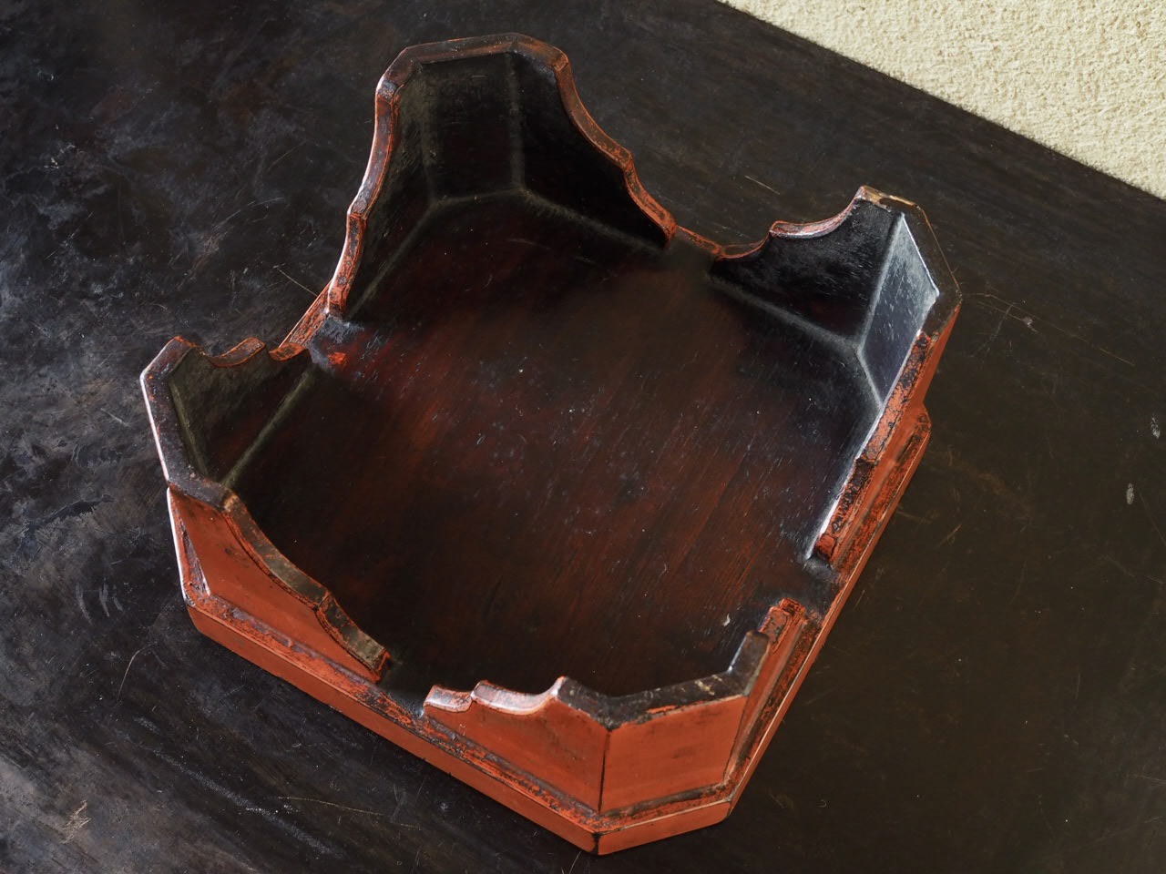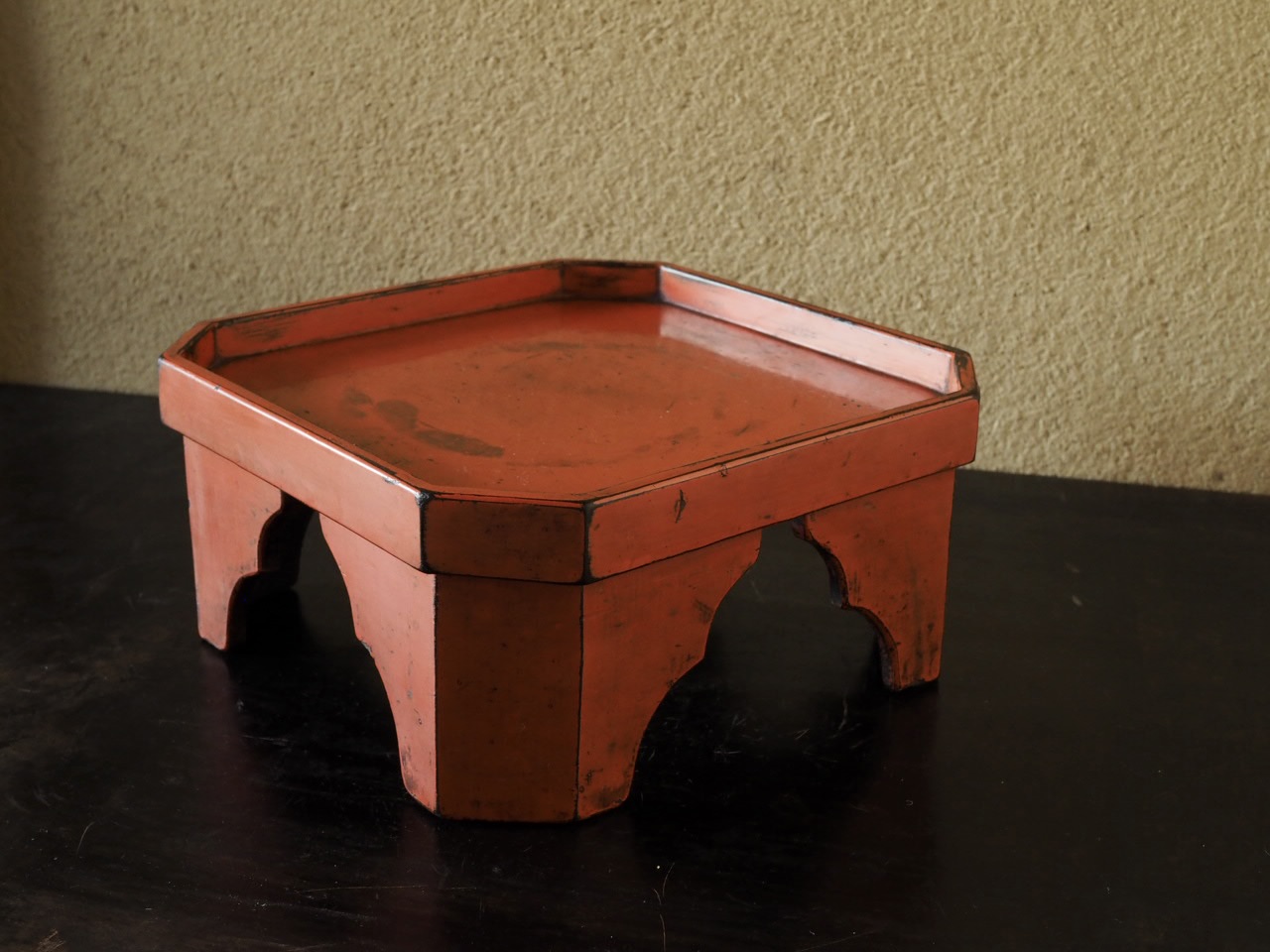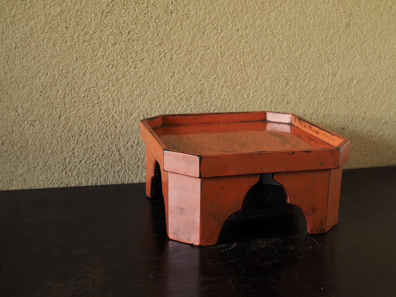 小さな折敷に高脚が付いた、あまり類を見ない姿の根来塗で、お供えの為の什器では