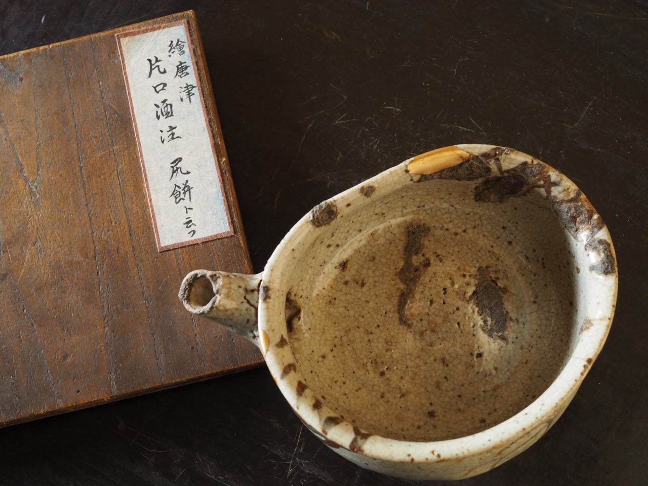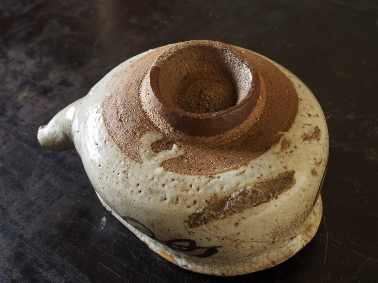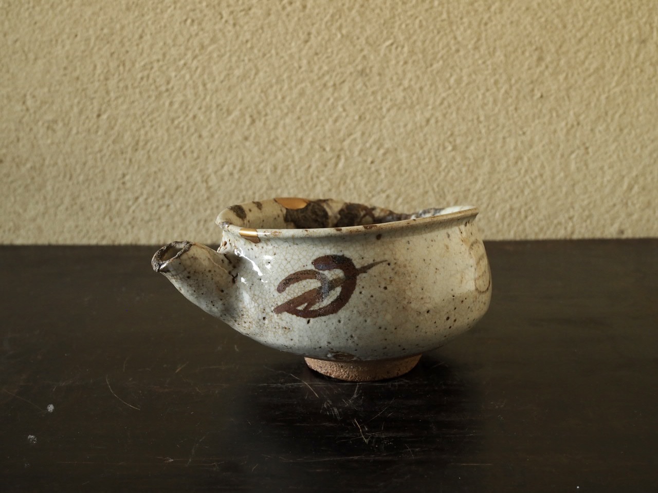 銘「尻餅」と名付けられた発掘伝世の片口で、歪んで腰を落としたような姿と