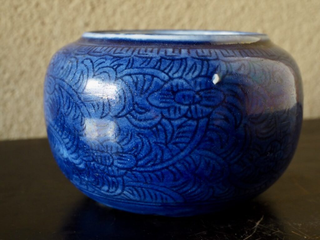 高麗青磁にその姿を確認できます。濁りのない瑠璃釉は濃厚で、花唐草文が丁寧に細密に