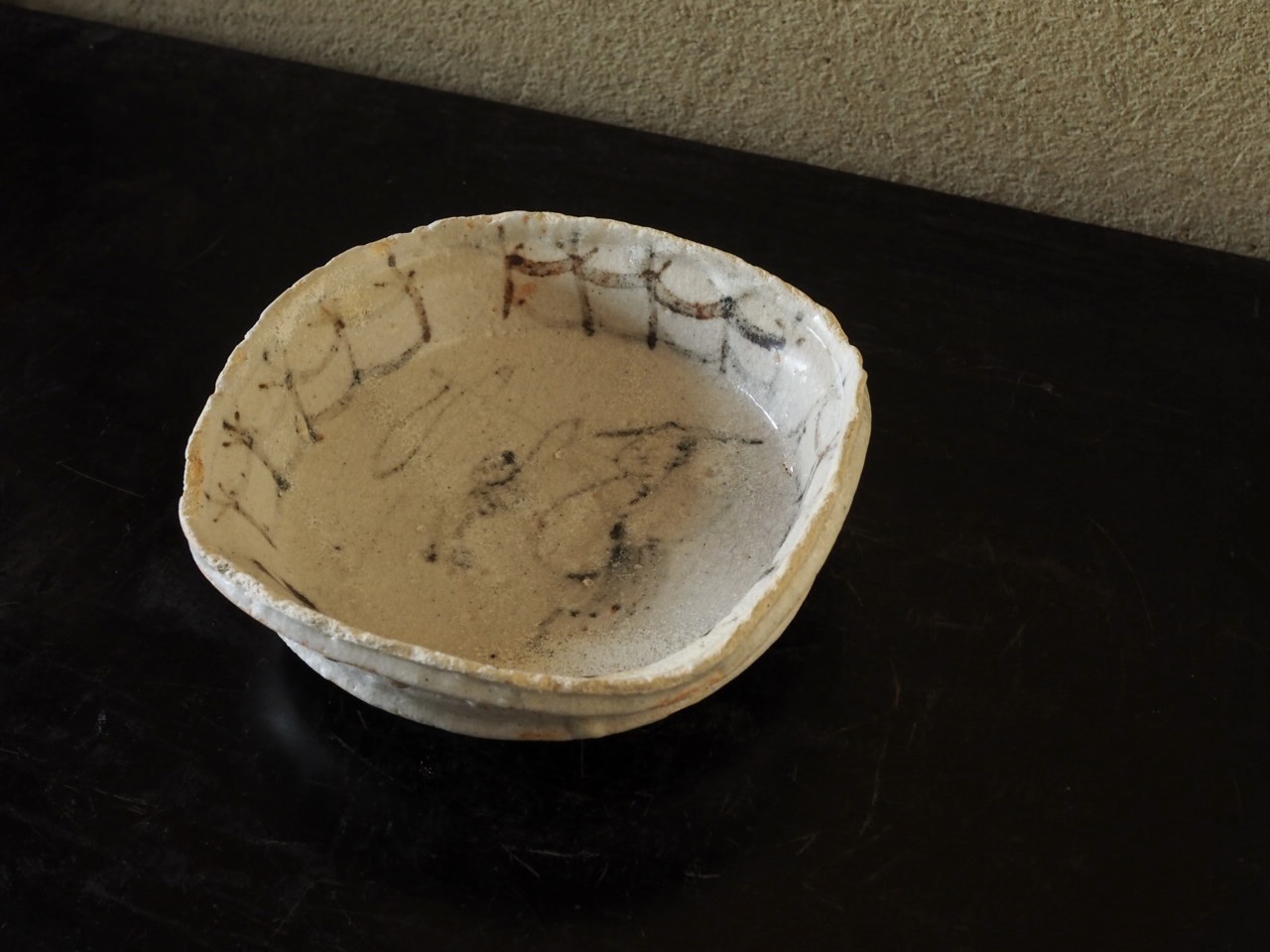 志野向付で、長石釉の瑞々しい質感や茶味を感じさせる擂座、そして伸びやかな筆致による