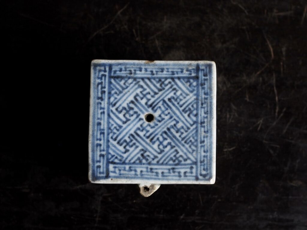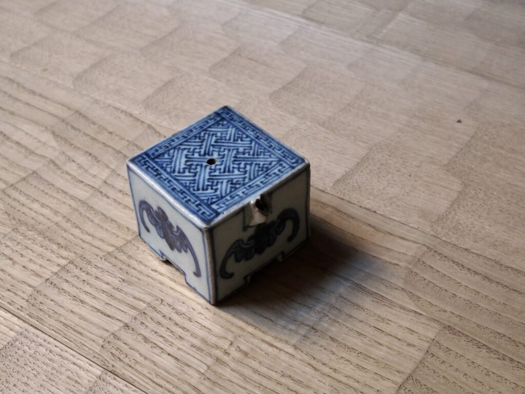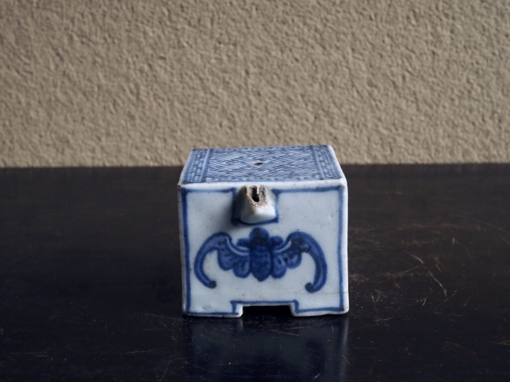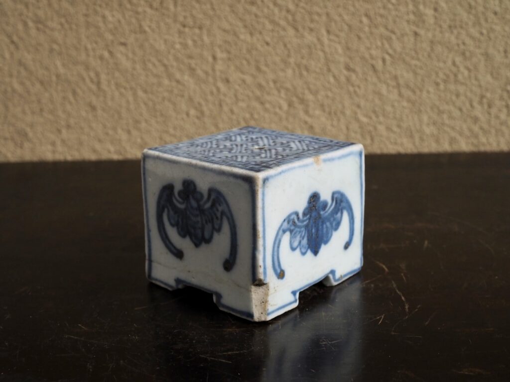 李朝染付水滴 2026 1/05 2025年12月8日 天面の彩綾形文と側面の蝙蝠文の組み合わせが珍しいです。 分院の爽やかなあがりと正方体に近い姿の潔さよ。 長さ6.2×6.3㎝ 高さ5.3㎝ 朝鮮後期 欠け3ヶ所 箱無し 詳細、価格はお問い合わせください。 文房具 李朝