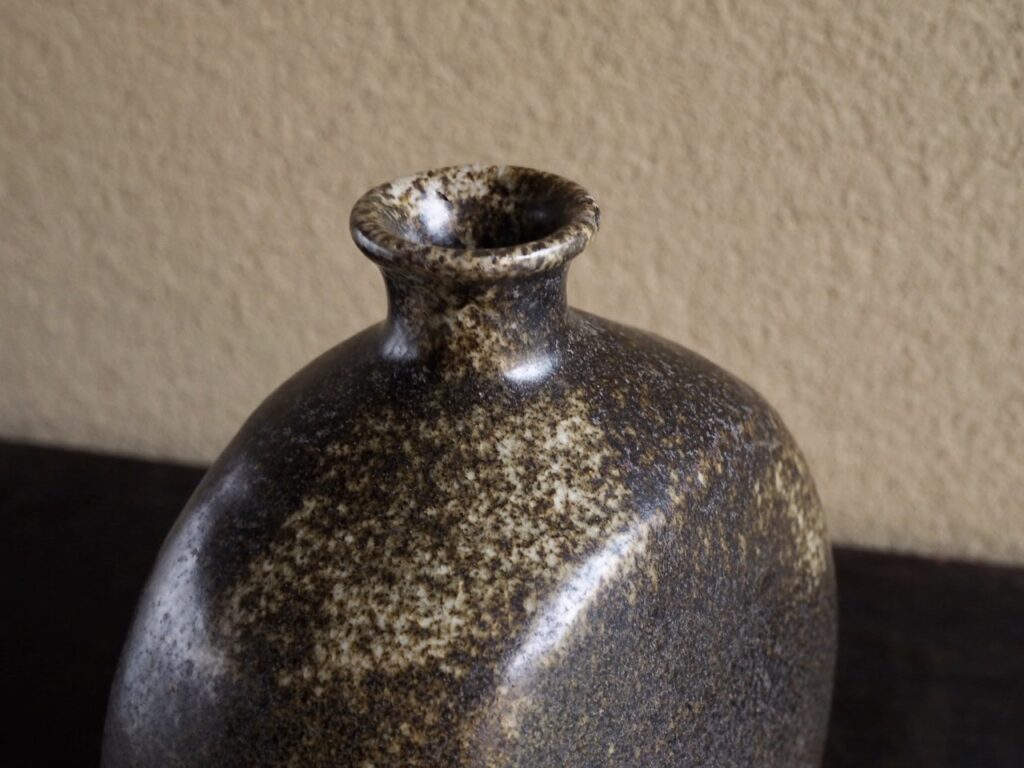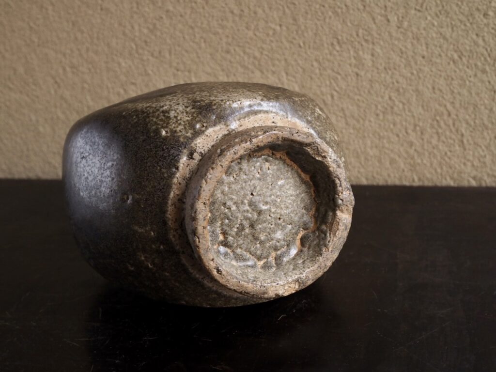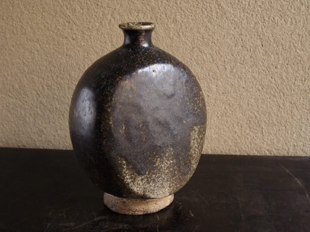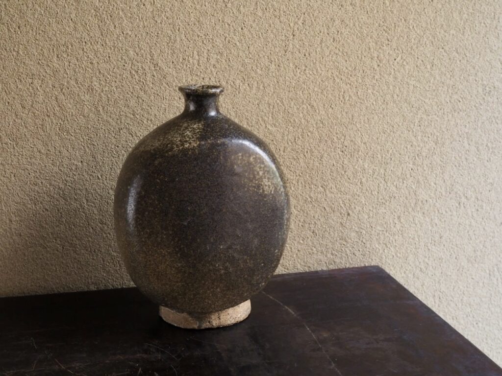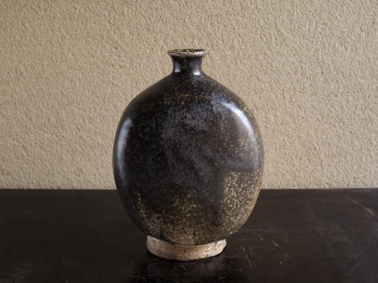 黒高麗扁壺 2026 1/05 2025年12月20日 二重掛けの黒釉は処どころ白くマダラに変色して独特の景色を見せ、 朝鮮特有のフォルムは威張らず静かに我々に寄り添うようです。 高さ20.7㎝ 胴径15.5×11.5㎝ 口径3.8㎝ 朝鮮初期 口半分程度修理 桐箱付 詳細、価格はお問い合わせください。 李朝
