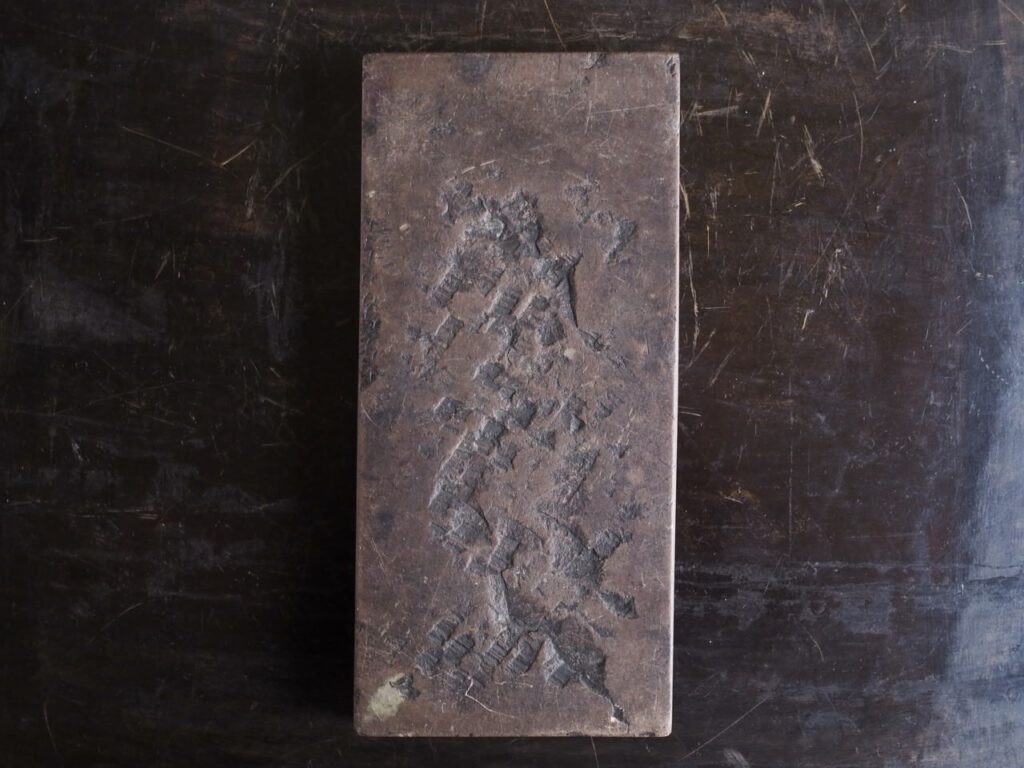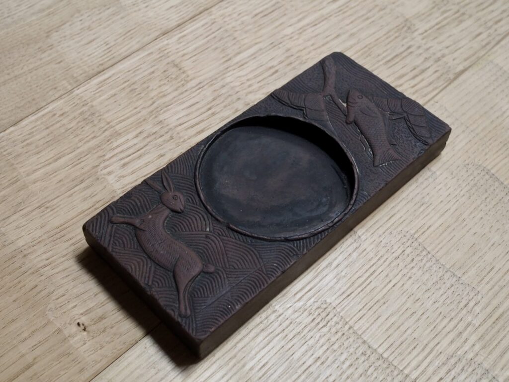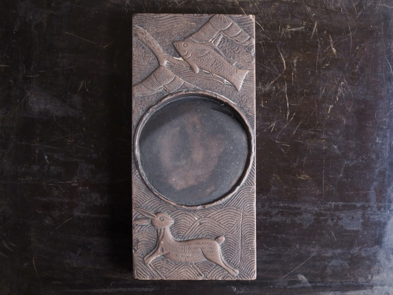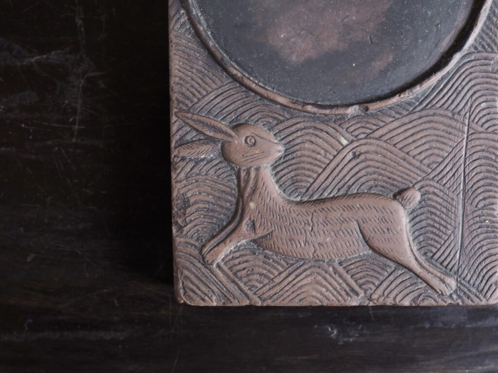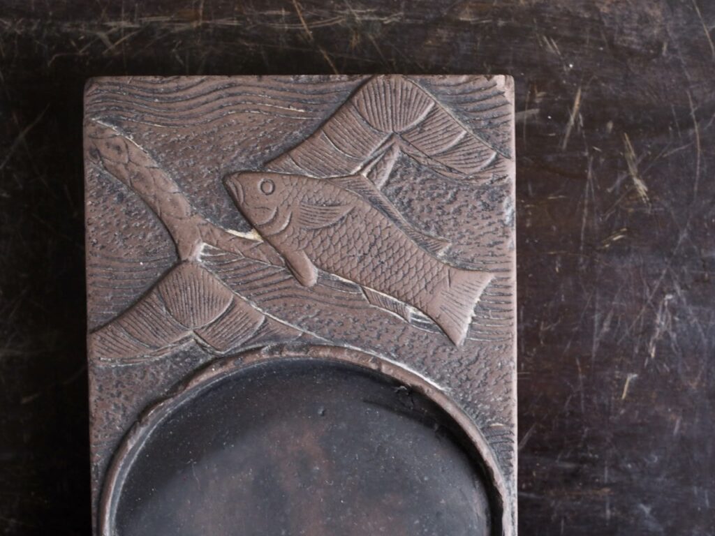 李朝硯 2026 1/05 2025年12月20日 渭原石という暗紫の石を彫った日月硯。民画の世界から 飛び出したような松に魚と波兎の図が可愛く癒されます。 長さ18.5×8.6㎝ 高さ1.8㎝ 朝鮮後期 箱無し 詳細、価格はお問い合わせください。 文房具 李朝 民藝