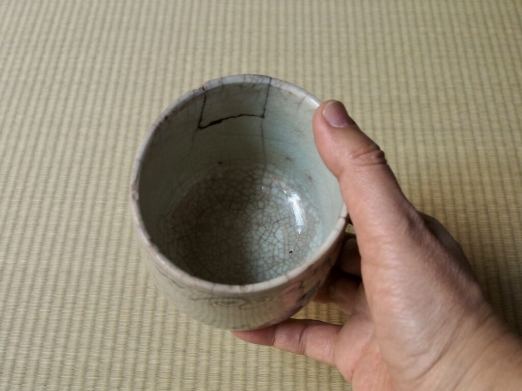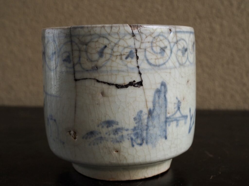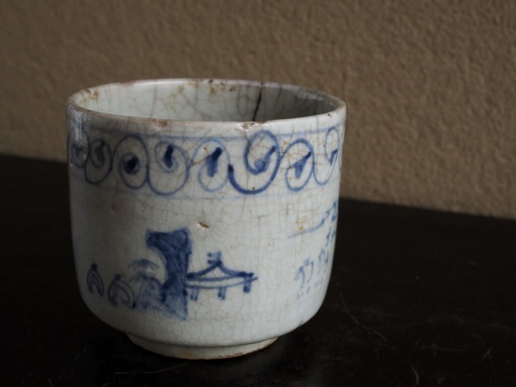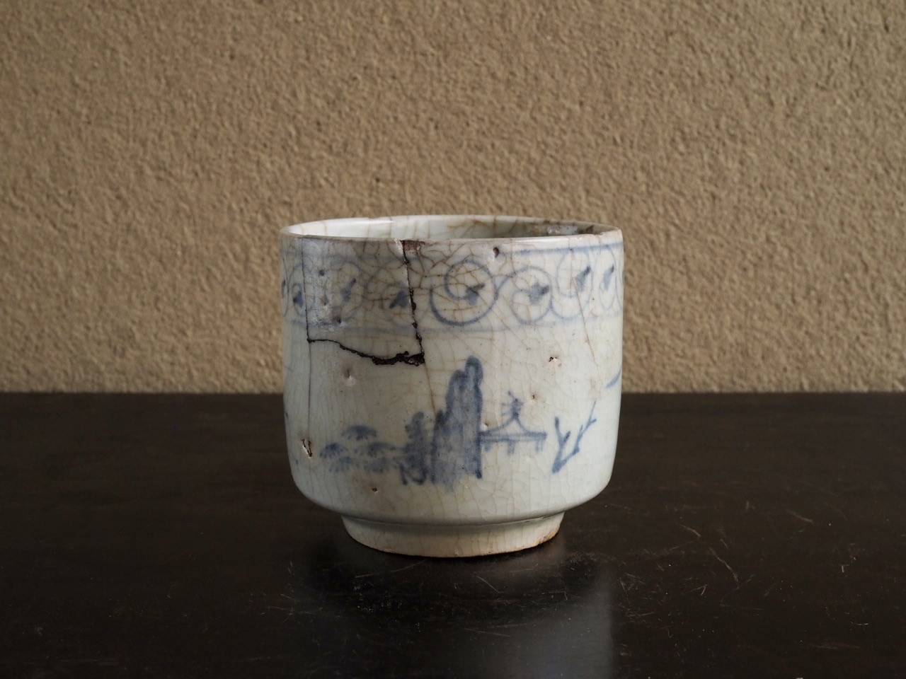 初期伊万里筒茶碗 2026 1/05 2025年12月20日 甘手で大傷ではありますが、それ故の軟らかな肌合いや 力の抜けた画に茶味が感じられます。 口径9.0×9.5㎝ 高さ8.8㎝ 江戸初期 口修理 時代箱 詳細、価格はお問い合わせください。 古陶磁 茶道具