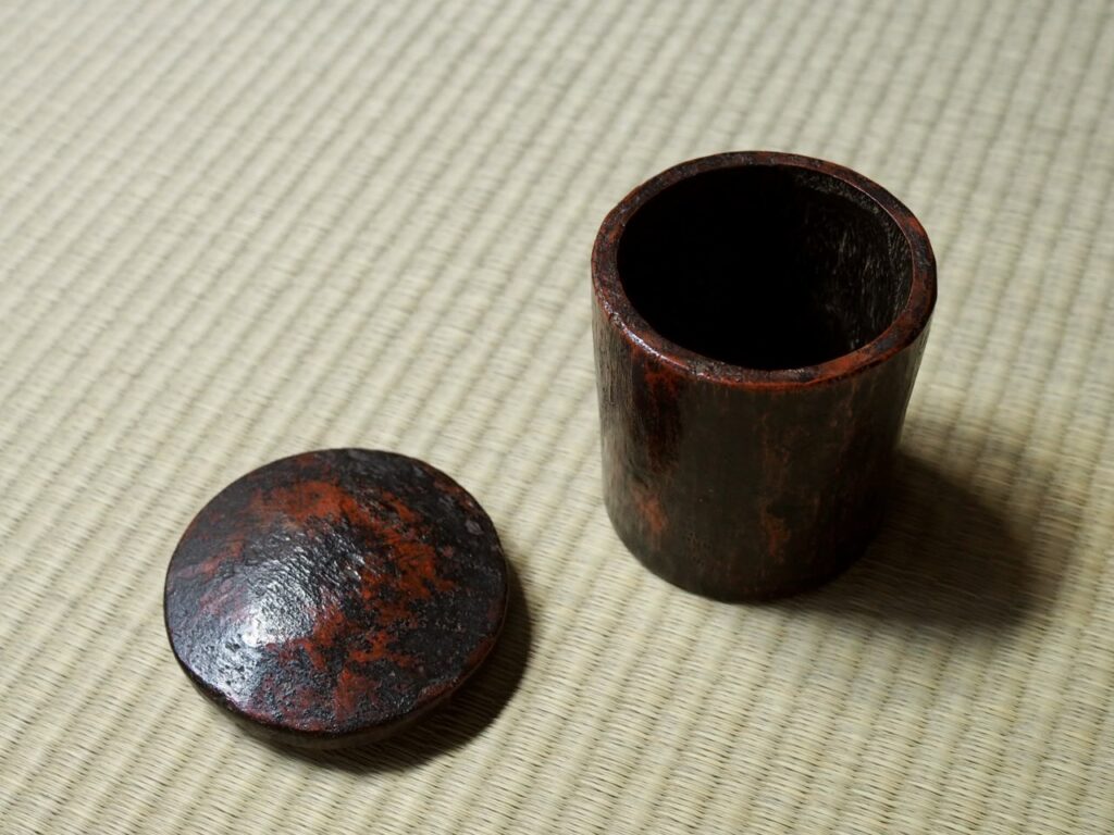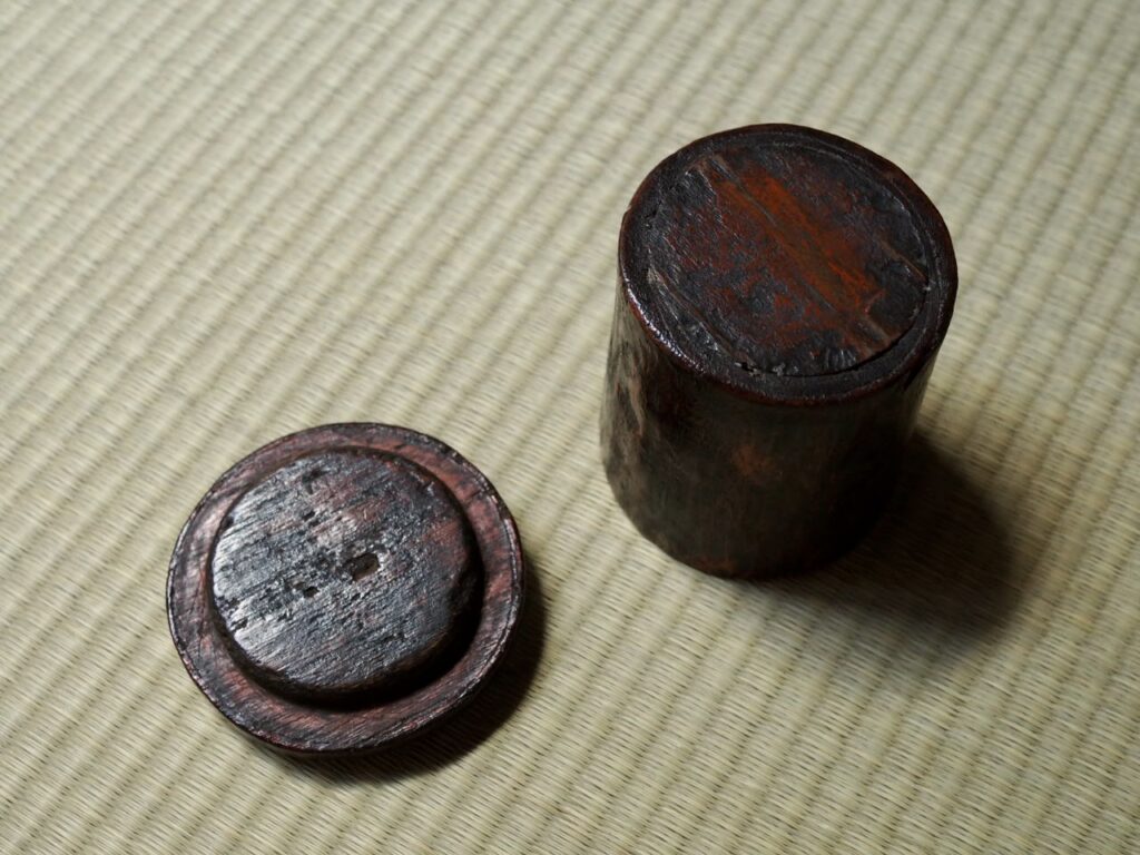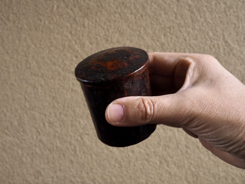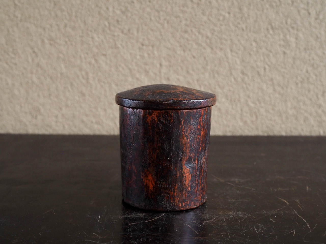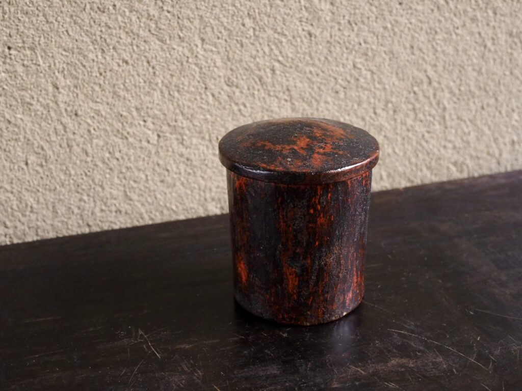 朱塗薬器 2026 1/05 2025年12月20日 桐製の薬器で、枯れた肌、ゴリッとした削り跡、根来のような朱と黒が織りなす 景色が殊の外美しいです。手取りは軽く、その古格のある存在感に惹かれます。 高さ7.3㎝ 胴径5.7㎝ 蓋径6.0㎝ 桃山時代 仕覆時代箱 詳細、価格はお問い合わせください。 漆器 茶道具