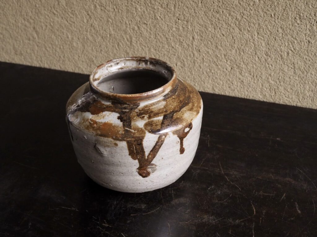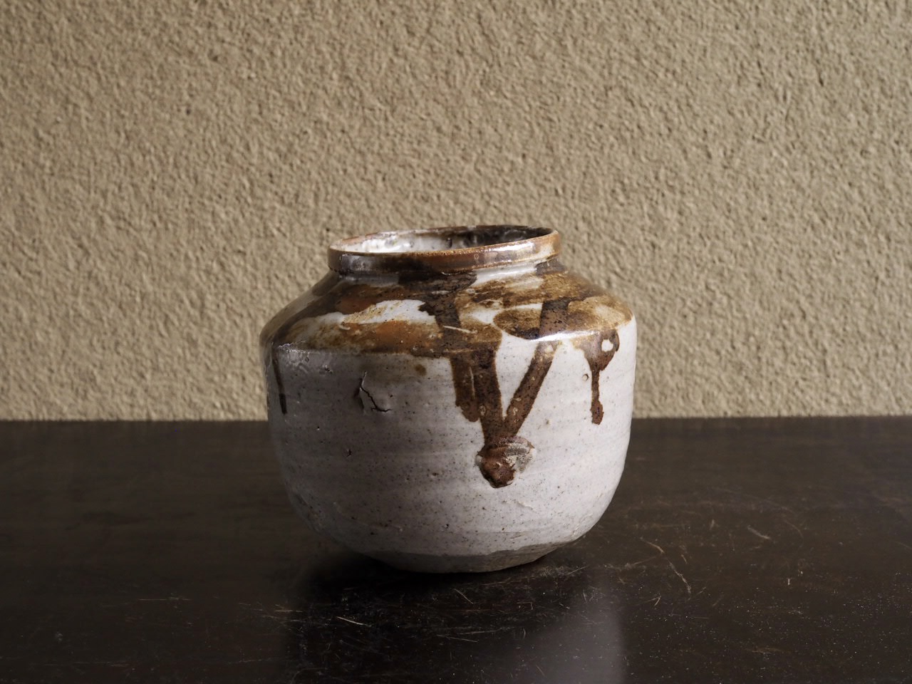 李朝鉄砂壺 2026 2/04 2026年2月6日 自由過ぎる鉄砂の筆。コロリとした姿もご愛嬌。 高さ10.0㎝ 胴径11.5㎝ 口径7.0㎝ 朝鮮後期 口に3ヶ所欠け 詳細、価格はお問い合わせください。 入荷/ギャラリー 李朝 民藝