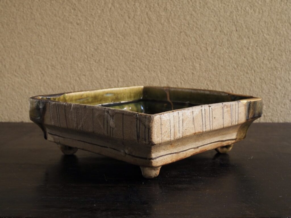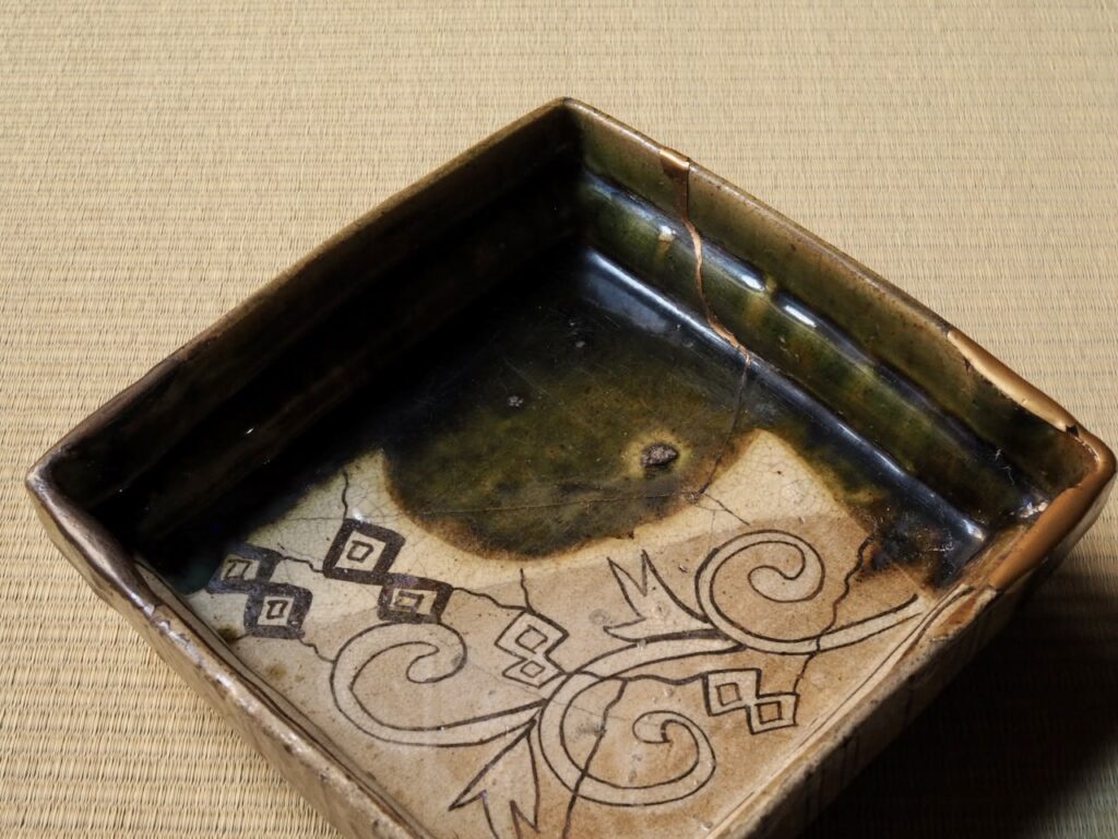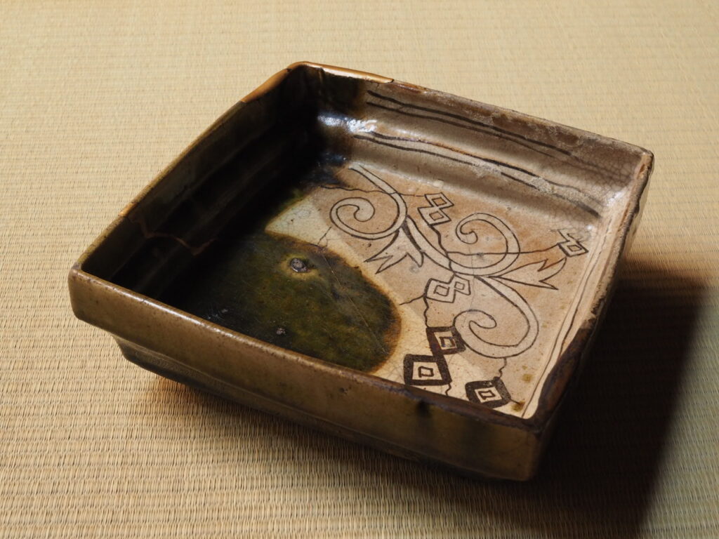 鳴海織部角鉢 2026 2/05 2026年2月6日 手が欠損したとはいえ、その格の高さ、豪快さは失われず。 長さ20.5×20.7㎝ 高さ6.8〜7.3㎝ 桃山〜江戸初 金継ぎ漆なおし 時代箱付 詳細、価格はお問い合わせください。 入荷/ギャラリー うつわ 茶道具